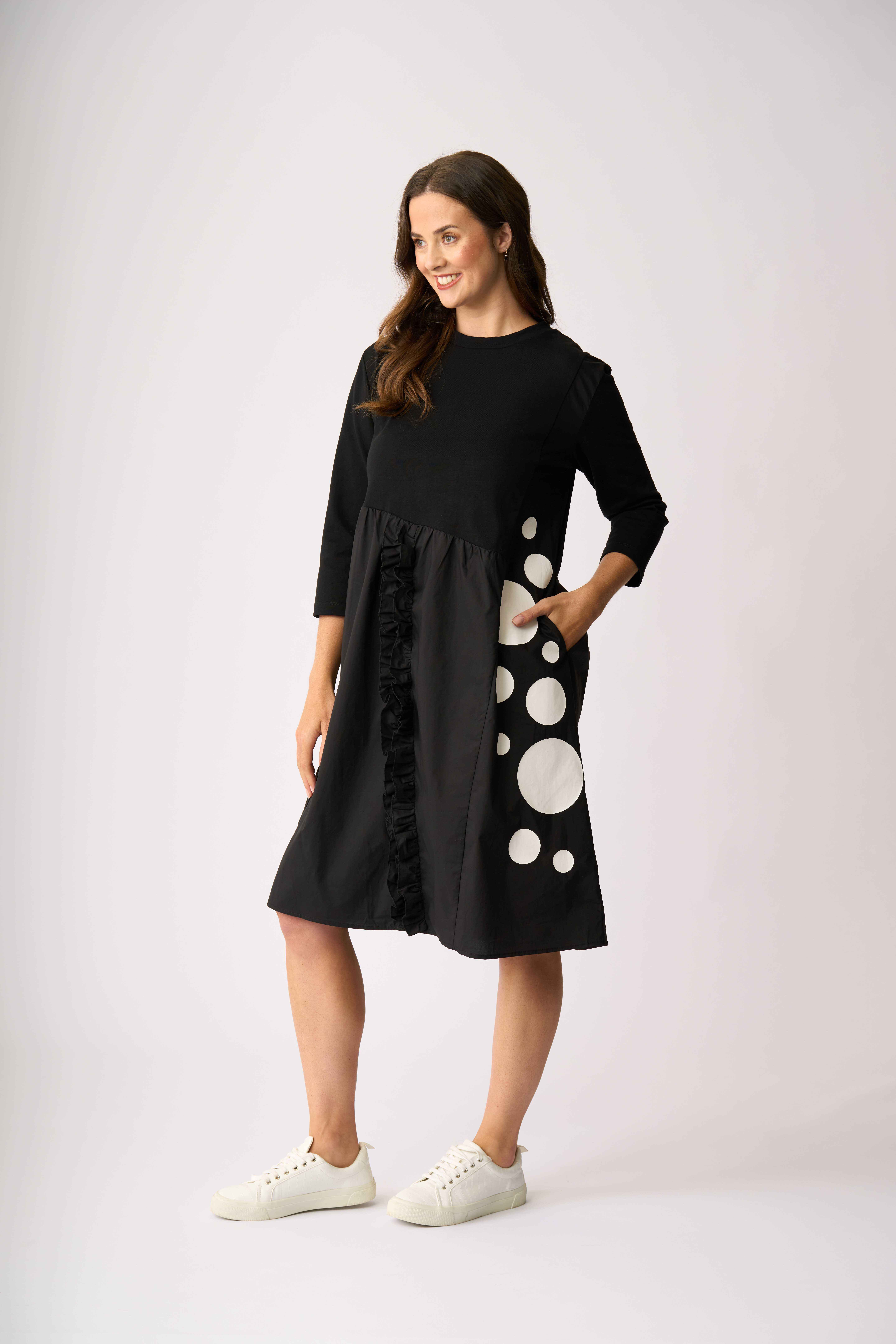 The dress that has it allBoth woven and knit fabric, frills and a spot screen print3/4 sleeves and a relaxed fit through the body