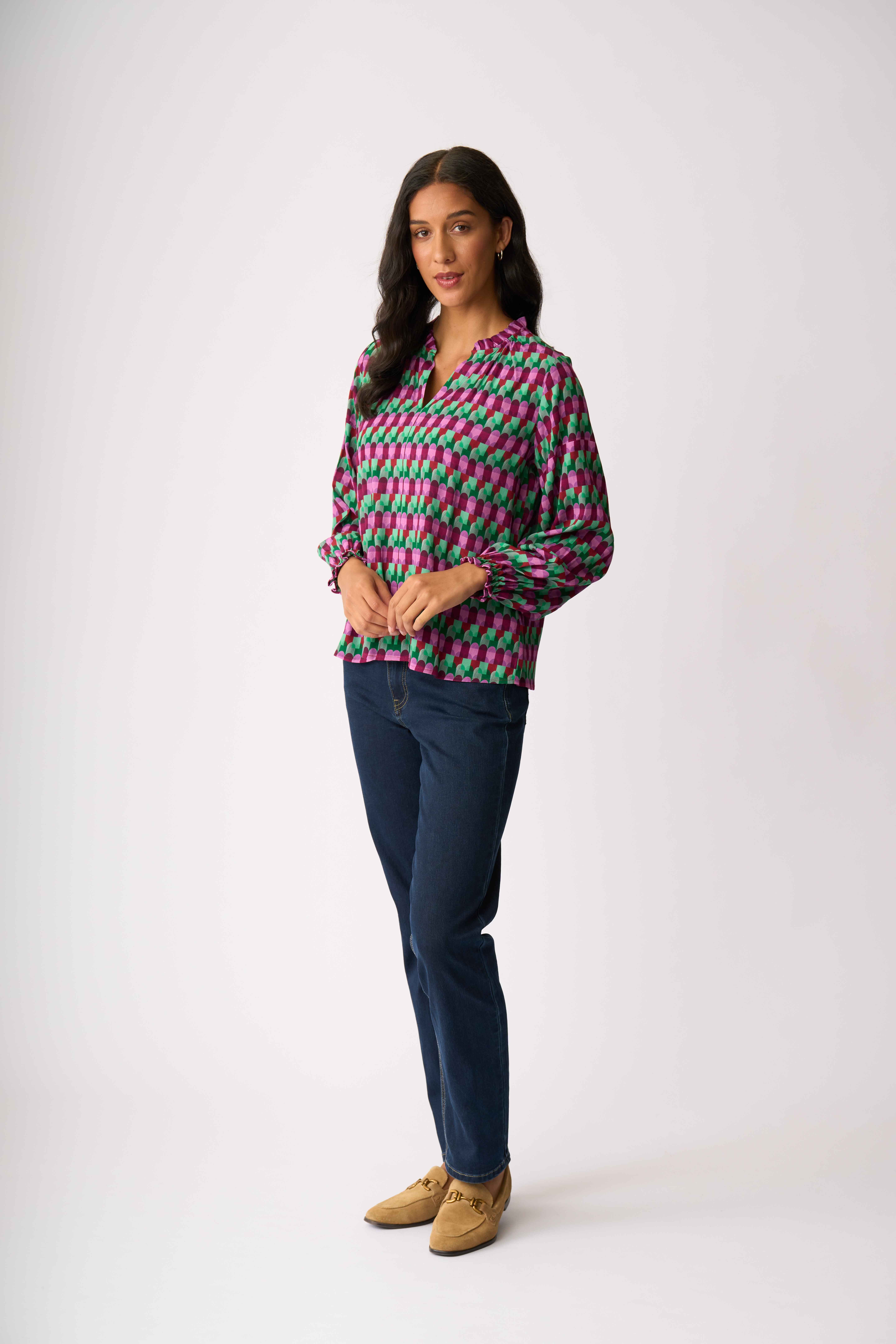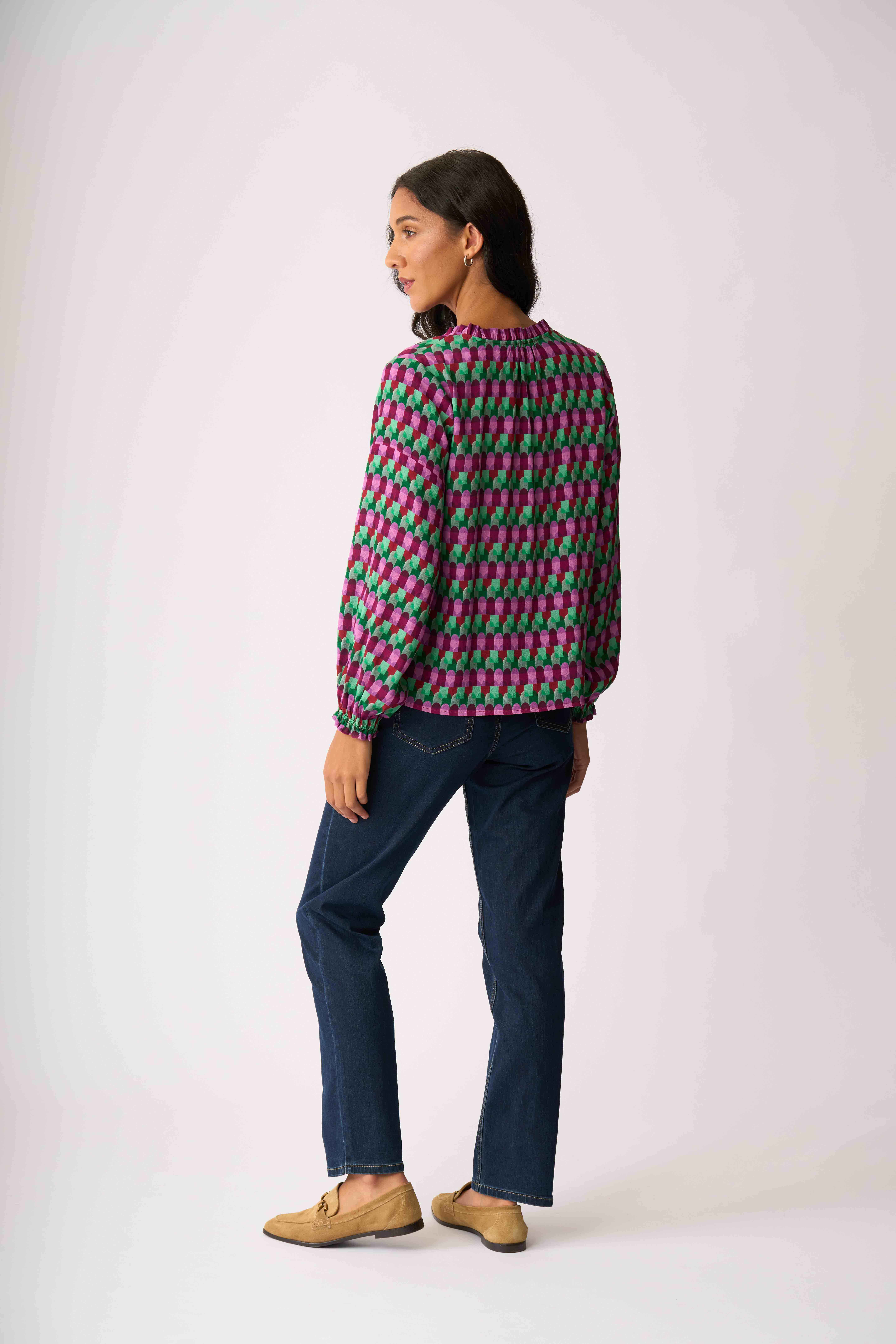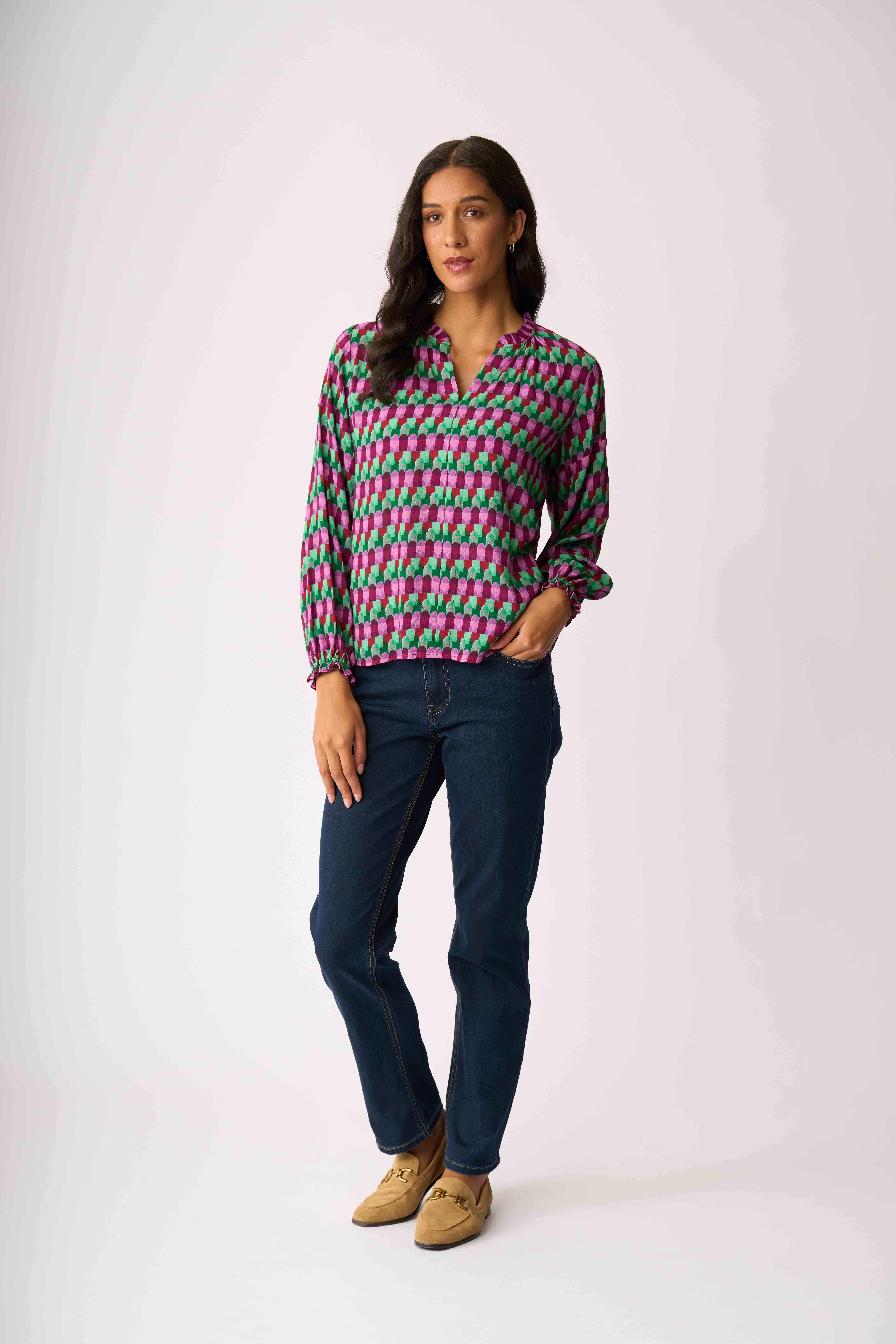 Blouse with neck frillNeckline runs into a V-shapeGathering detail around the centre backFull length sleeve with elasticated cuffsBody length from shoulder to centre front - approx. 62.5cm (size 10)