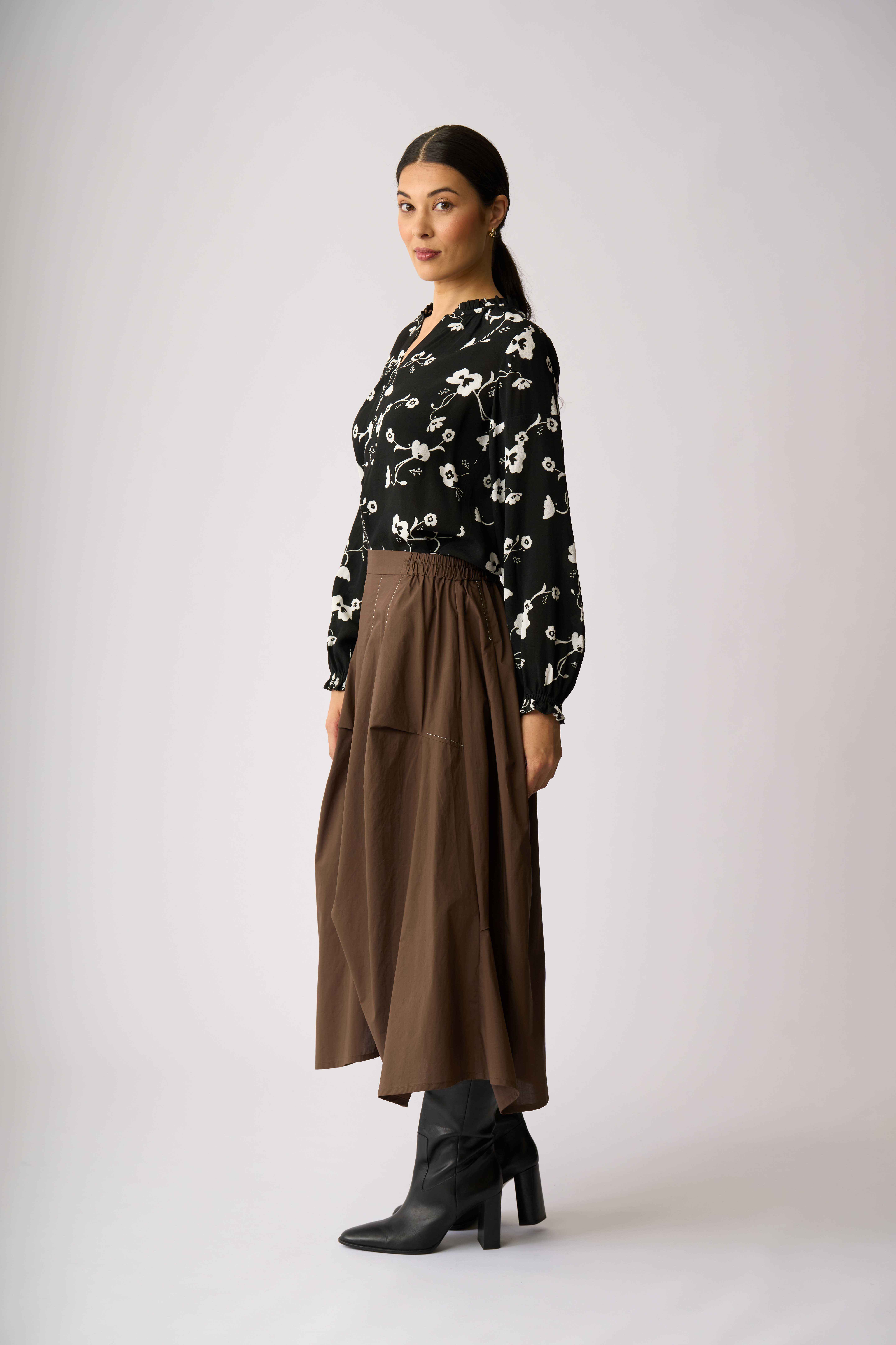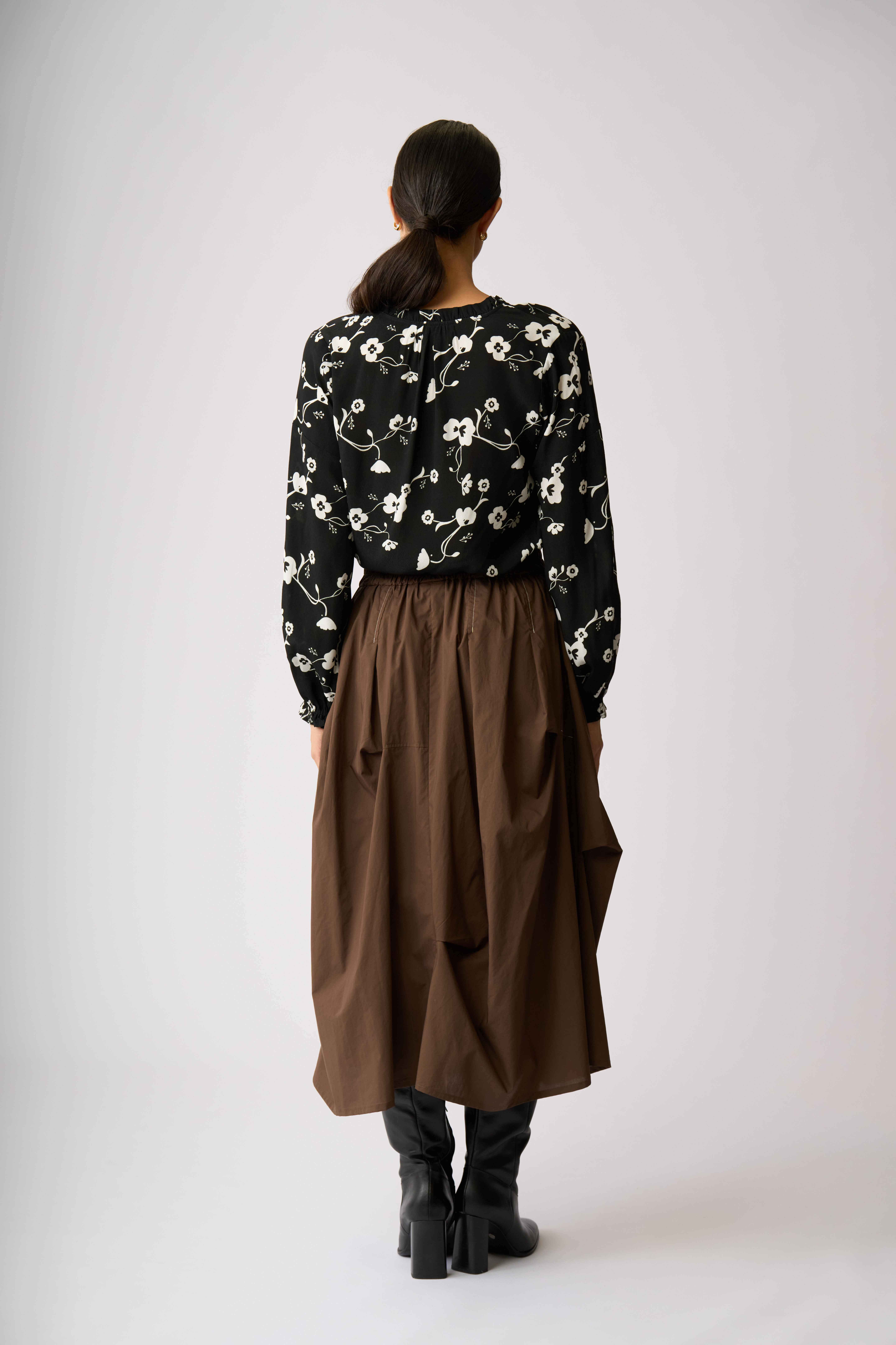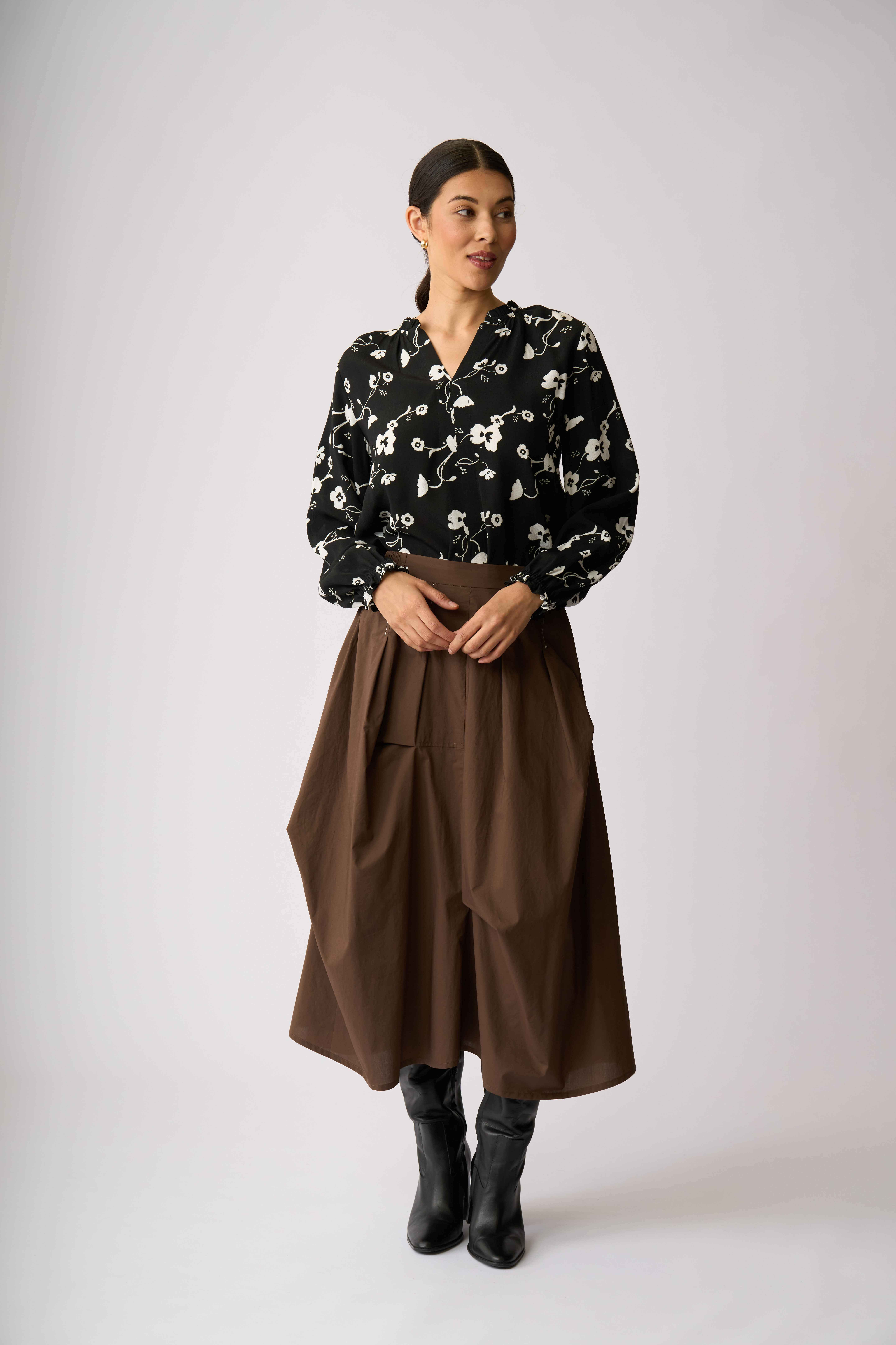 Blouse with neck frillNeckline runs into a V-shapeGathering detail around the centre backFull length sleeve with elasticated cuffsBody length from shoulder to centre front - approx. 62.5cm (size 10)