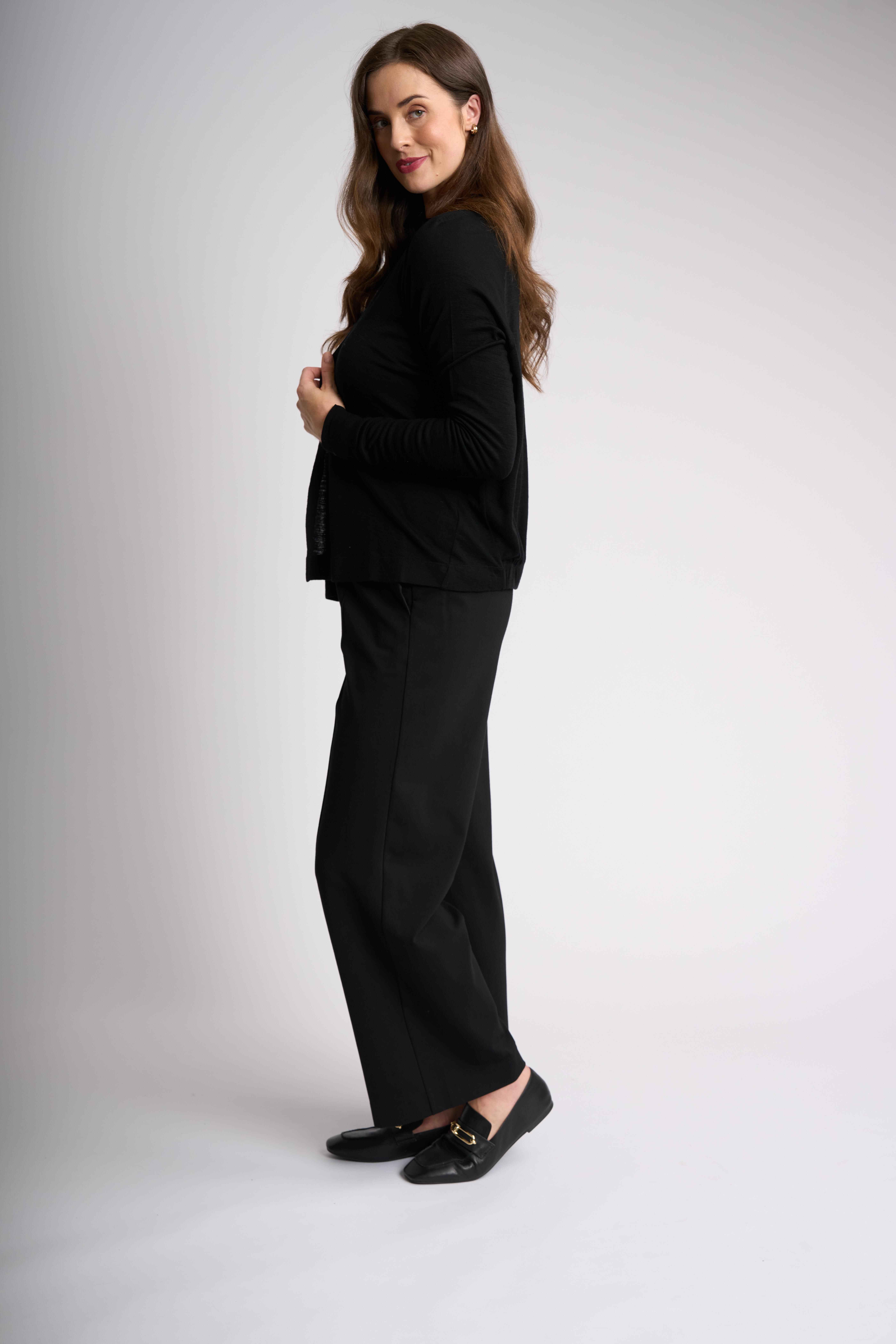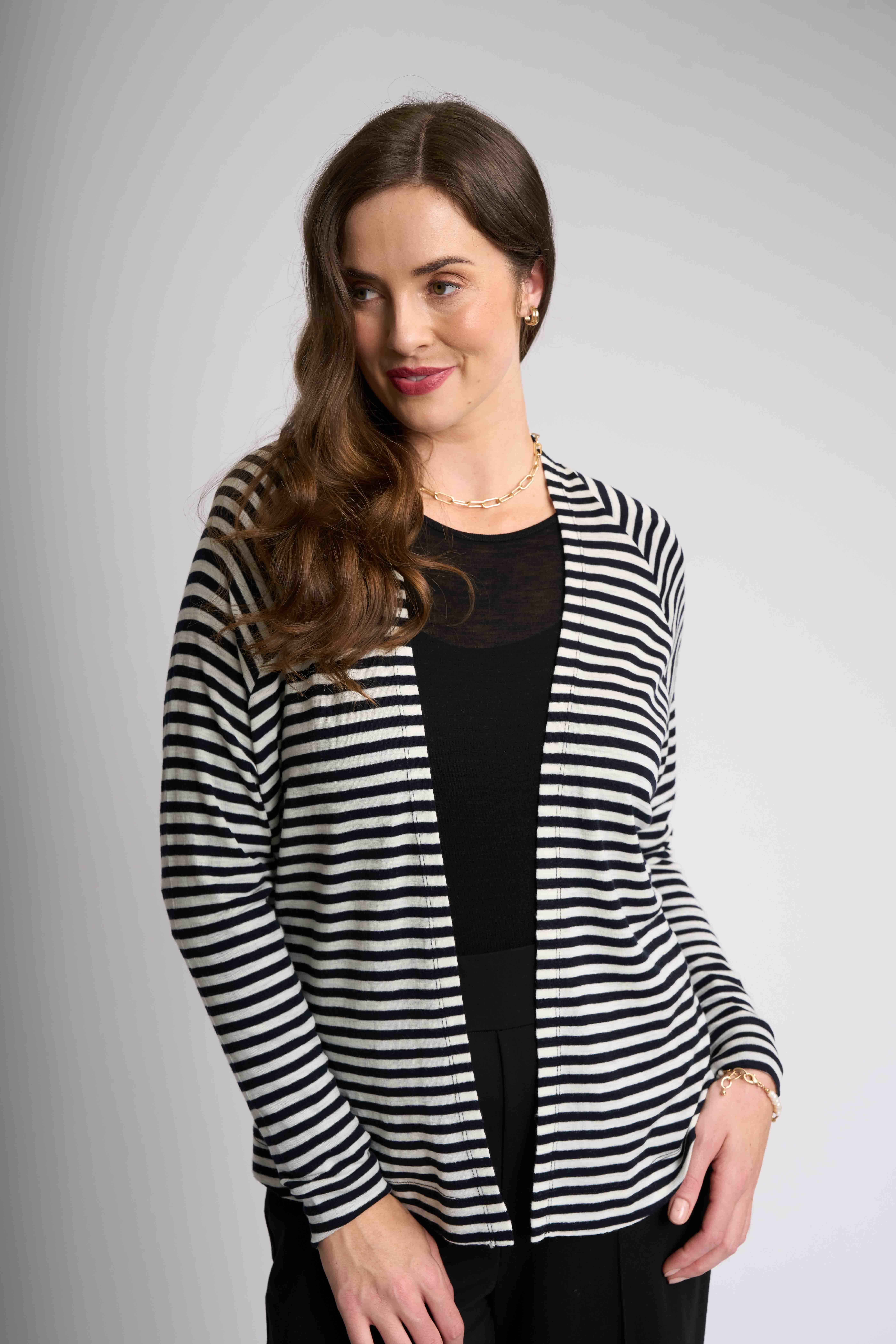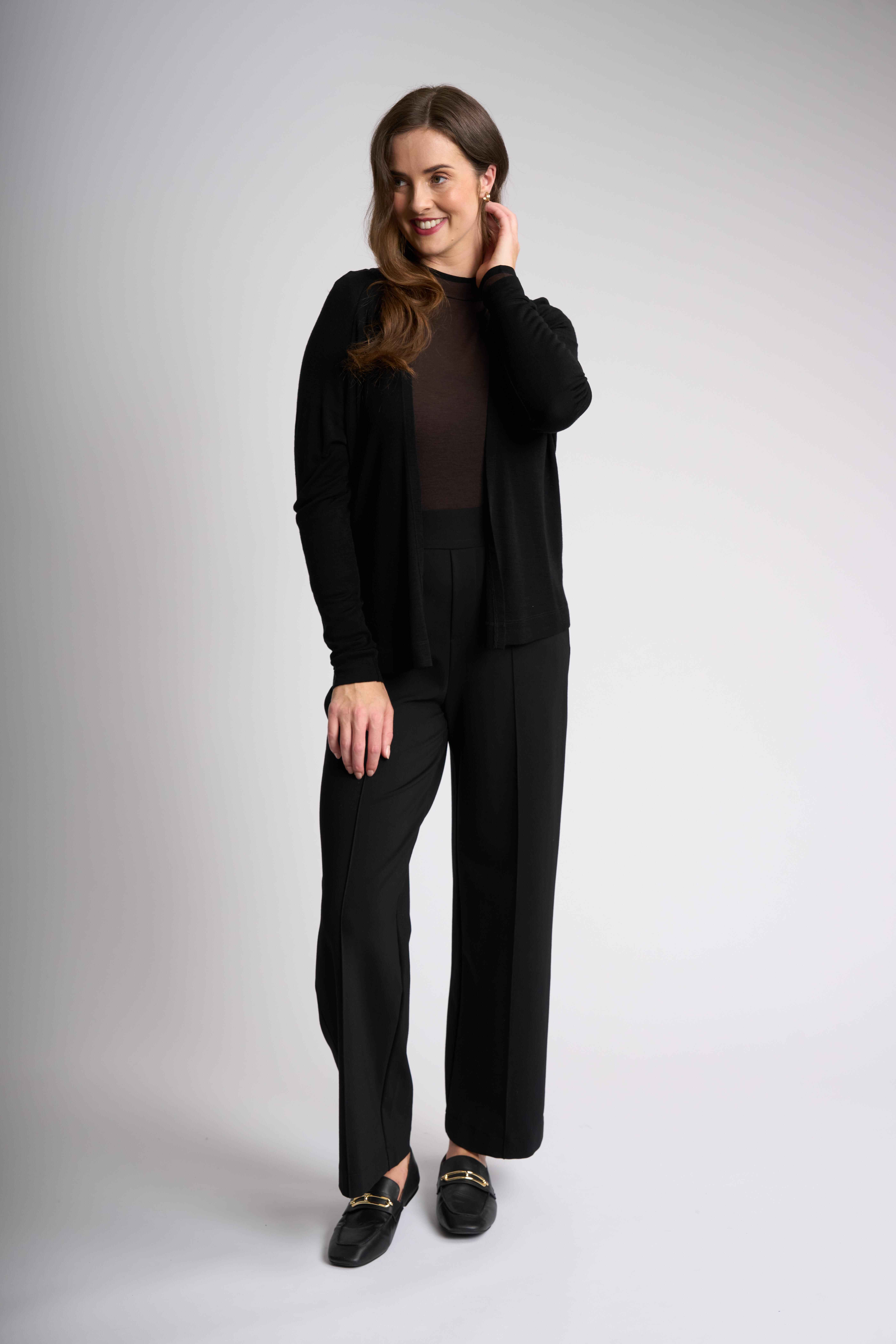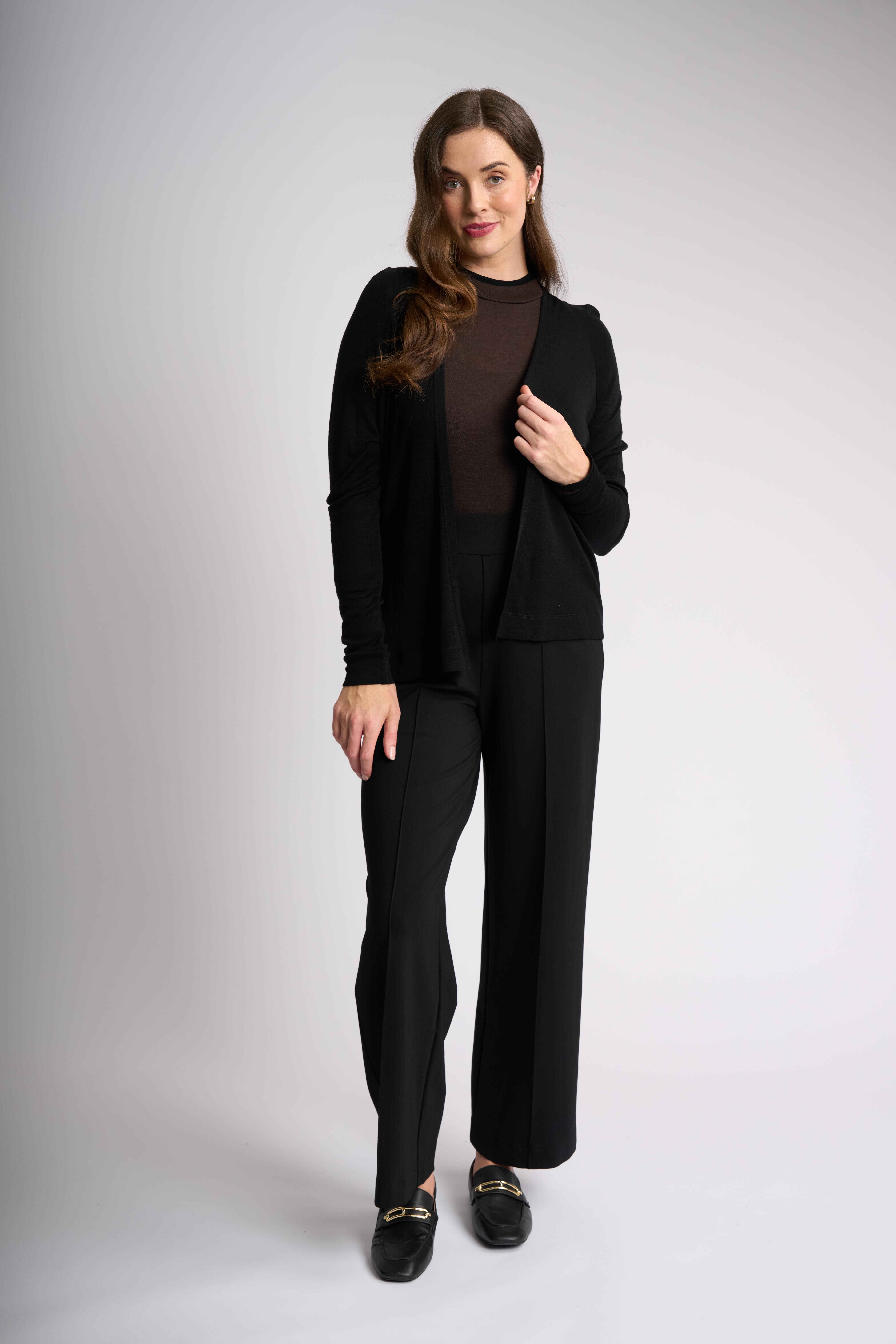 Our open cardigan, crafted from mercerised merino wool is a must have for your collection. Featuring unique gathering details at the back, long sleeves and a flattering body length of approximately 59.5cm (size small). Embrace this effortless style and cozy vibes.