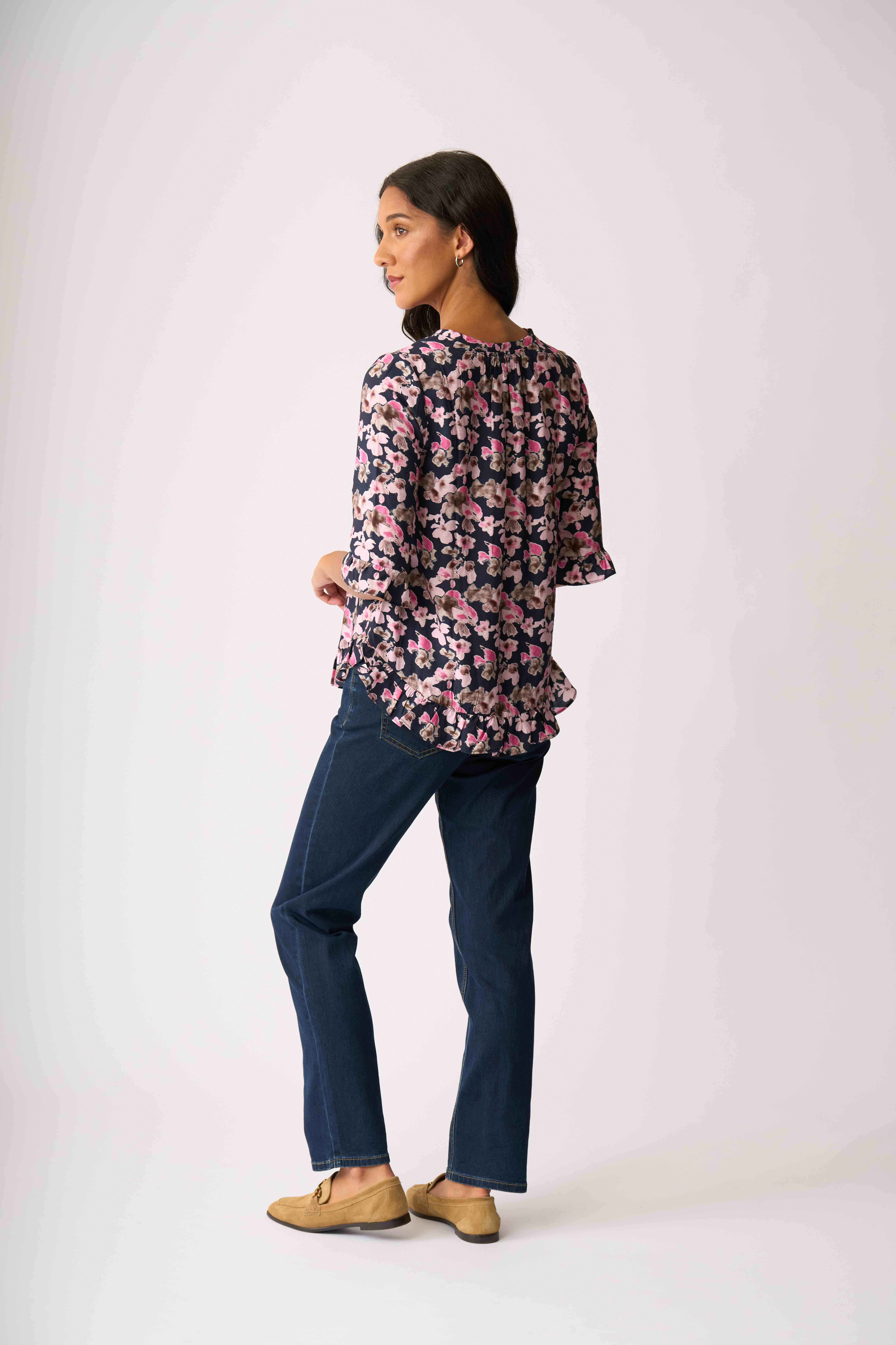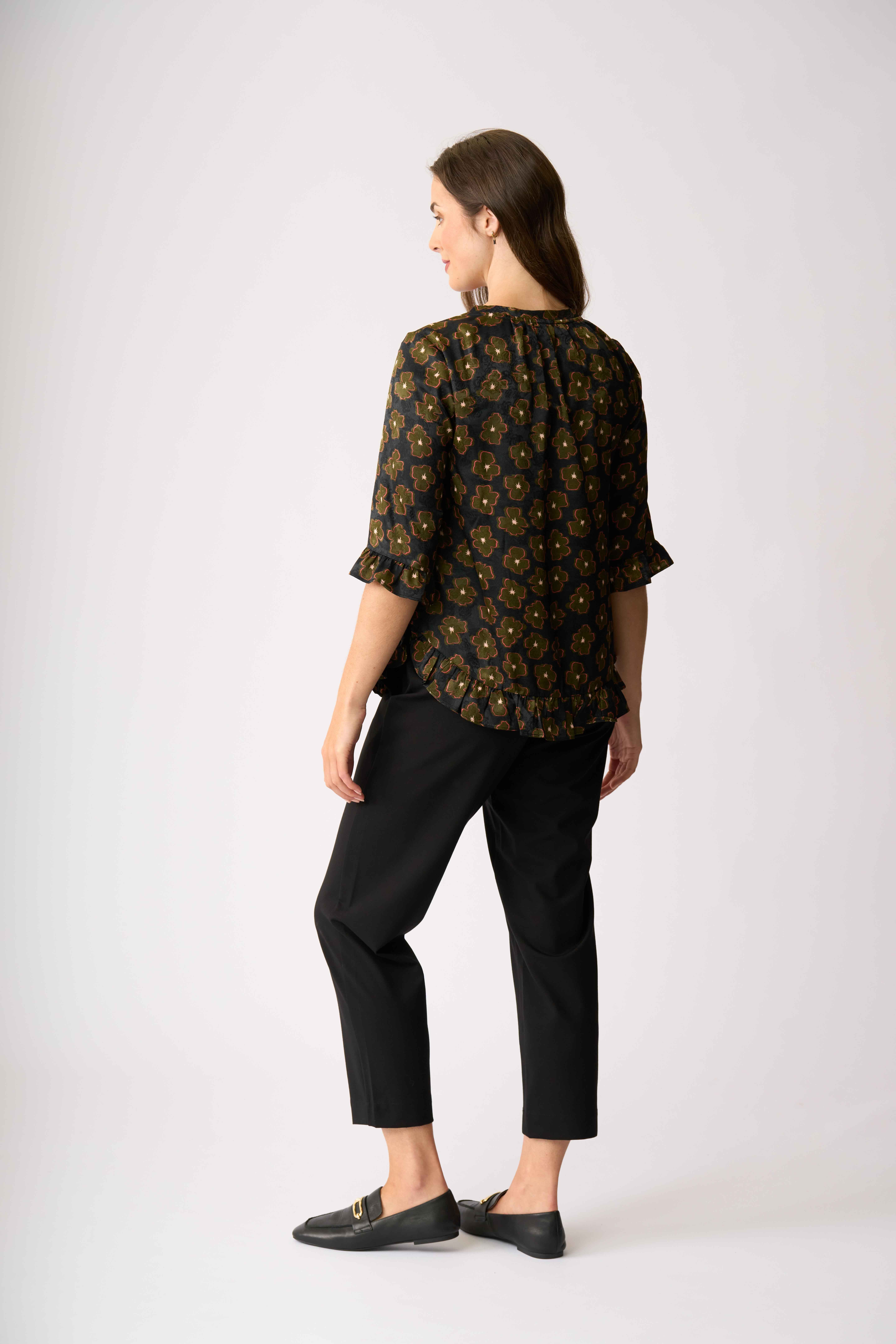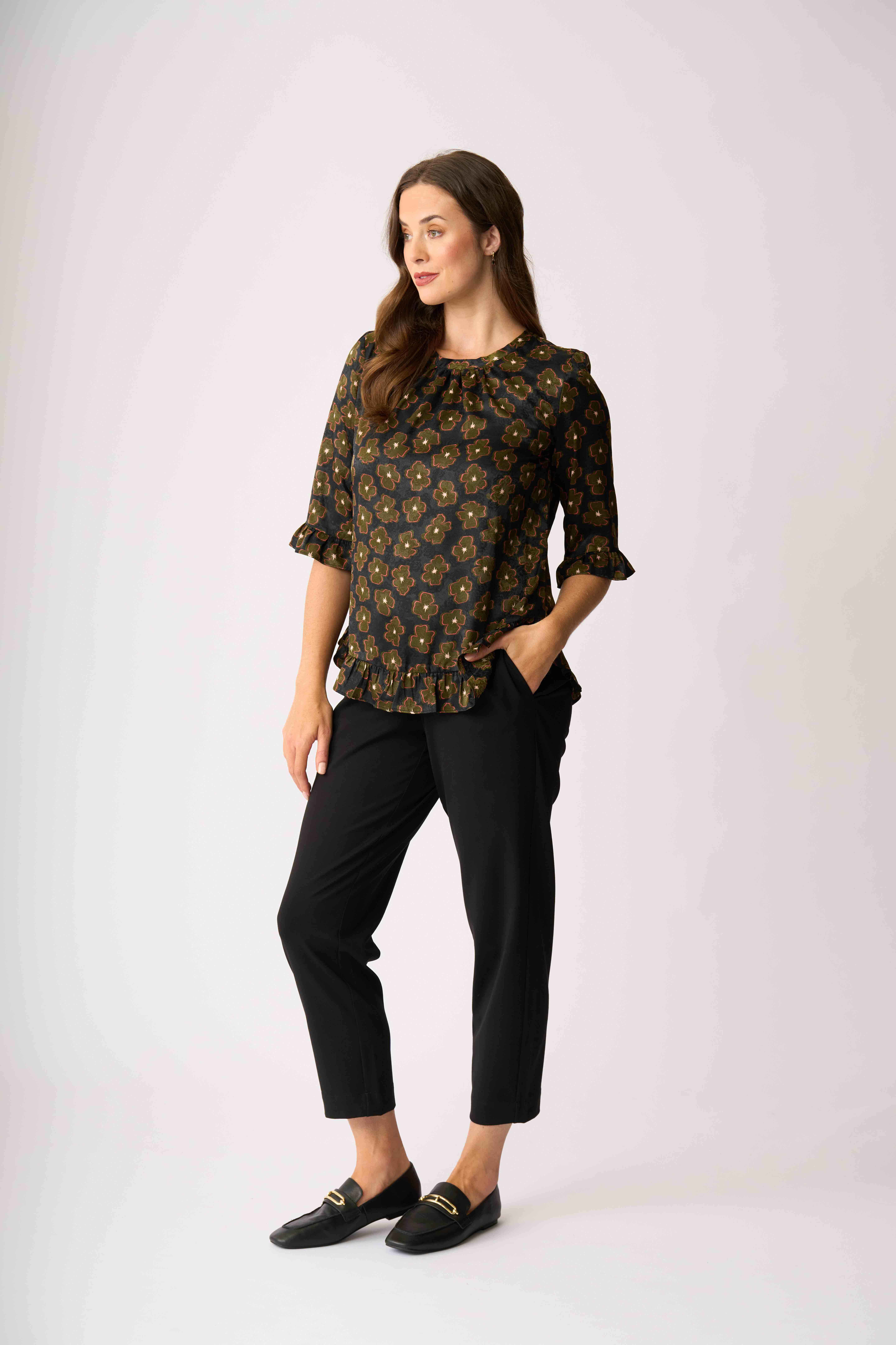 This top has ruffles at the cuffs and hemWith a scoop neckline and 3/4 sleeves