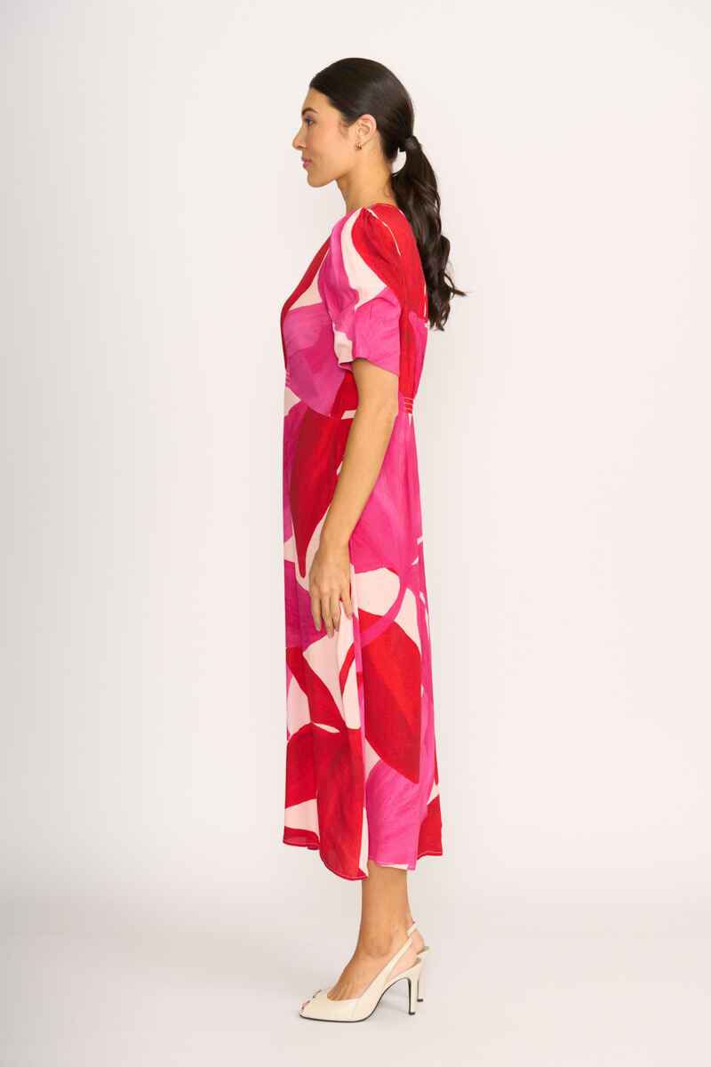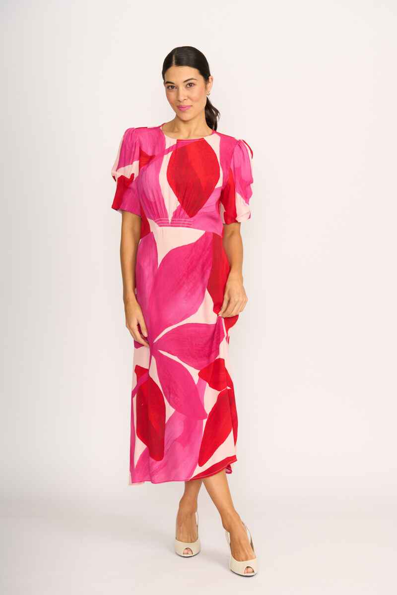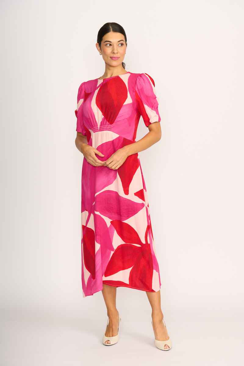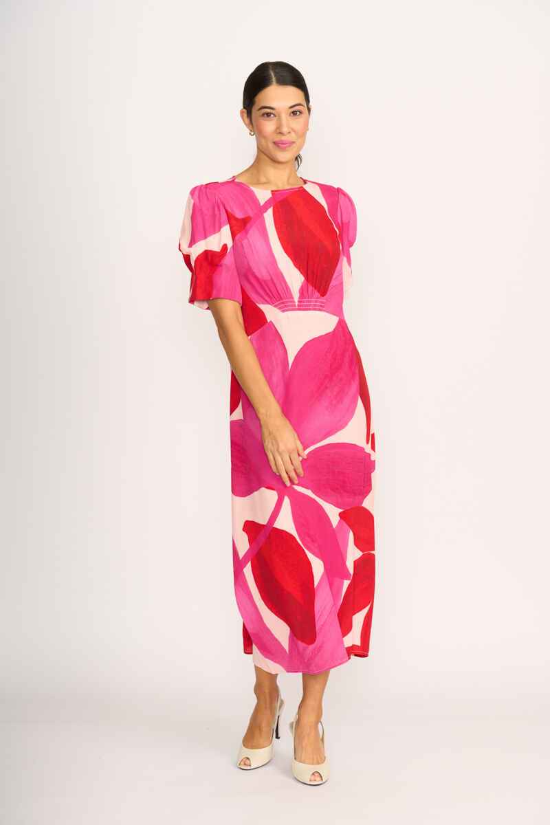 Gorgeous & flattering empire line dress. This dress has shirring on the curved empire line, which creates a flattering shape. The sleeves have a lovely pleat detail, which makes this a great style to dress up easily. Body length from the shoulder to the hem is approx. 126cm (size 12)