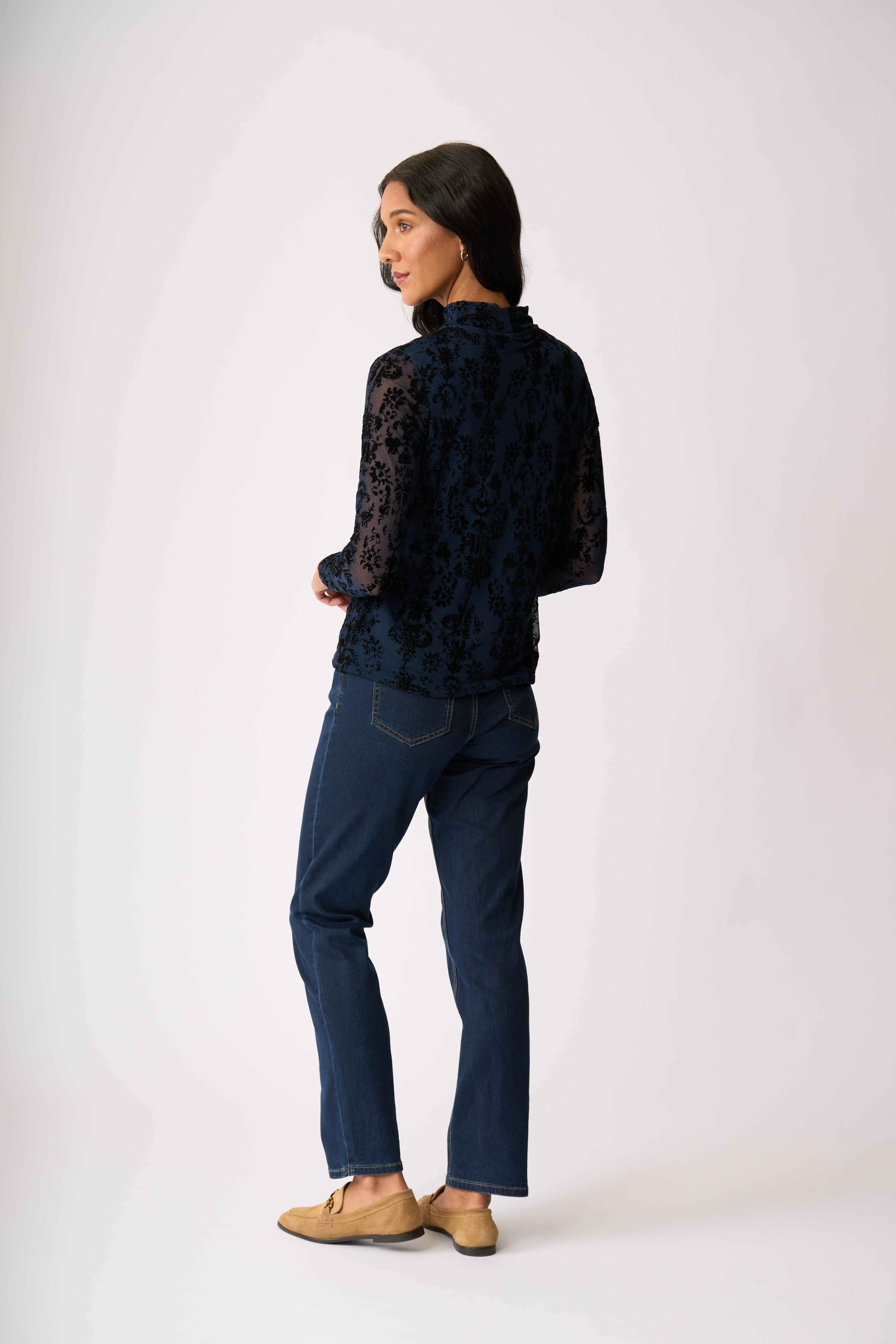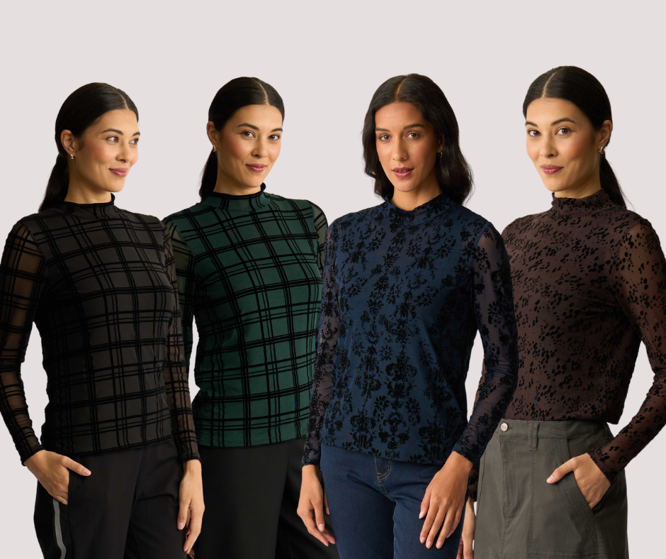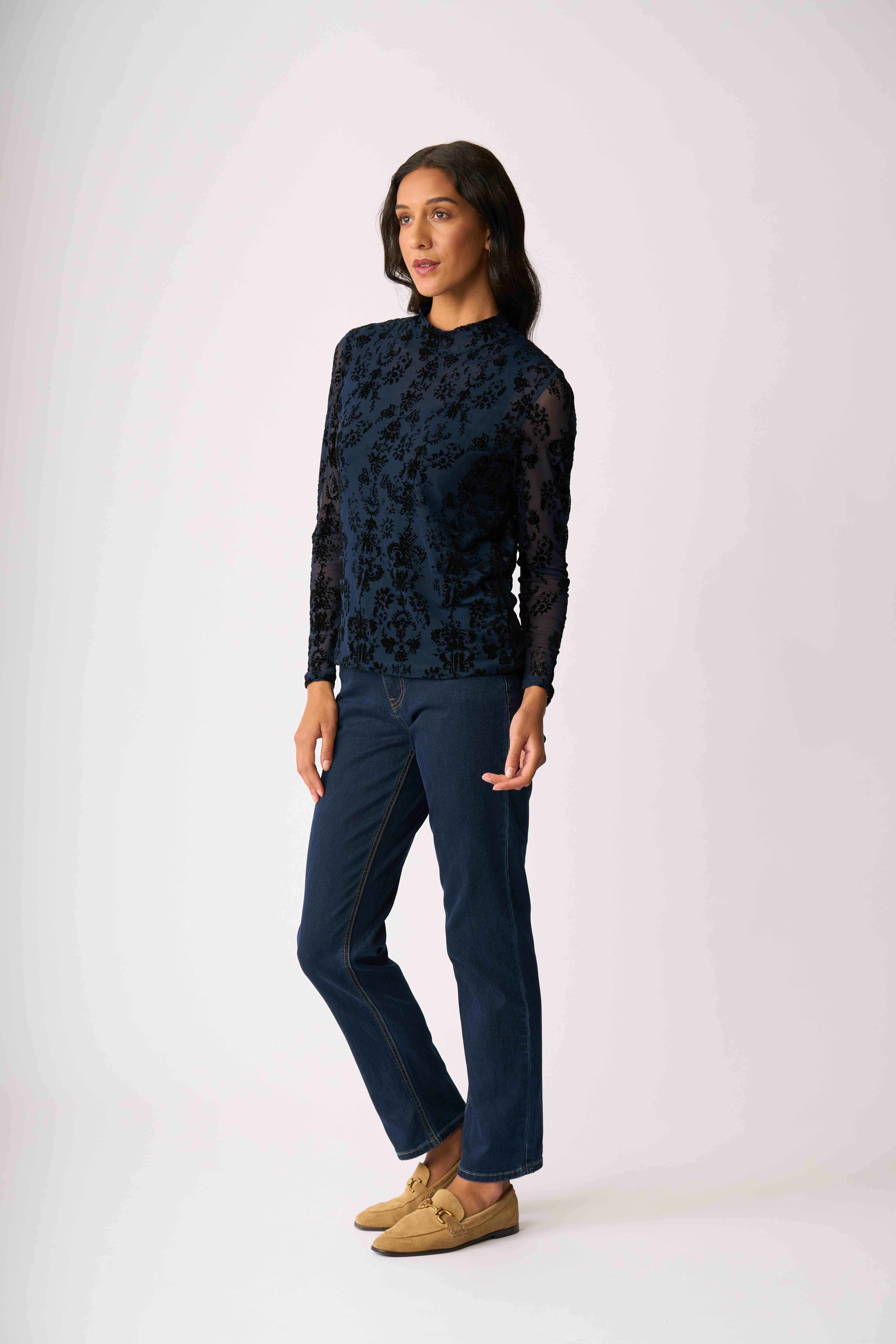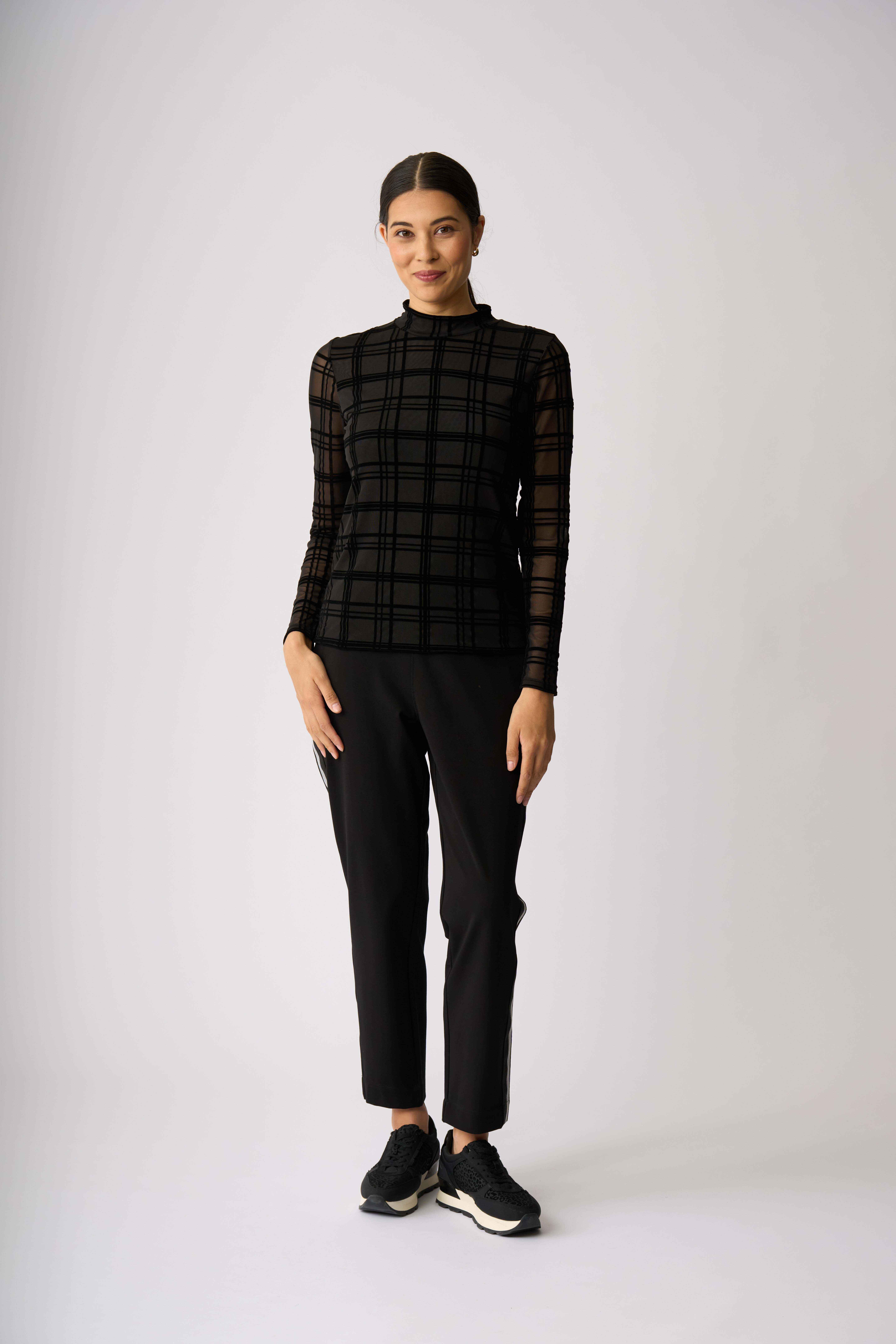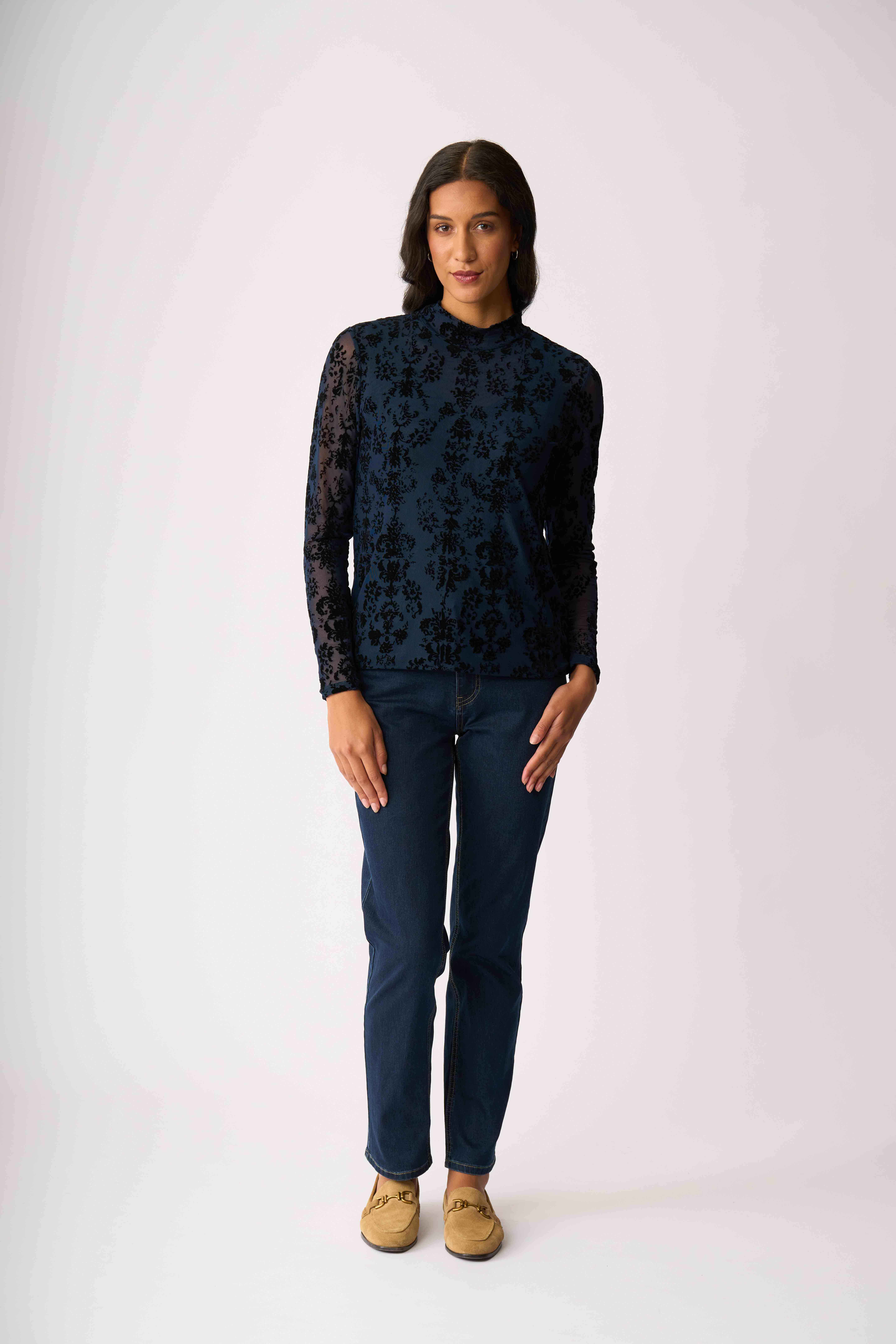 Velvet burnout mesh top with a high polo neckAdd texture and interest to your outfitThe body is lined for extra coverage while the sleeves are unlined