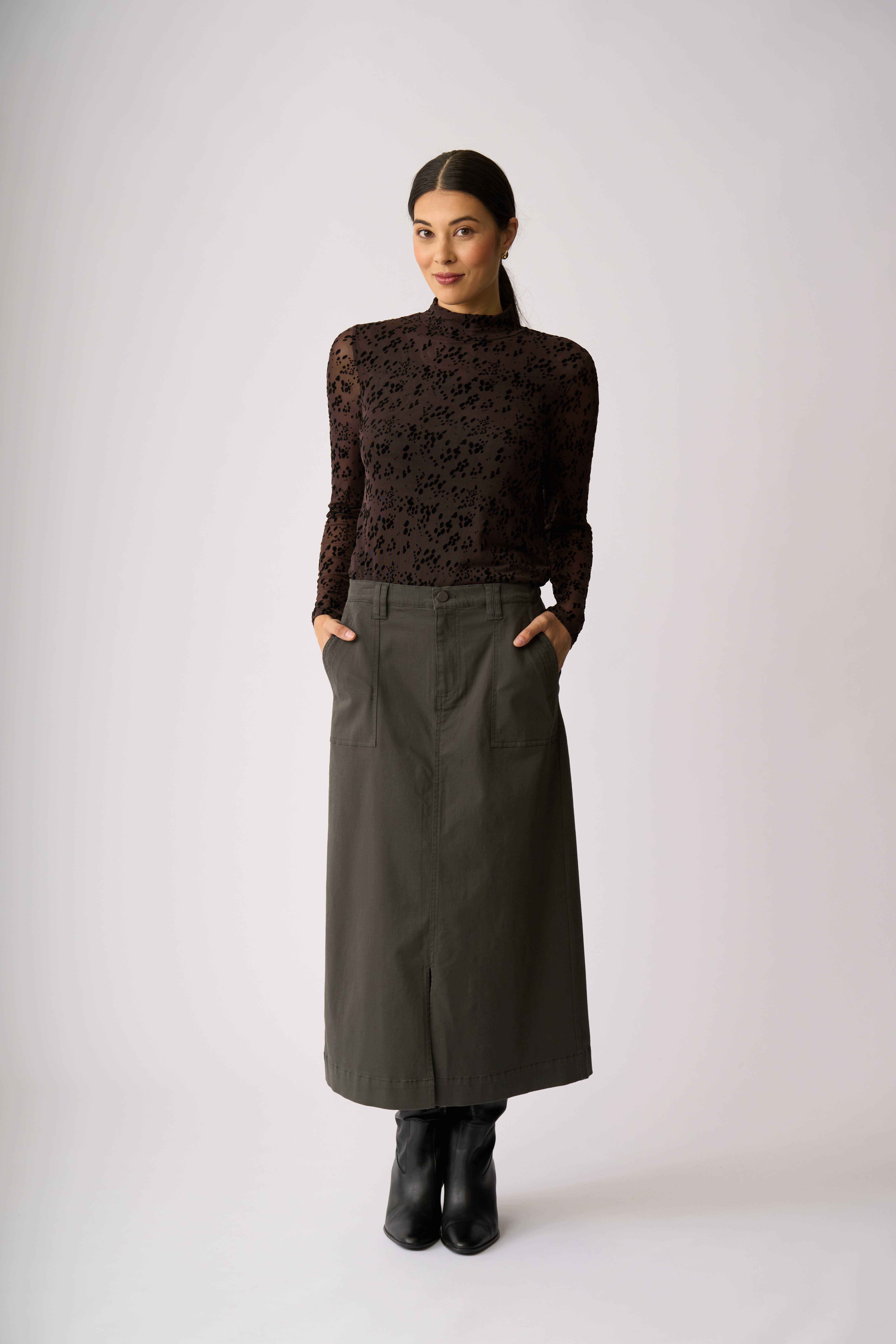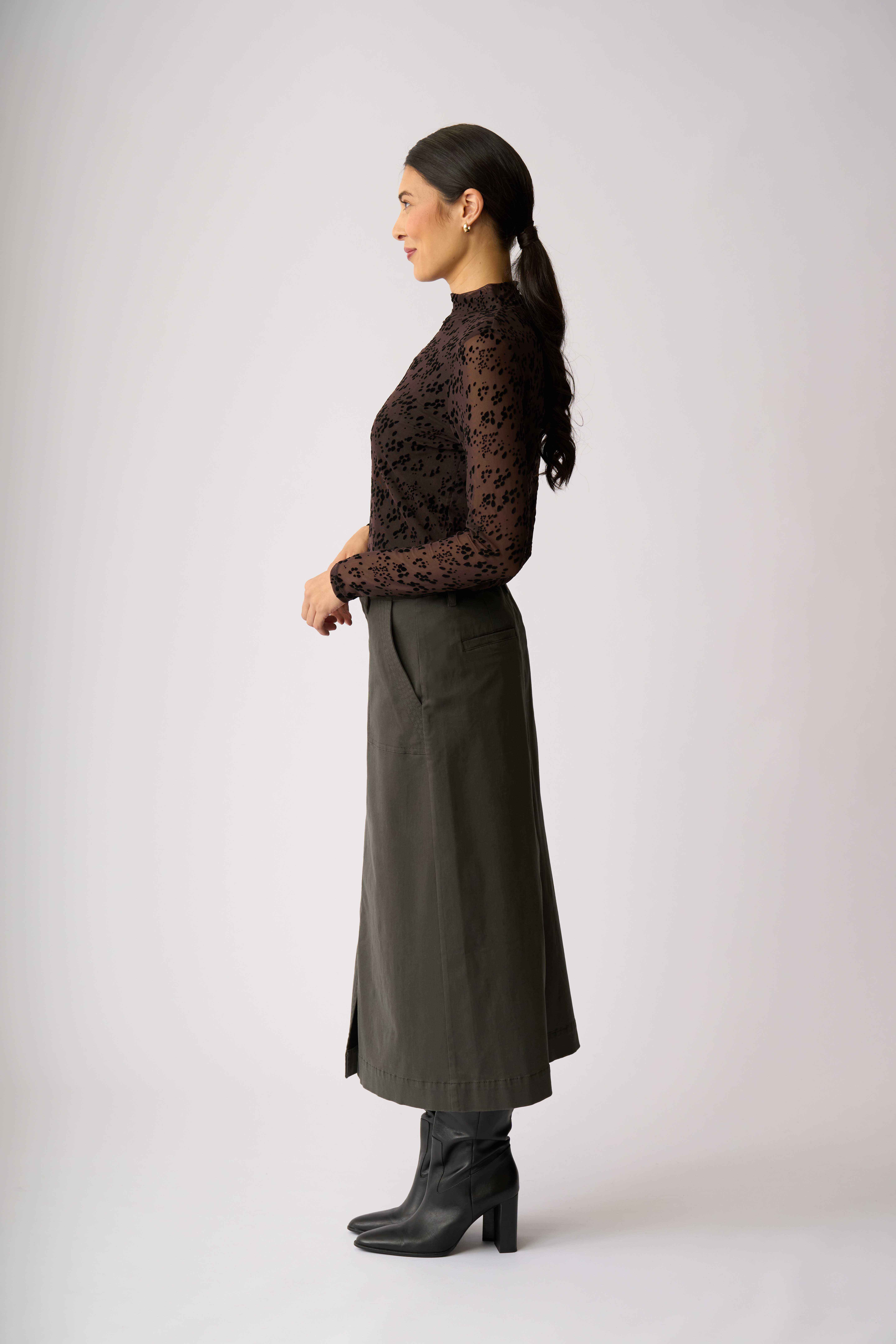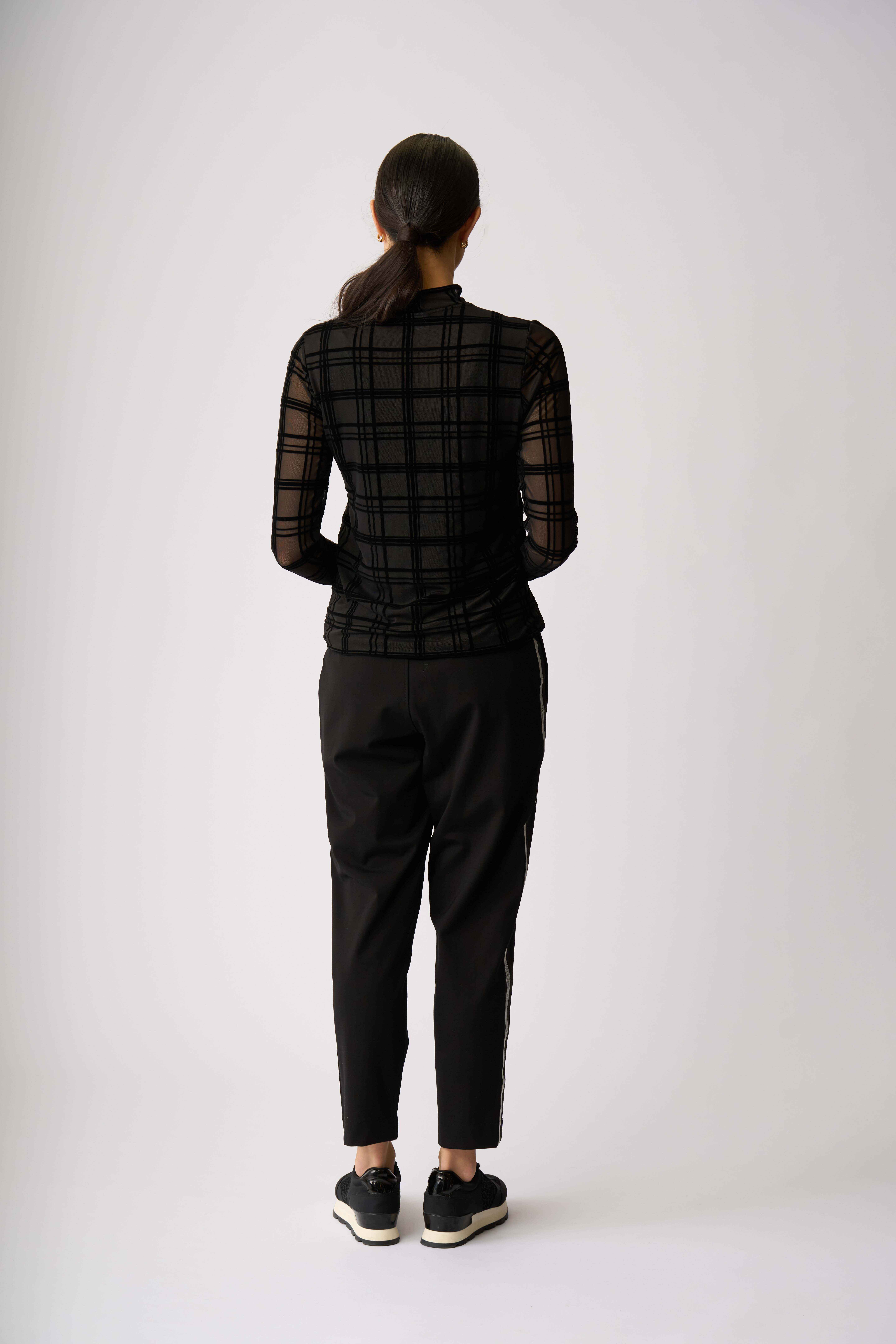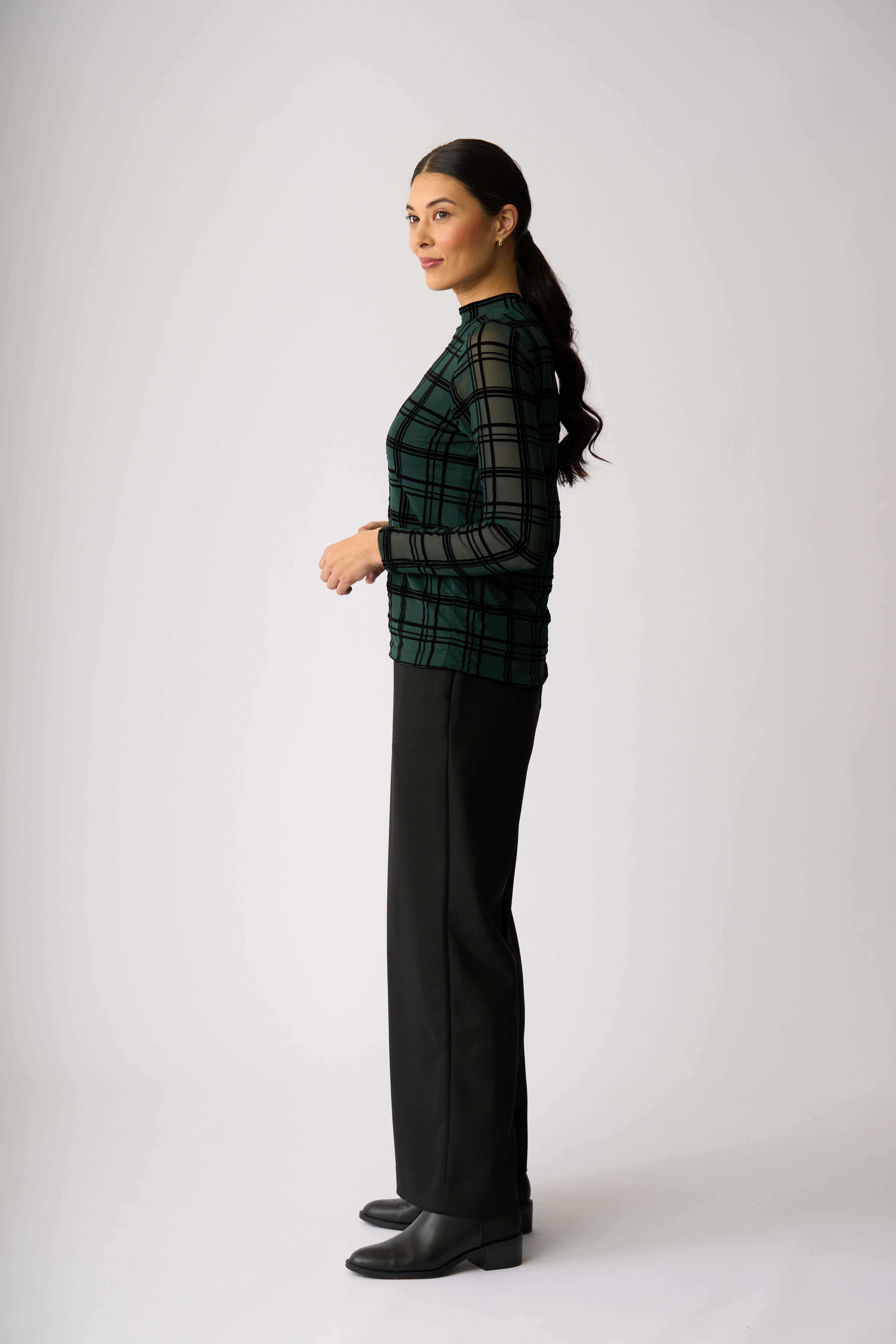 Velvet burnout mesh top with a high polo neckAdd texture and interest to your outfitThe body is lined for extra coverage while the sleeves are unlined