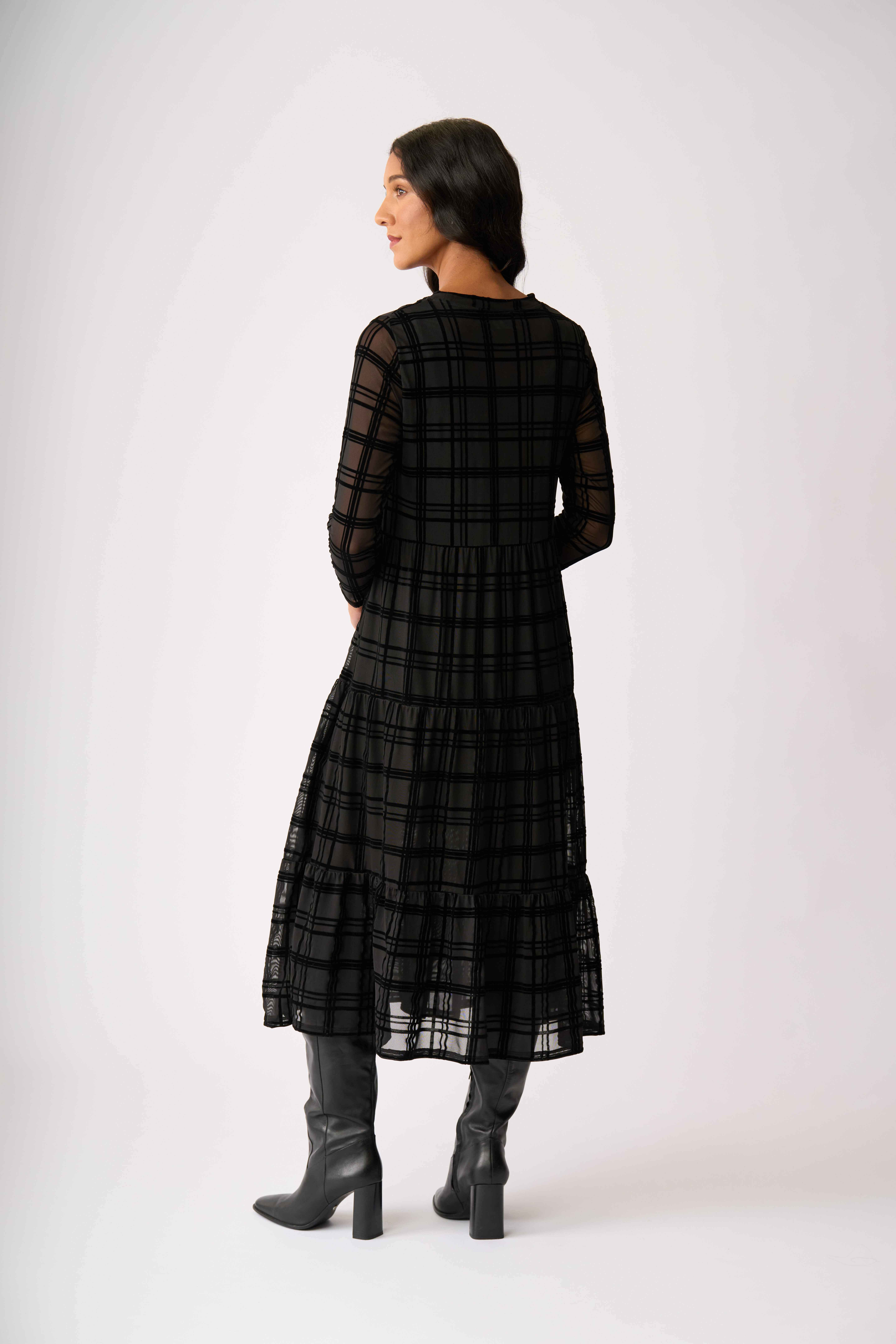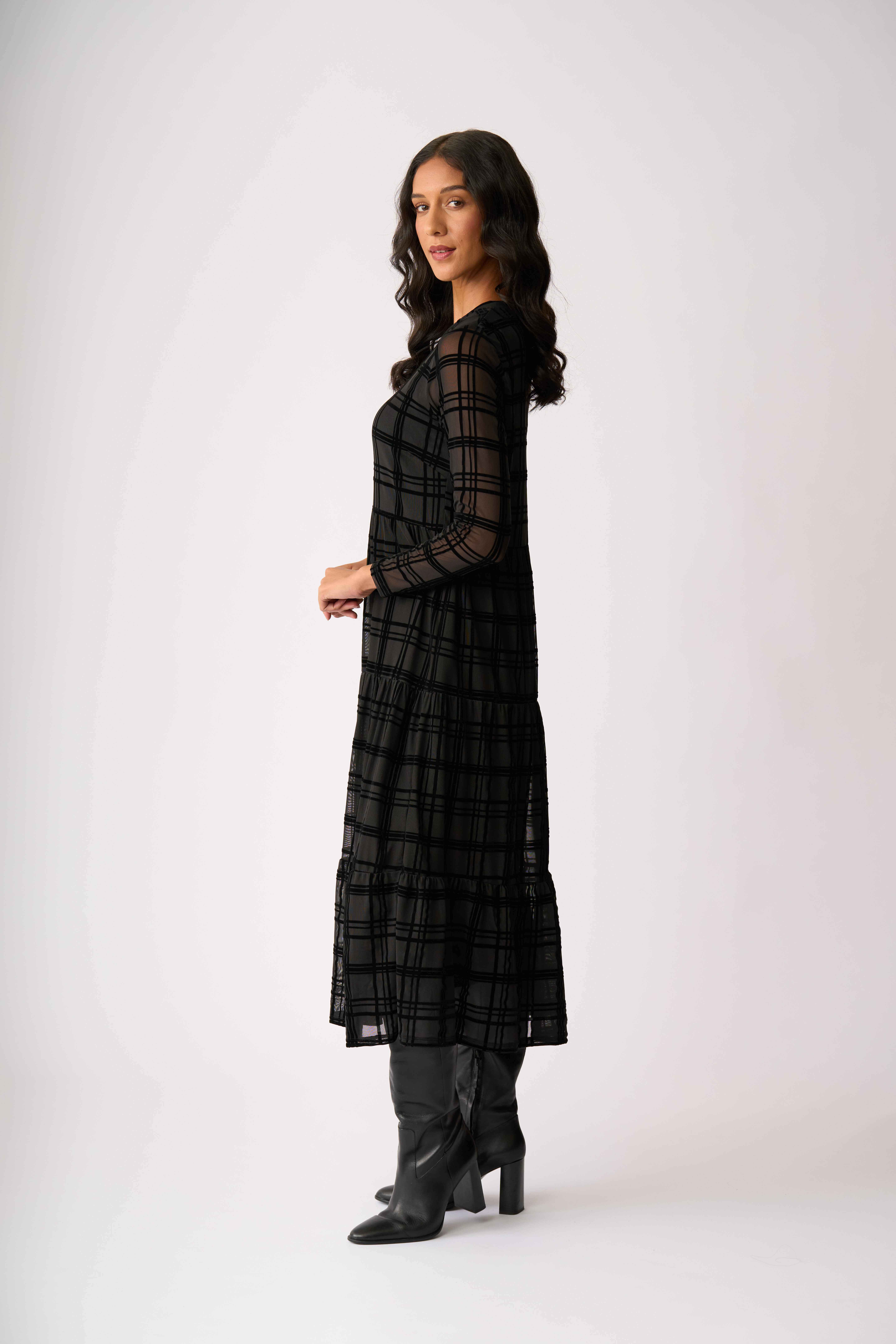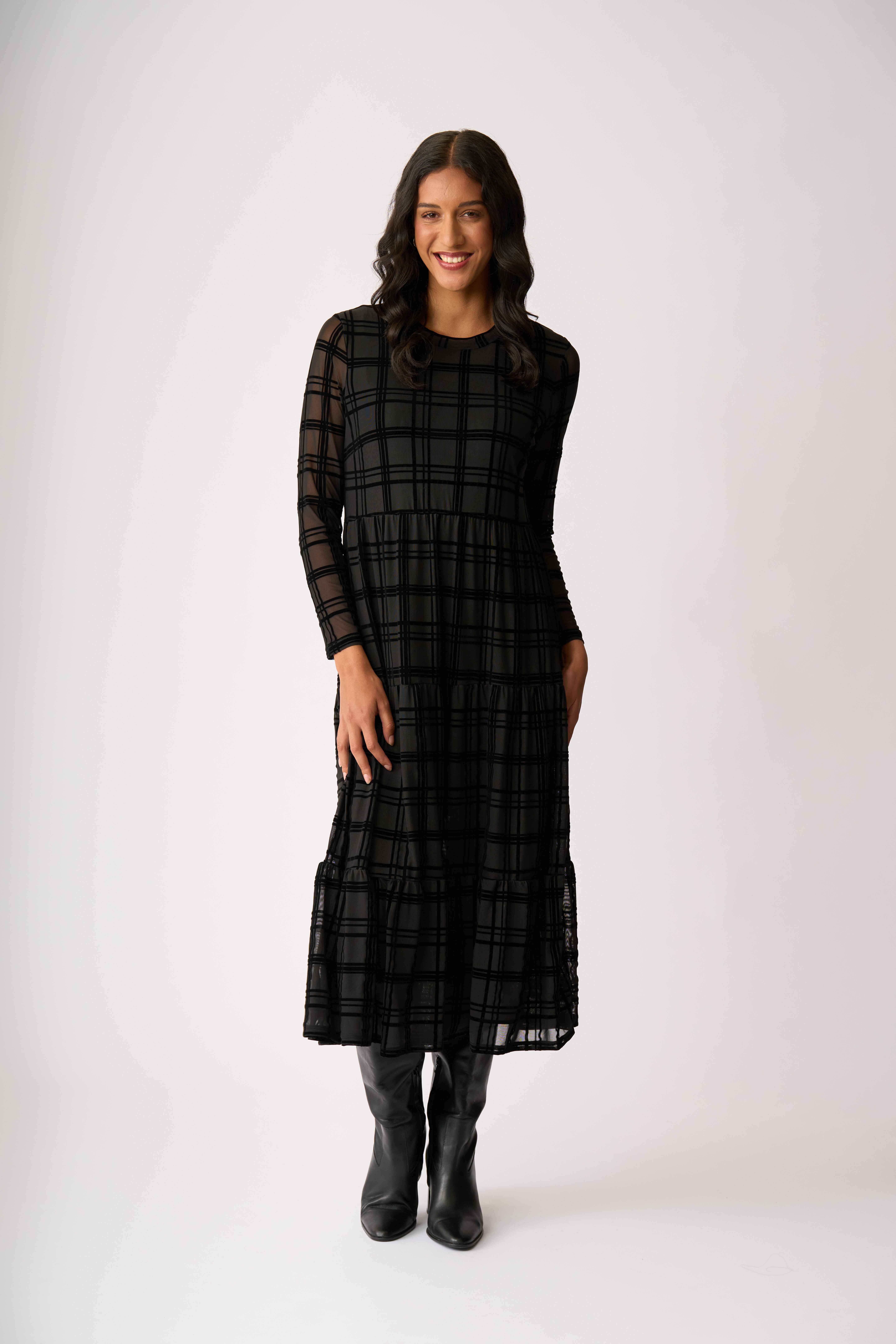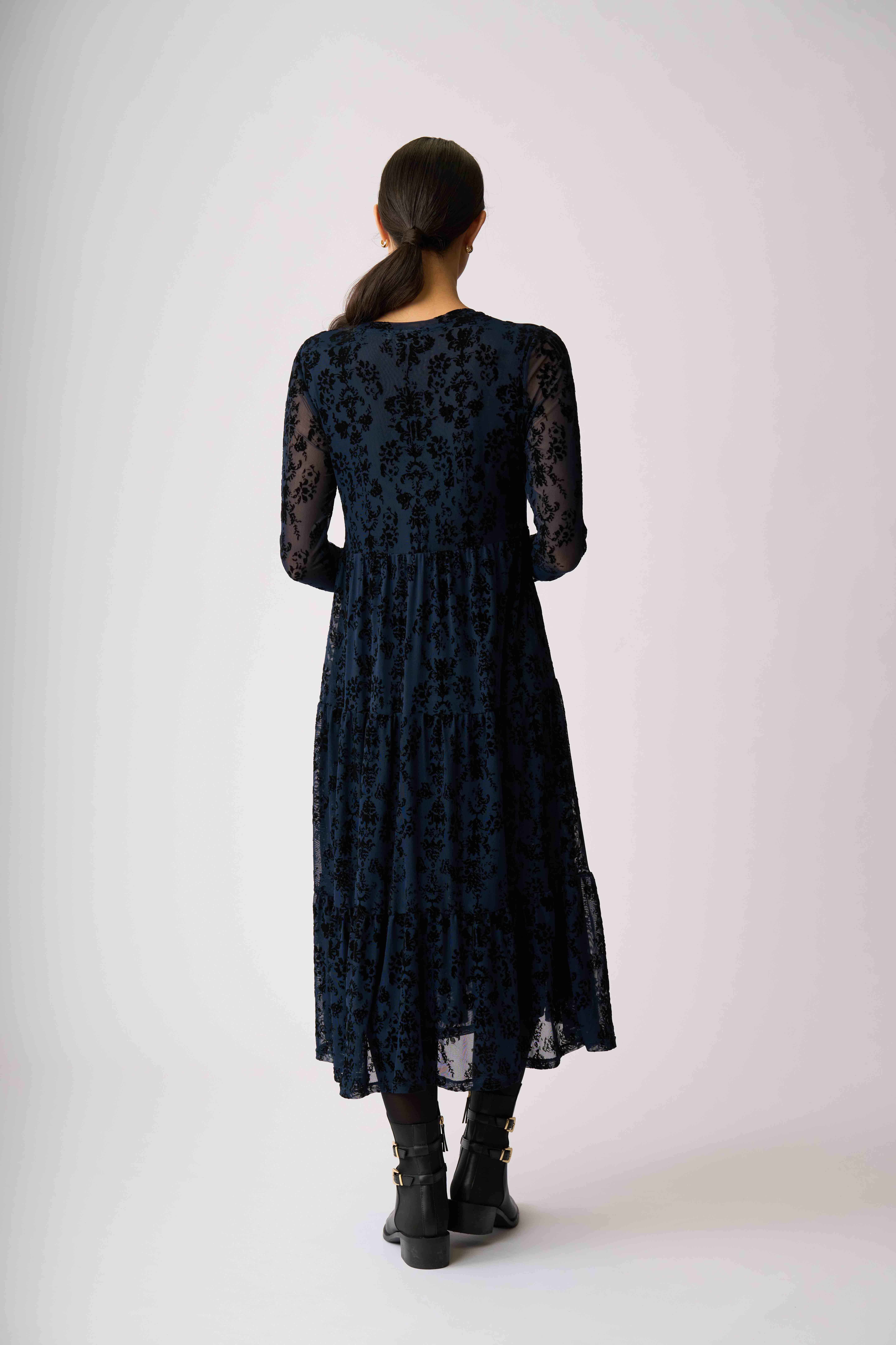 Velvet textured mesh dressLined in the body for extra coverageTiered hem detailLong sleevesScoop neck