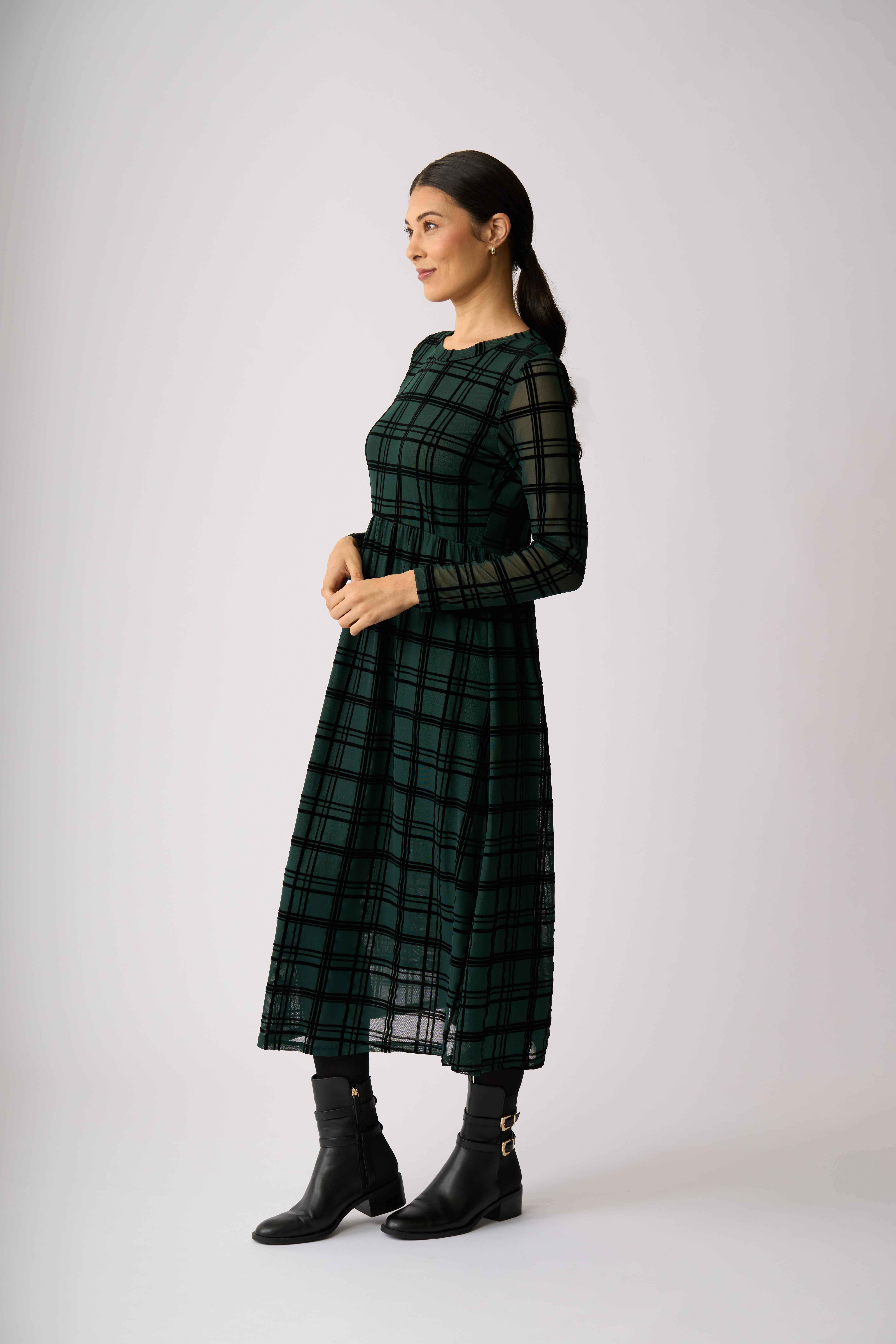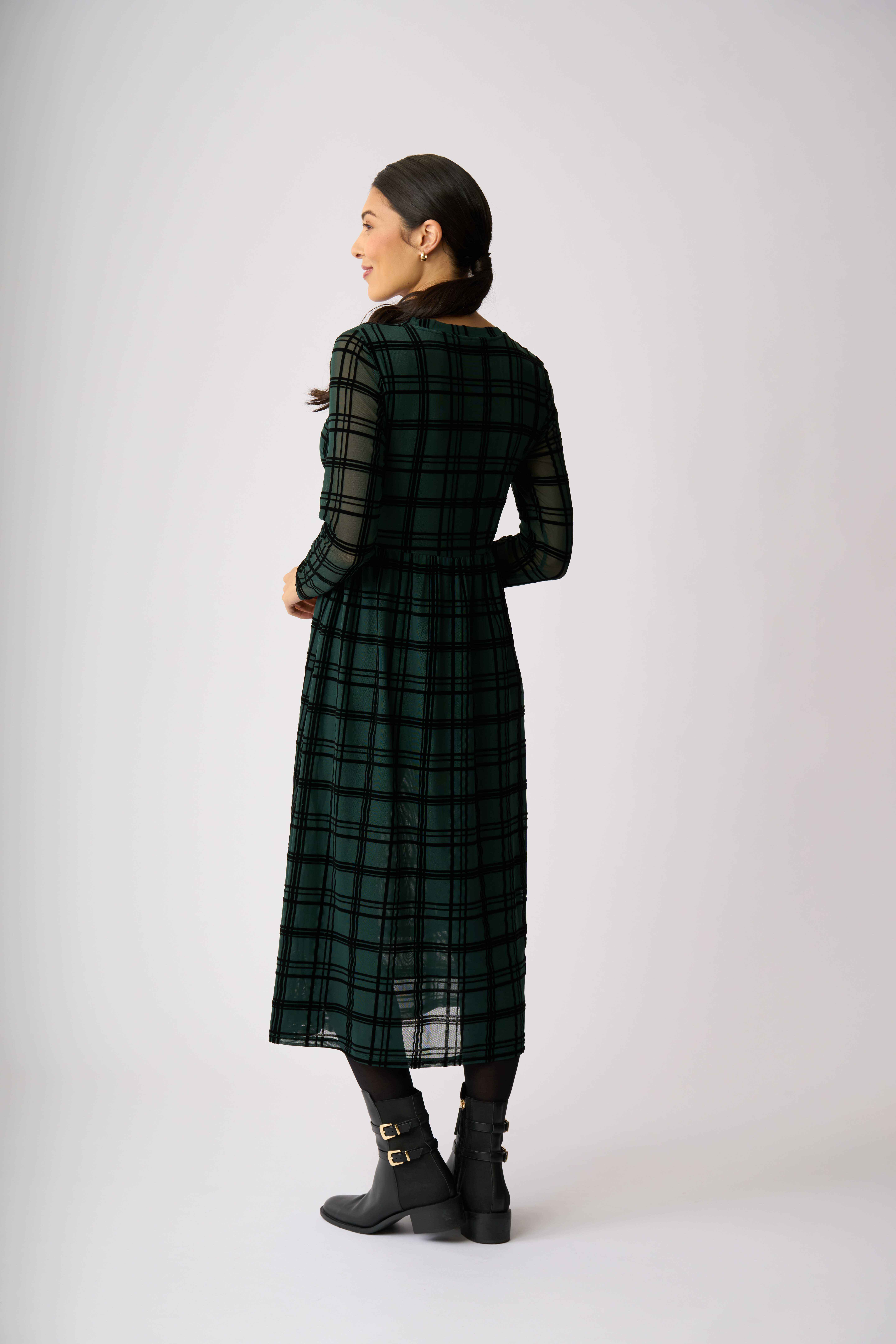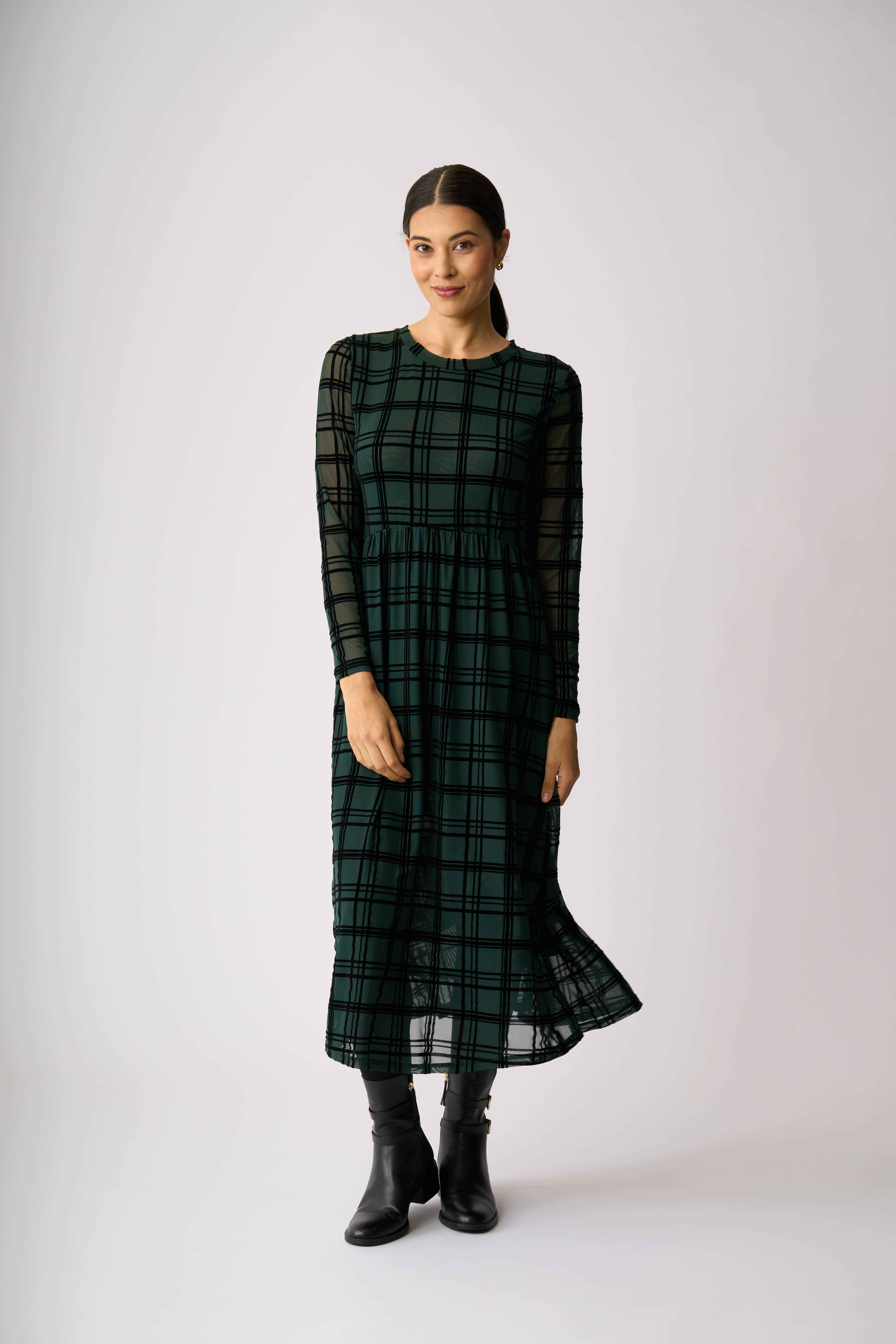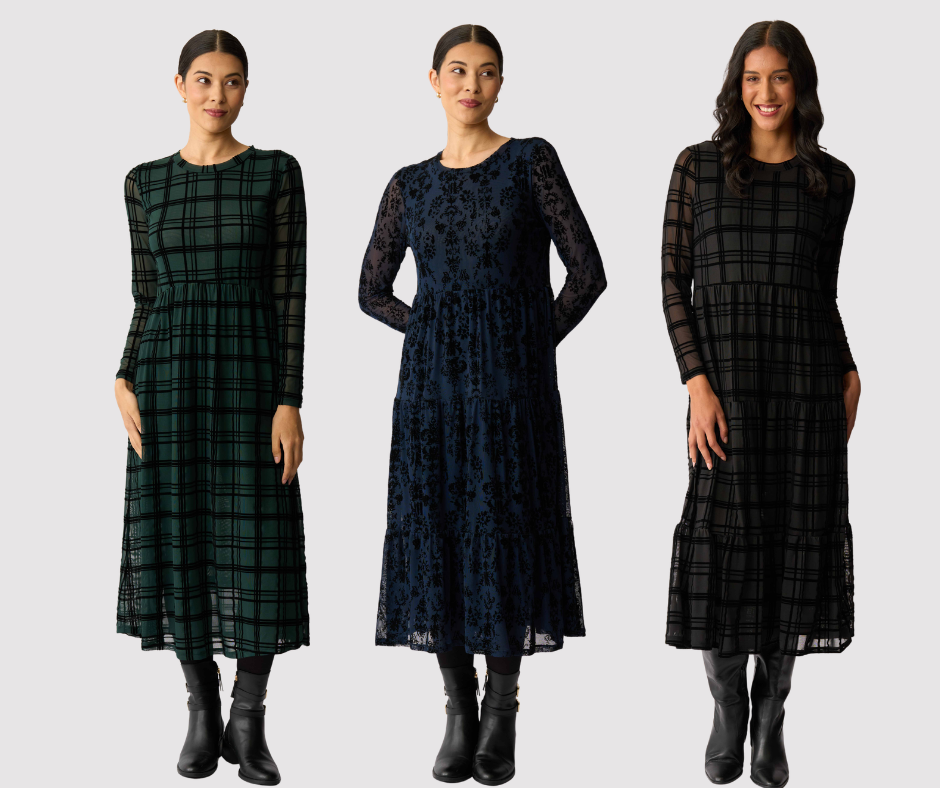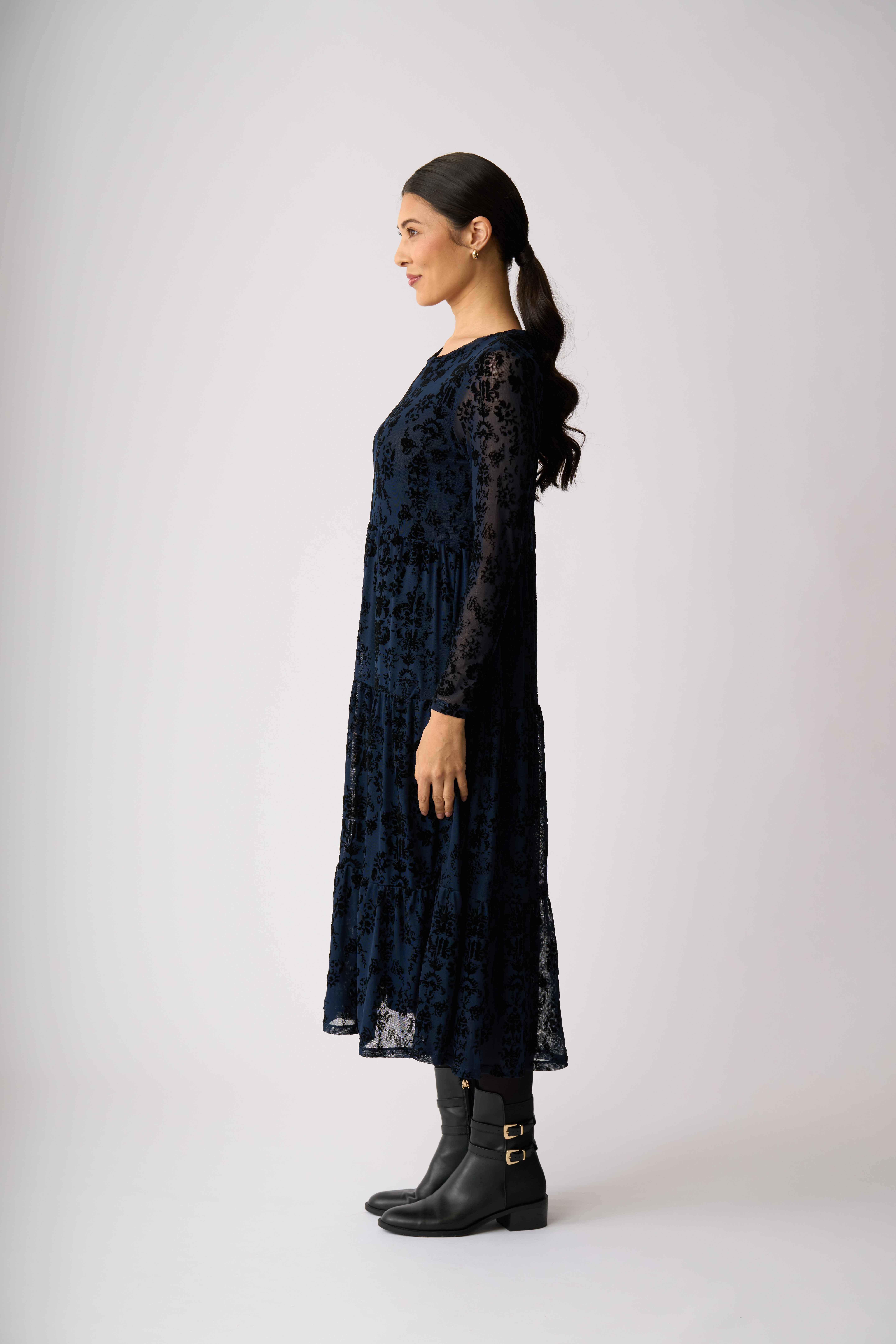 Velvet textured mesh dressLined in the body for extra coverageTiered hem detailLong sleevesScoop neck