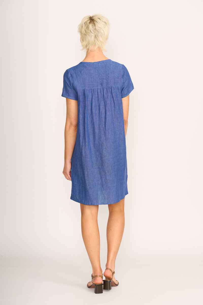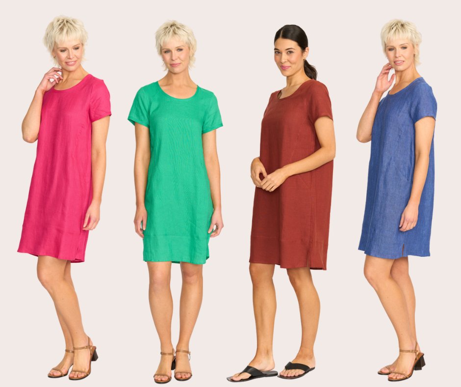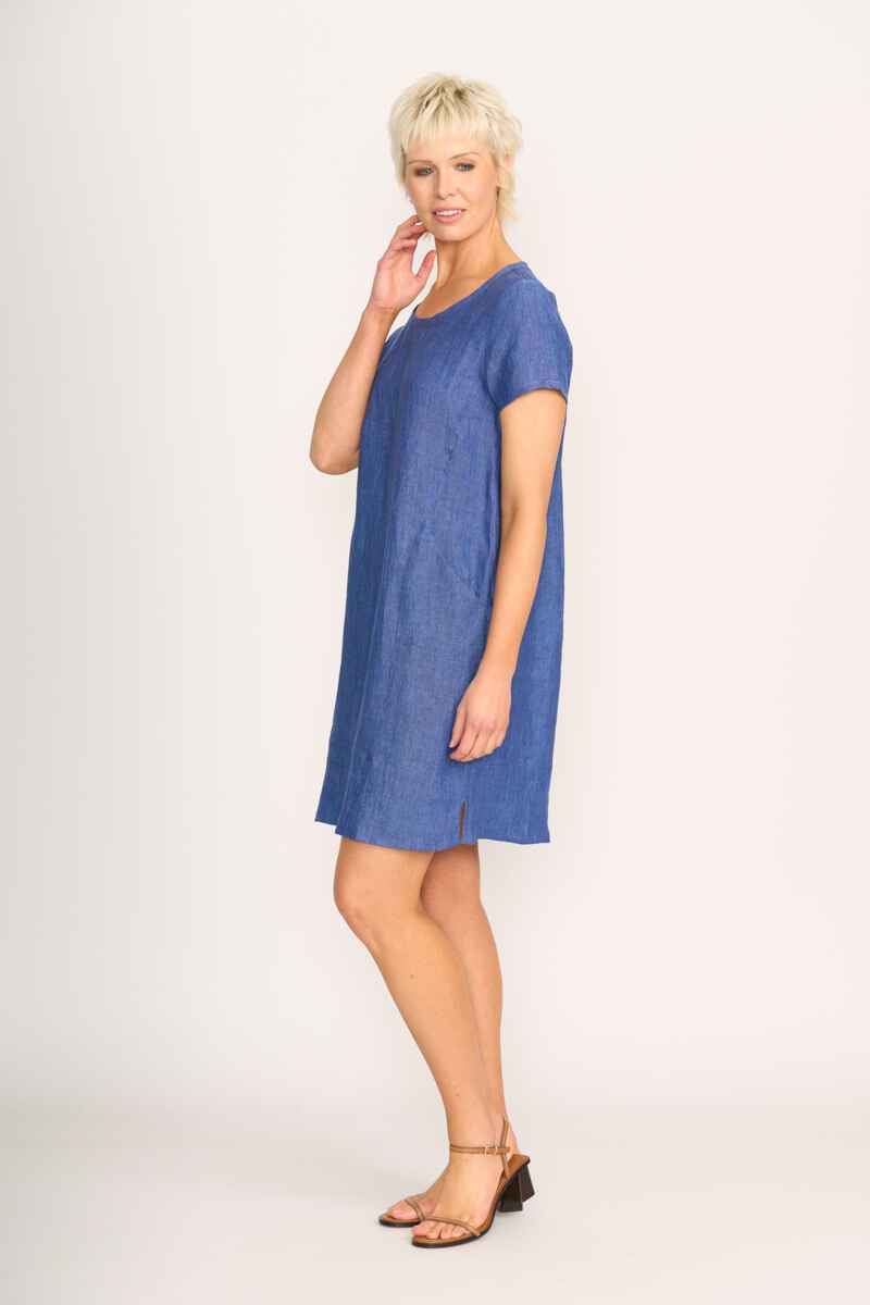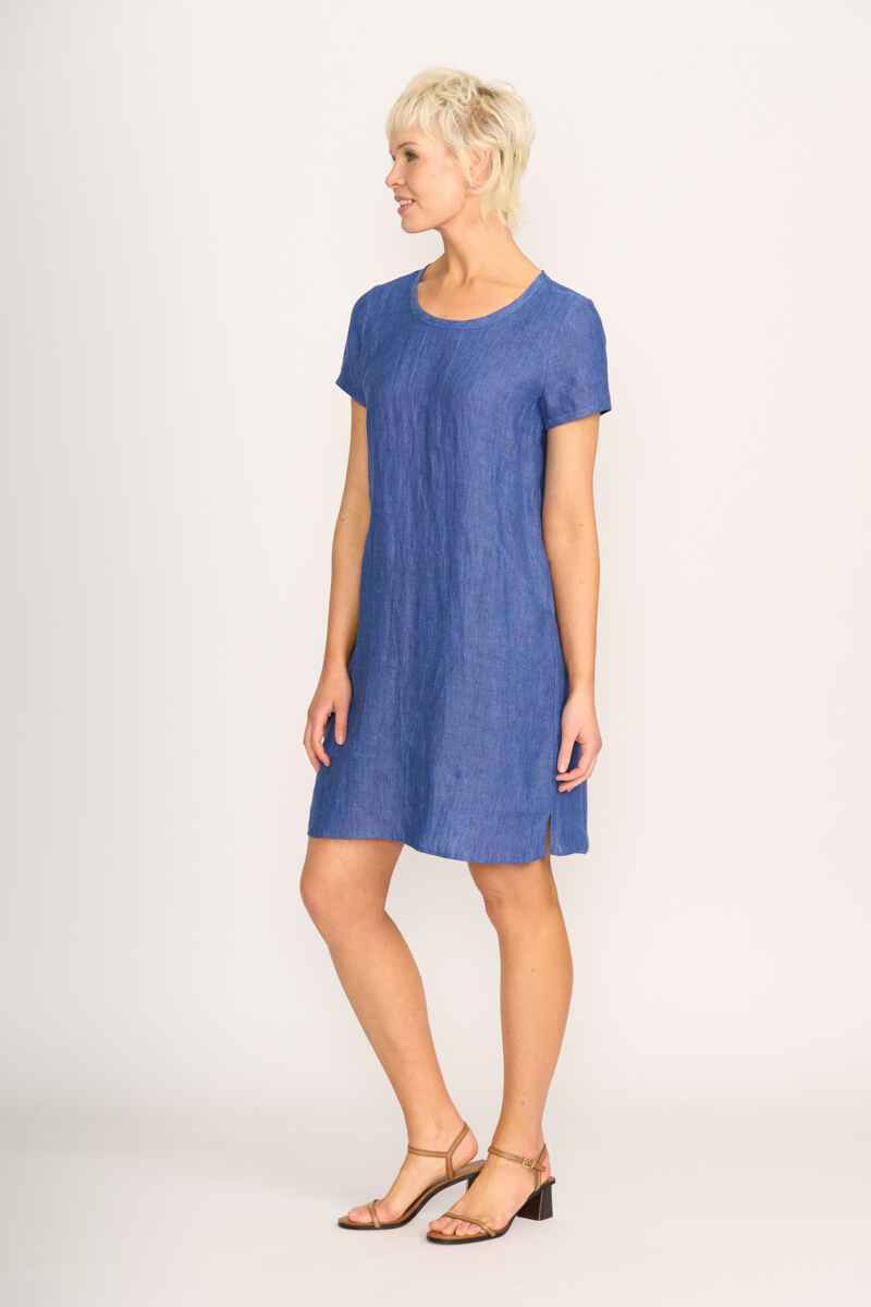 The panel line dress with asymmetric panel lines and a back gathered yoke for an easy fit. Side splits at the hem. Body length from front apex is approx. 100cm (size 12)