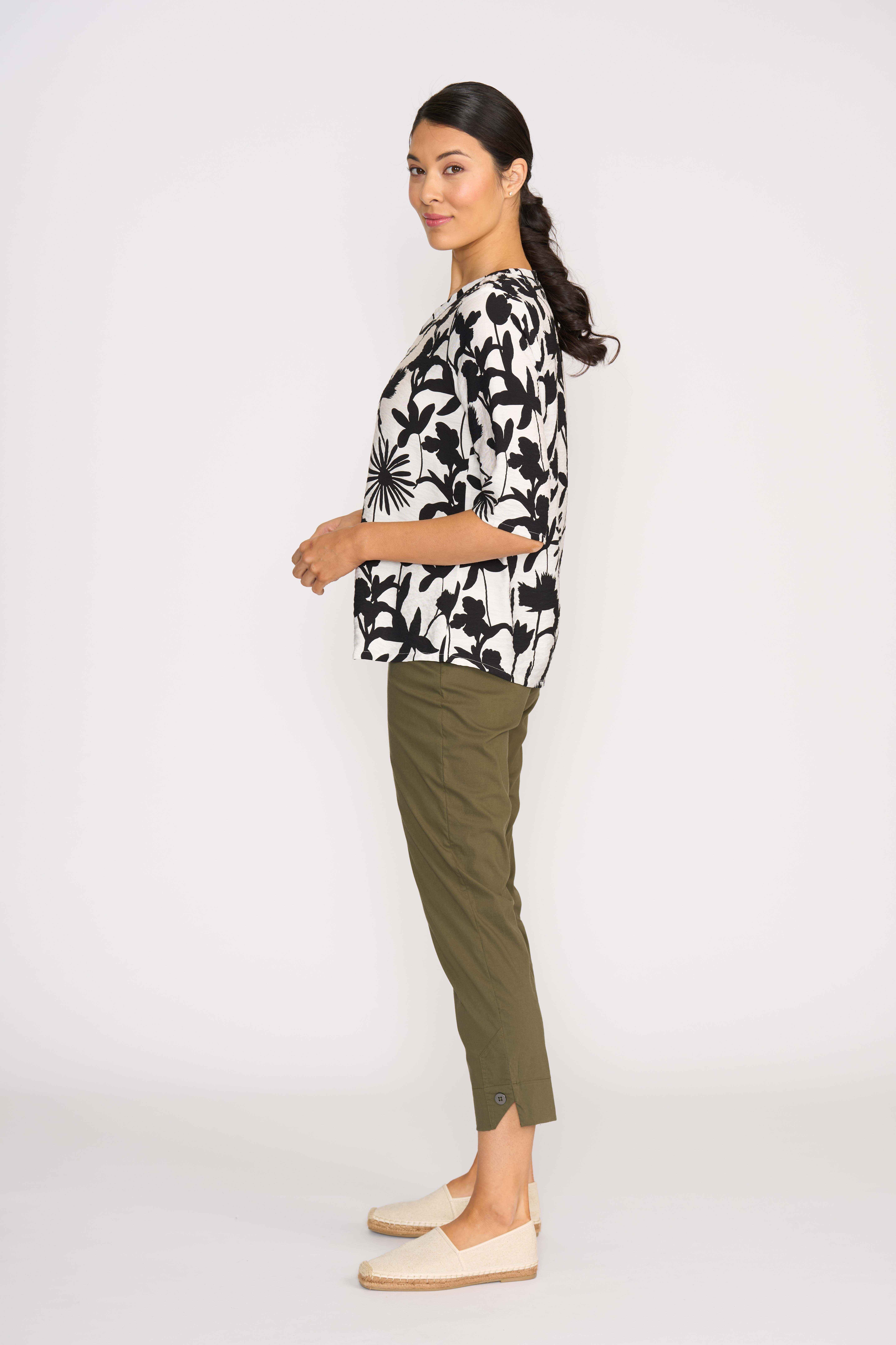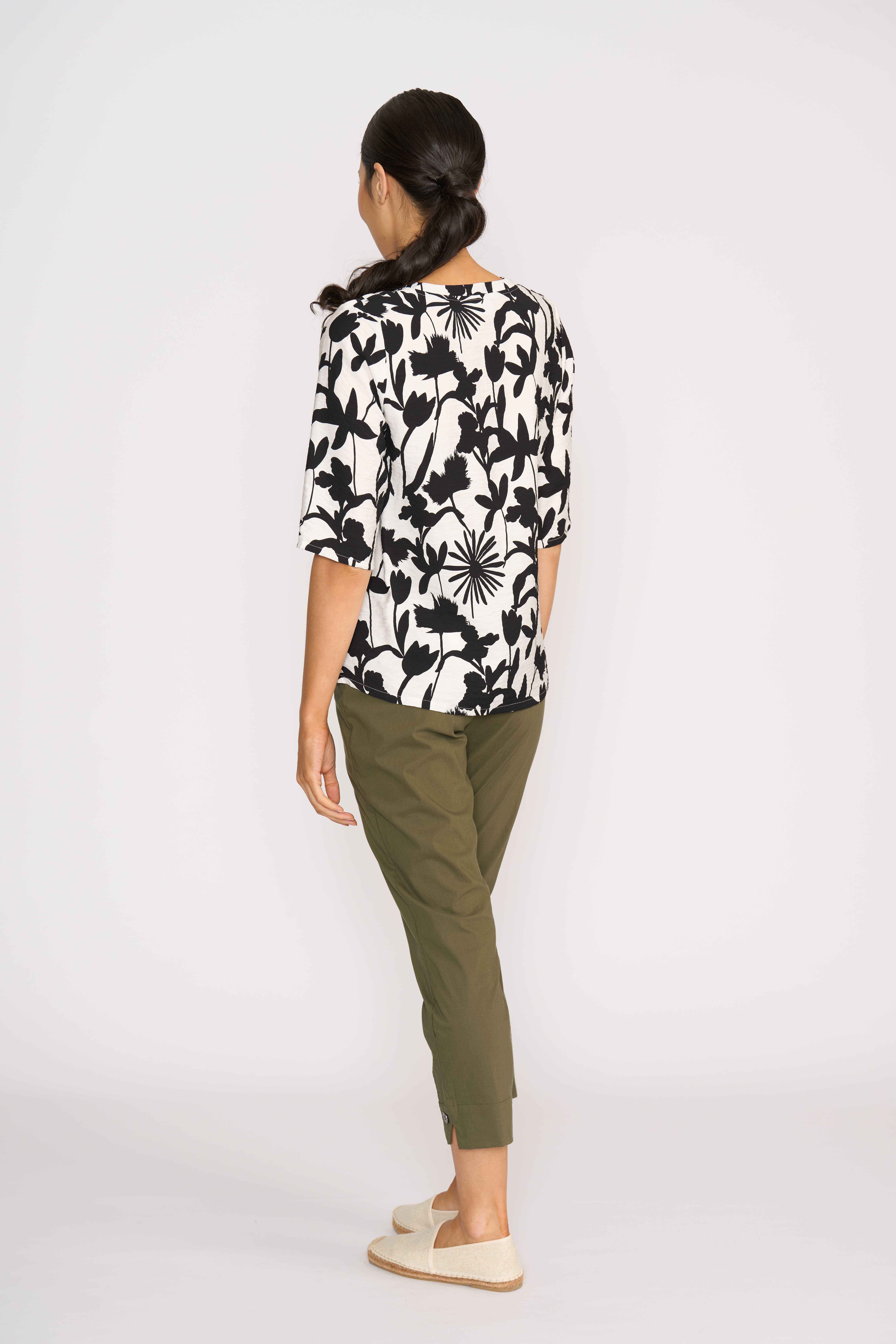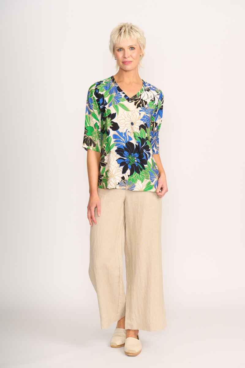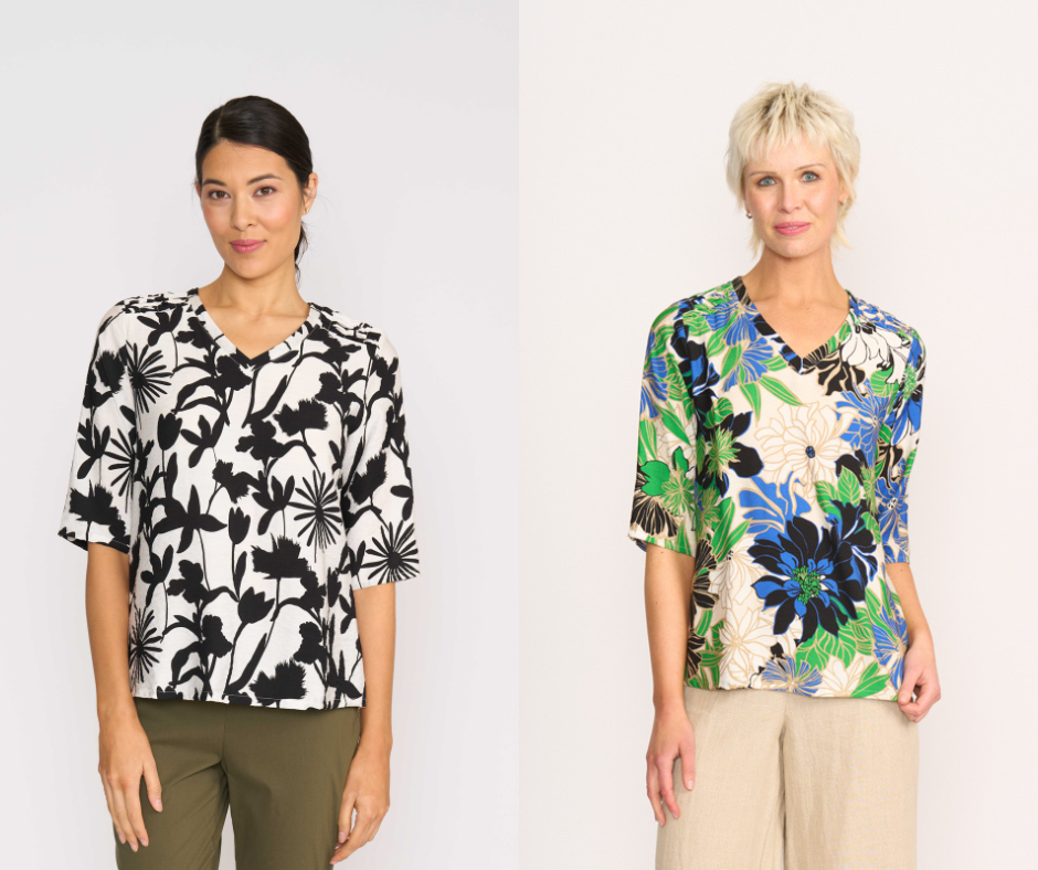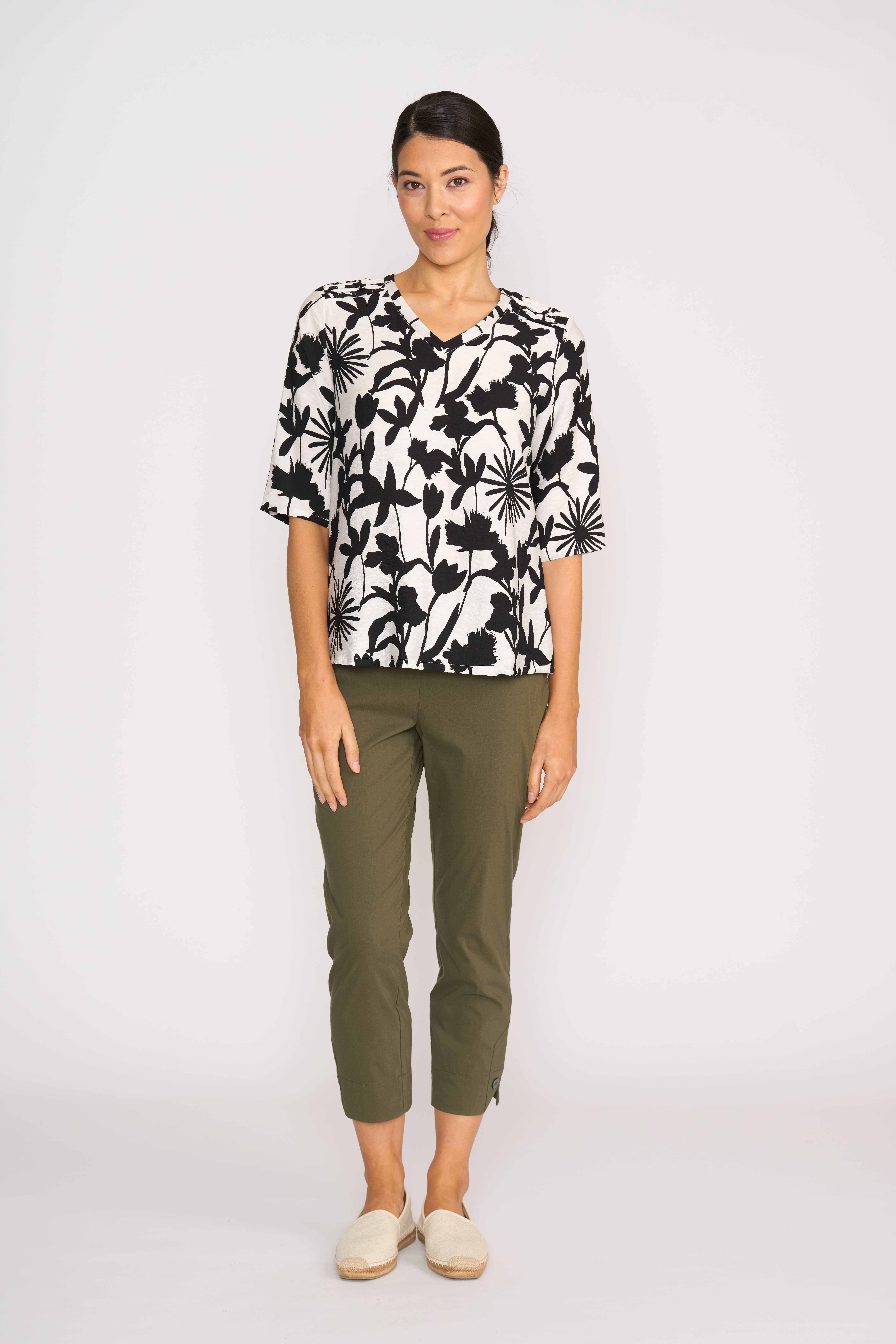 An easy fit top with a V neckline and a pintucks panel at the shoulder. Elbow-length sleeves fr coverage. Body length taken at the centre front approx. 68.5cm (size 12 )