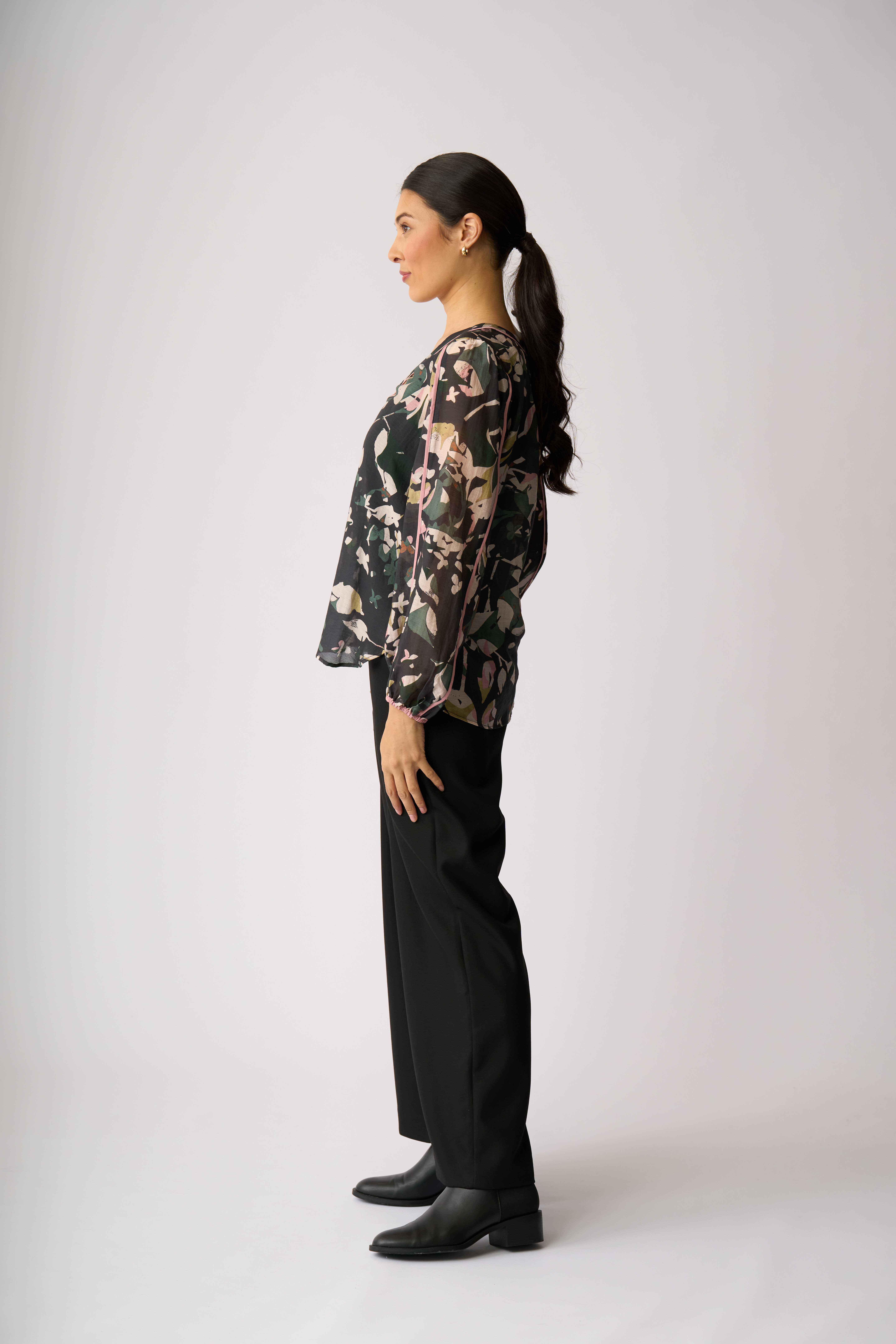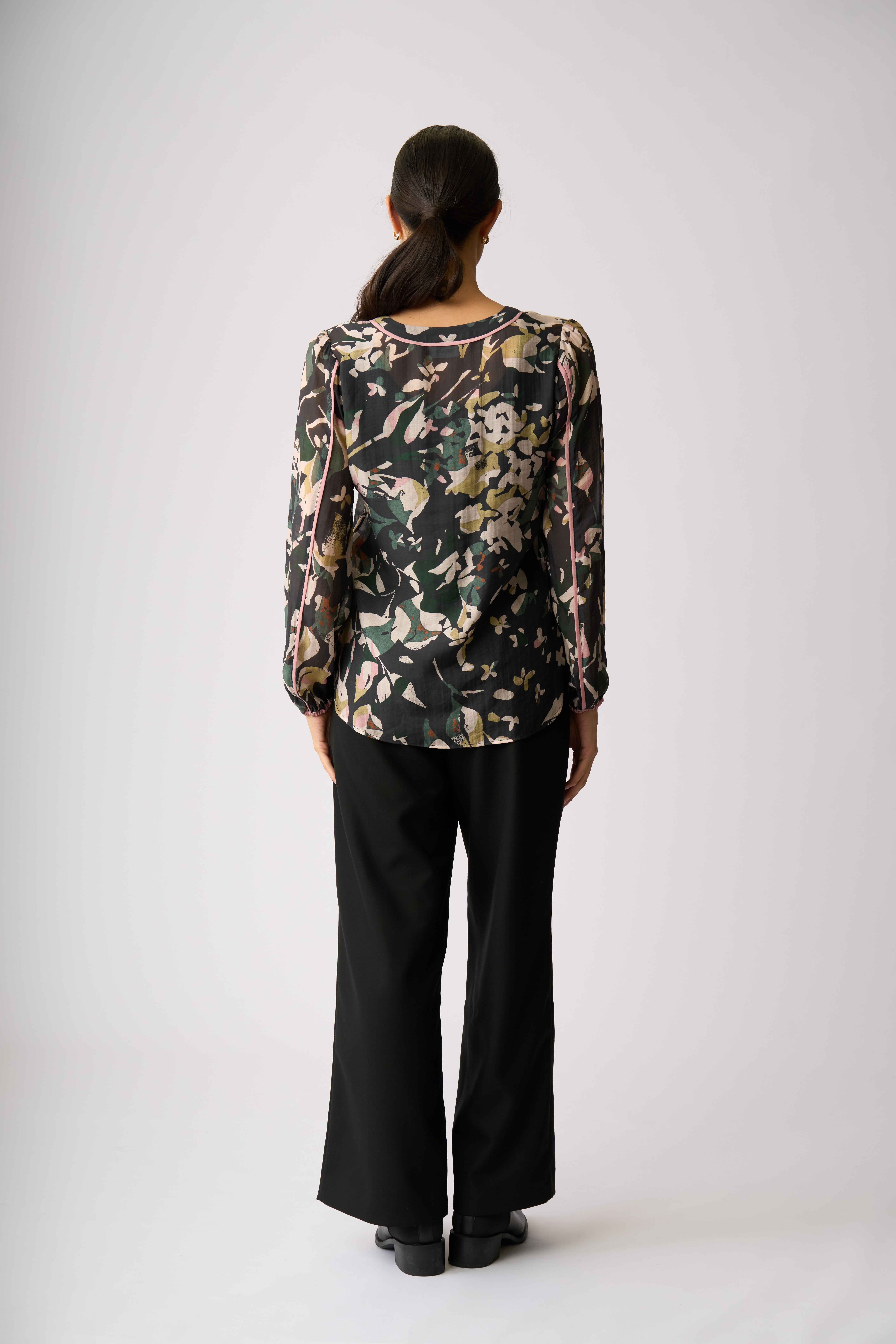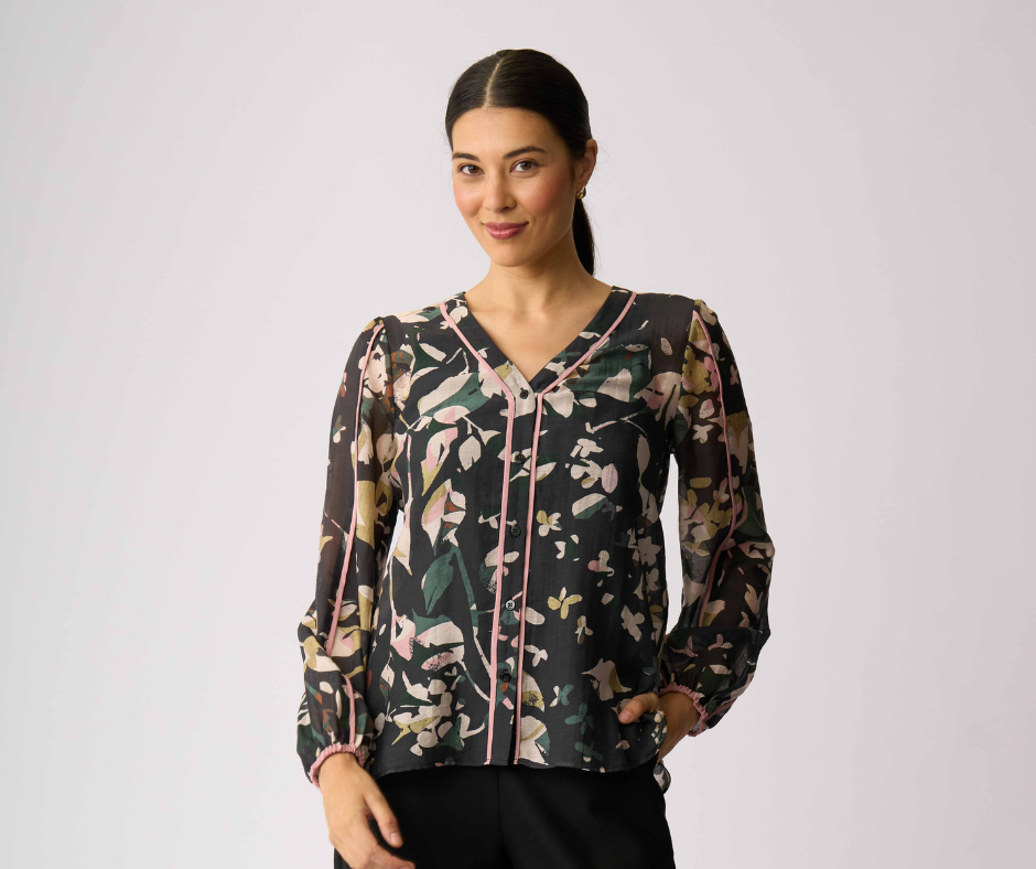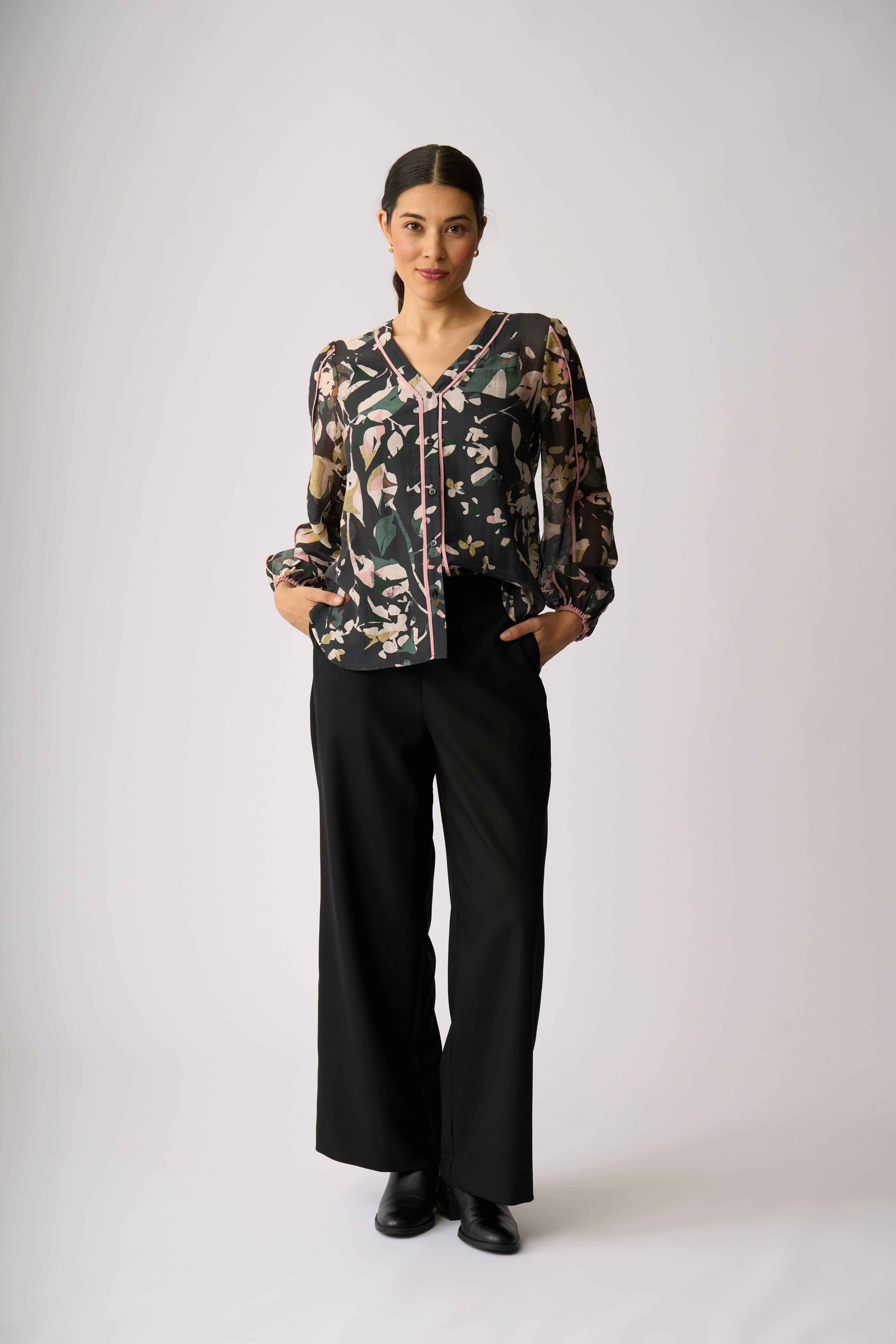 Beautiful V-neck blouse with piping detail5 Button closure down the centre frontFull length sleeves that gather at the bind edge cuff