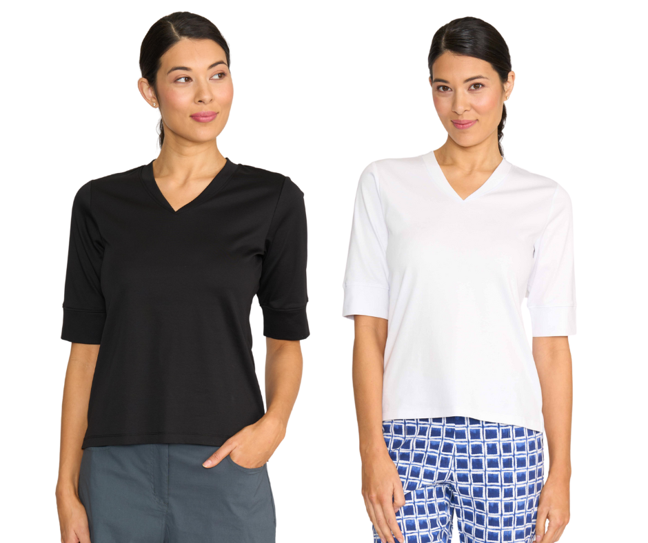 Slim fit v-neck top with elbow length sleeves. Easily dressed up with your favourite maxi skirt and sandals. Body length from shoulder to hem is approx. 65cm