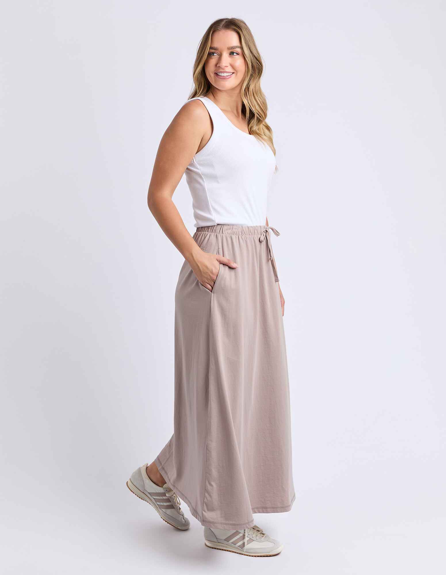 The Evolve Skirt is your new go-to for laid-back days with a touch of polish. Made from soft, breathable cotton, it offers all-day comfort and an easy fit thanks to its elastic waistband with drawcord. The side pockets add a casual, practical touch, while the midi length keeps the look relaxed yet refined.