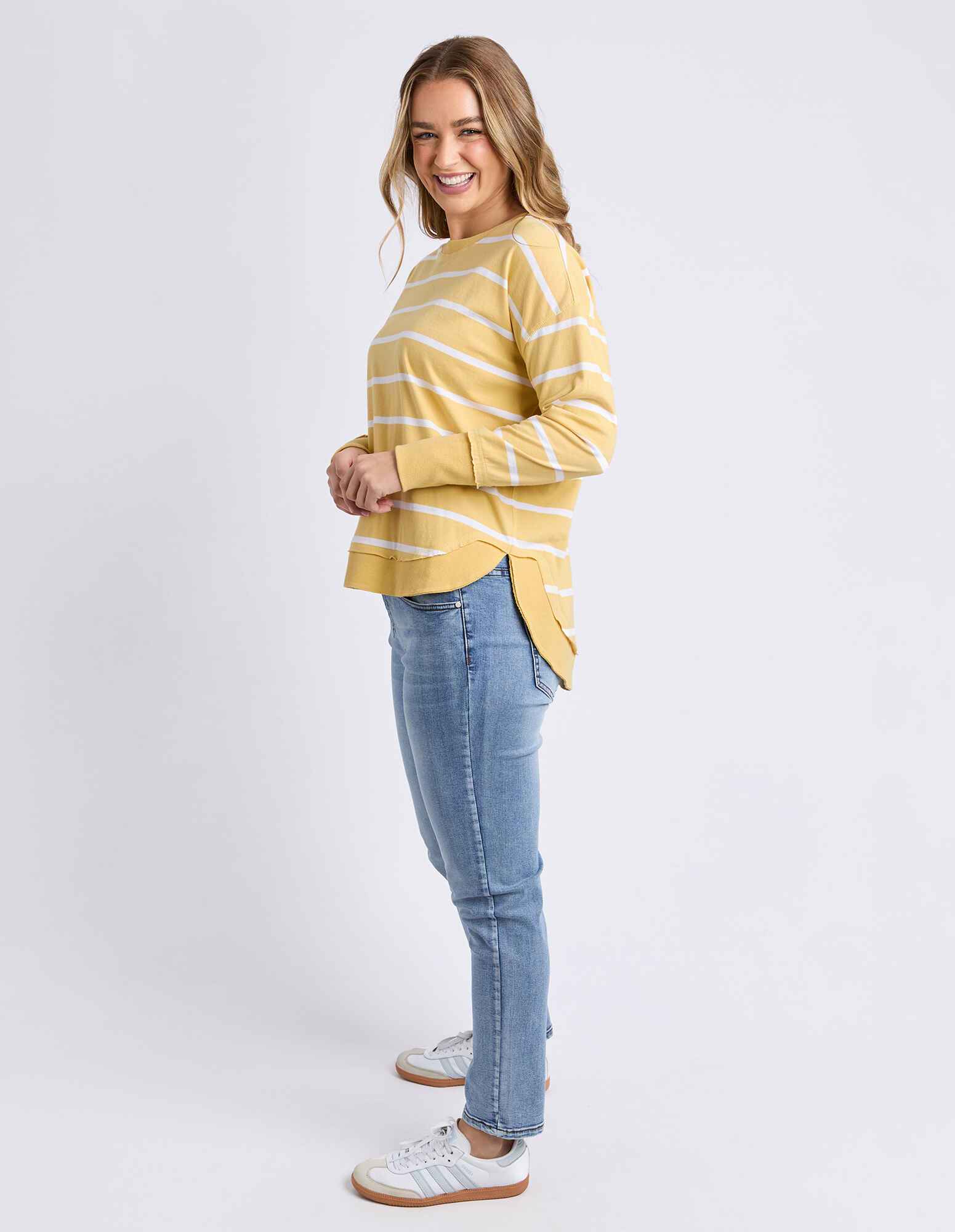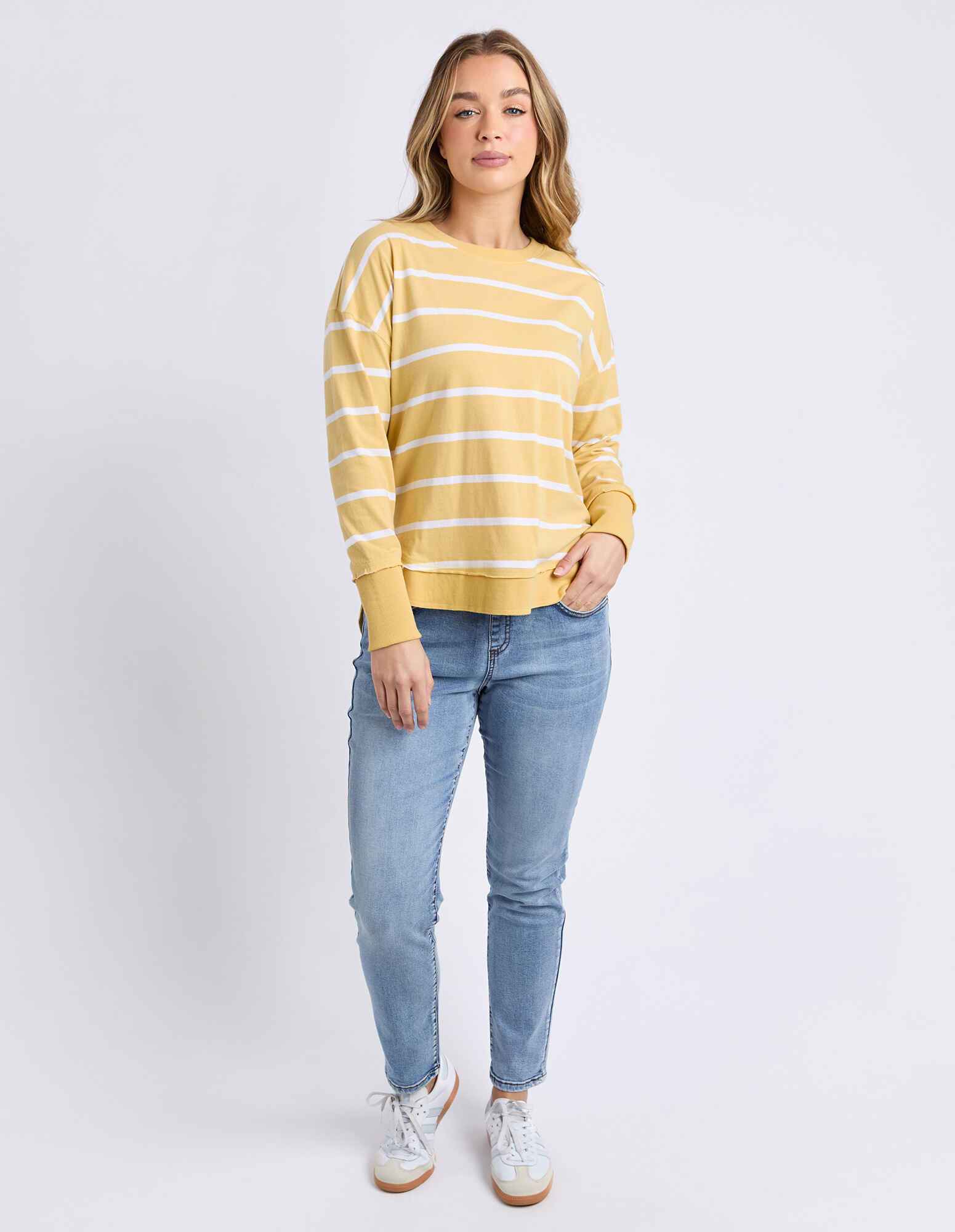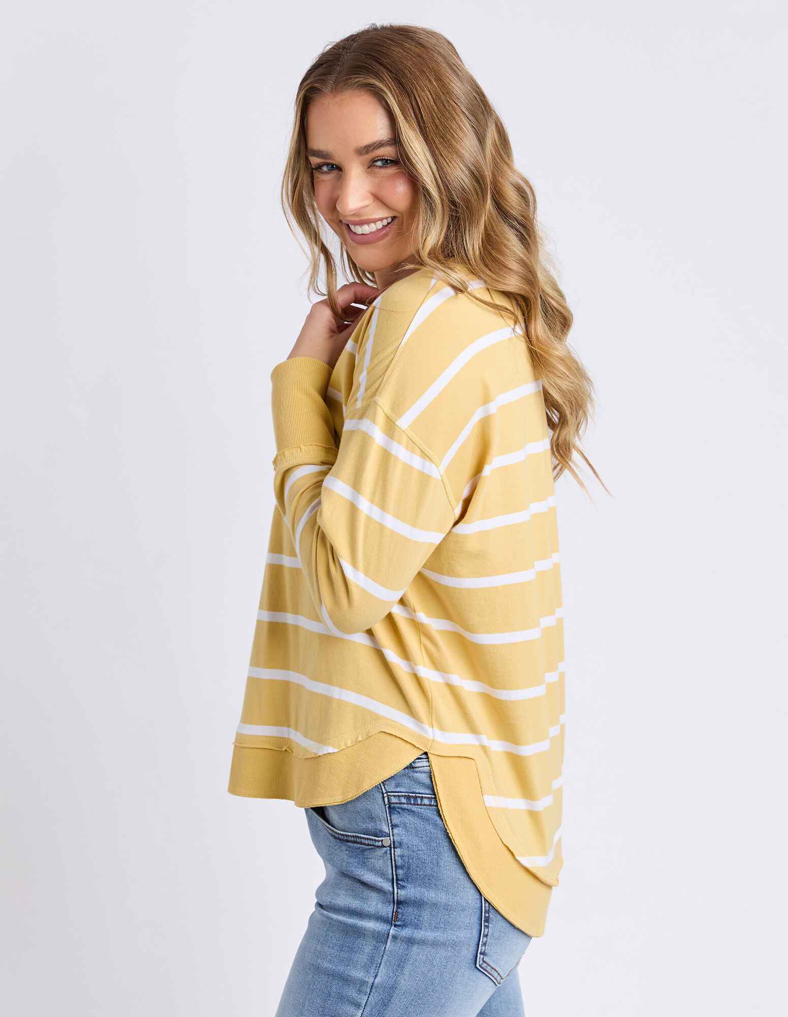 A new crew to the Foxwood range the Farrah Long Sleeve in 100% Fresh Pima Cotton features a classic crew neckline and raw edge detail. This relaxed fit jumper is an easy everyday wear.