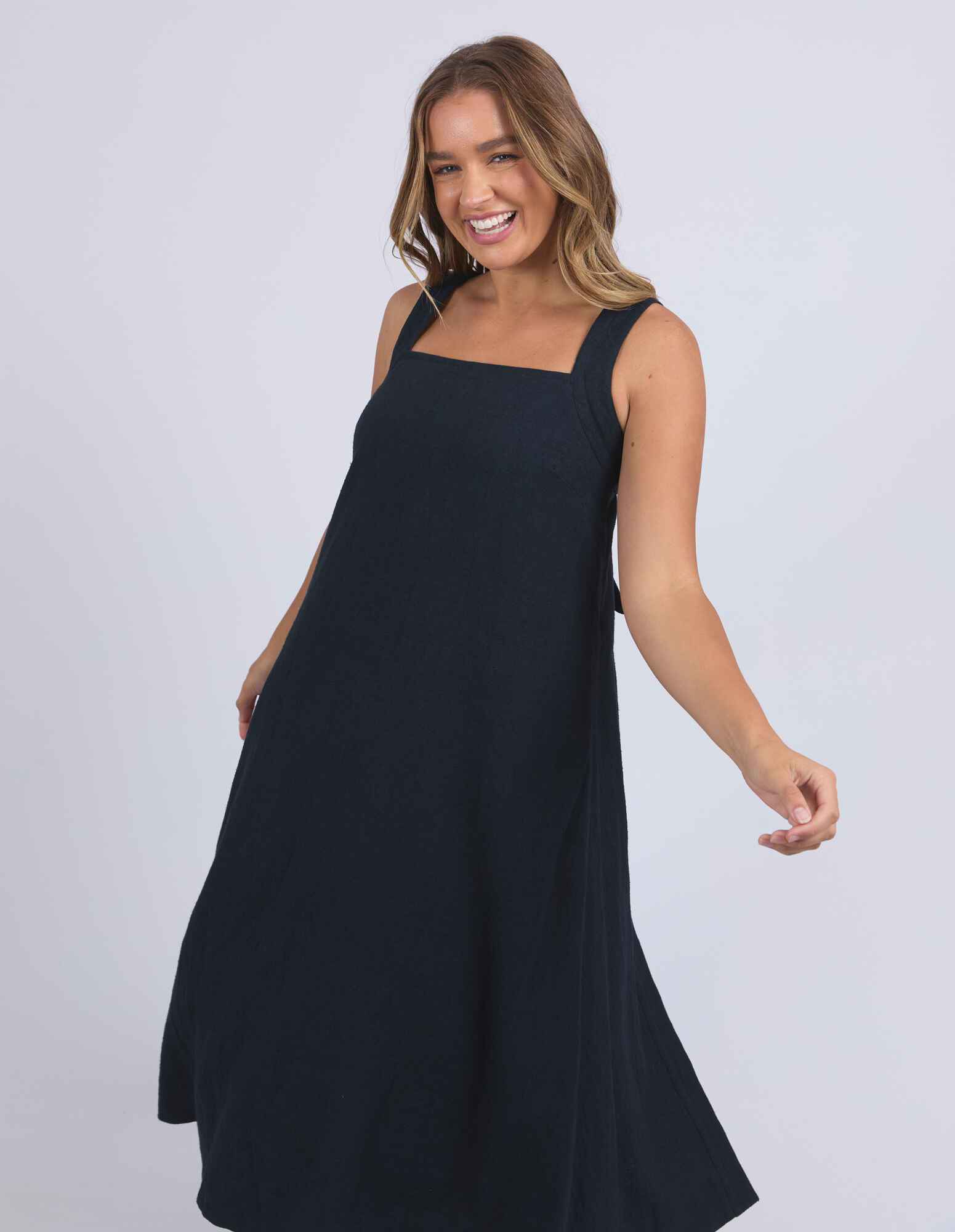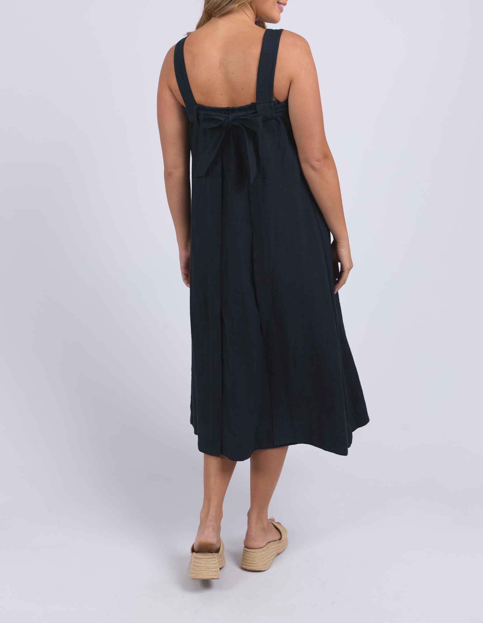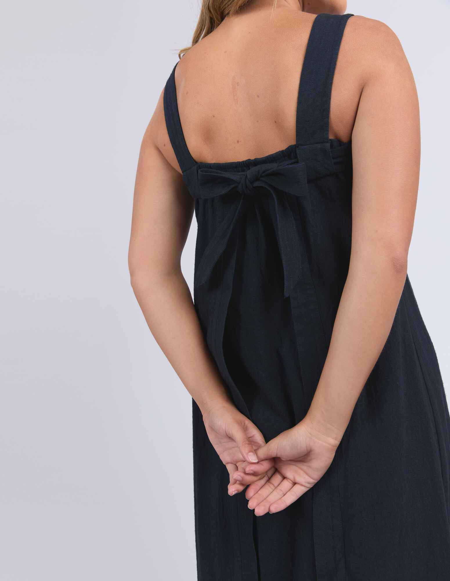 Easygoing with a playful twist. The Lourdes Dress features a relaxed fit with an open back, layered underlay, and a sweet back tie detail that brings the charm. Light, floaty and full of personality - this one's made for warm days and fun plans. 55% Linen 44% Viscose
