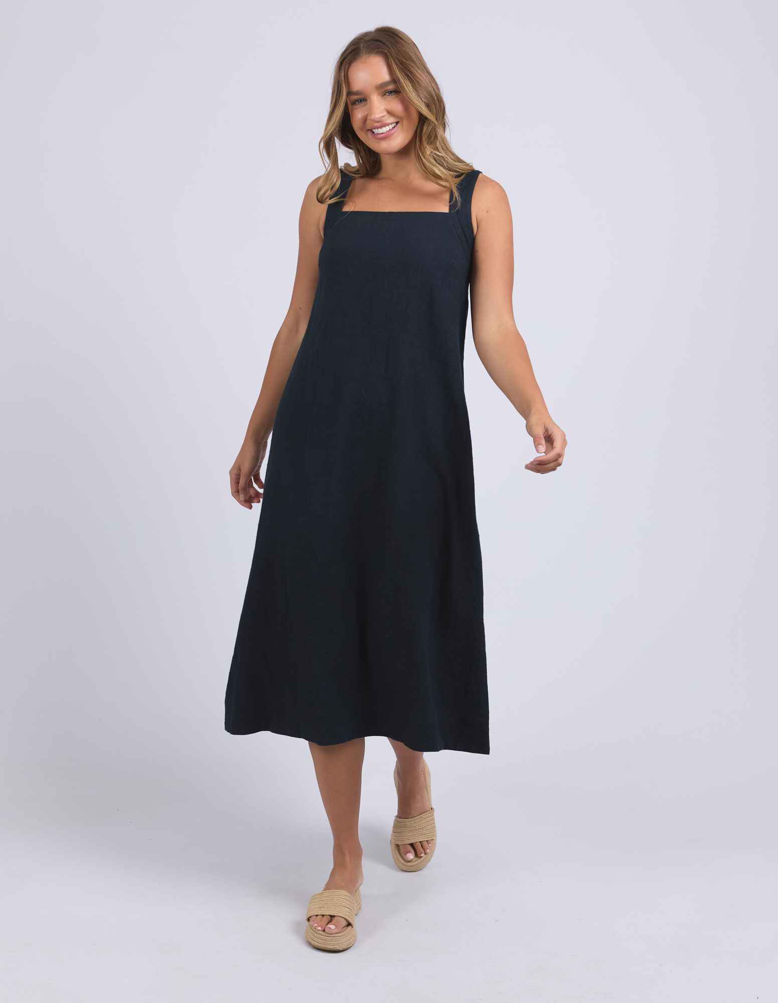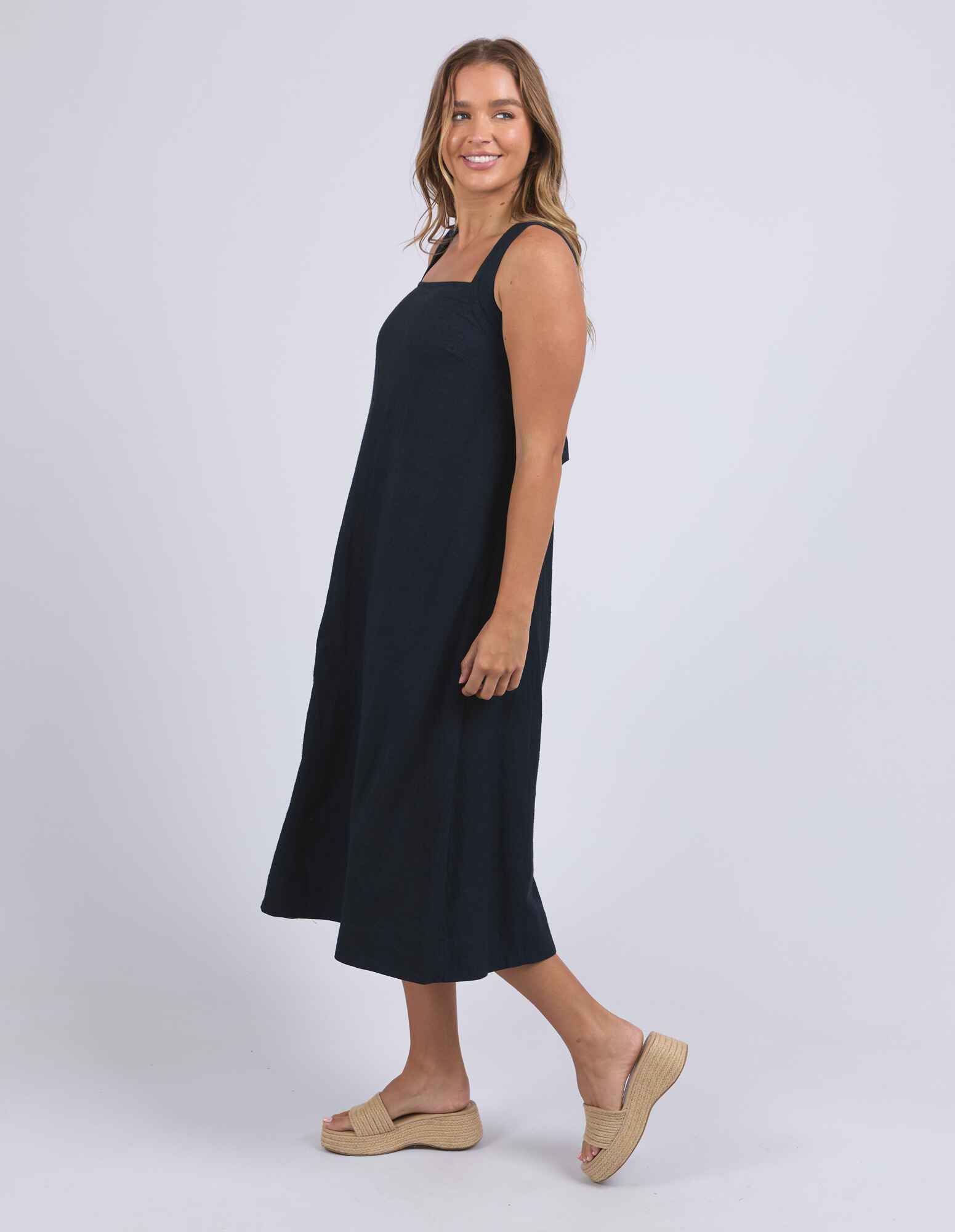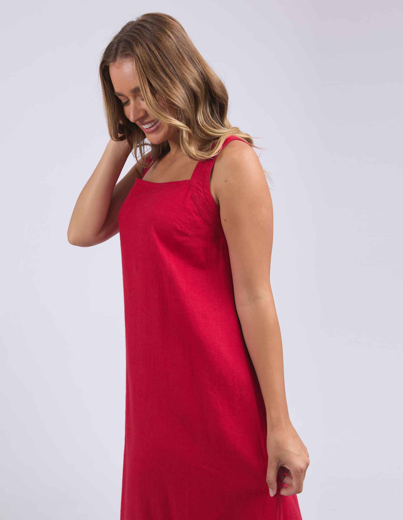 Easygoing with a playful twist. The Lourdes Dress features a relaxed fit with an open back, layered underlay, and a sweet back tie detail that brings the charm. Light, floaty and full of personality - this one's made for warm days and fun plans. 55% Linen 44% Viscose