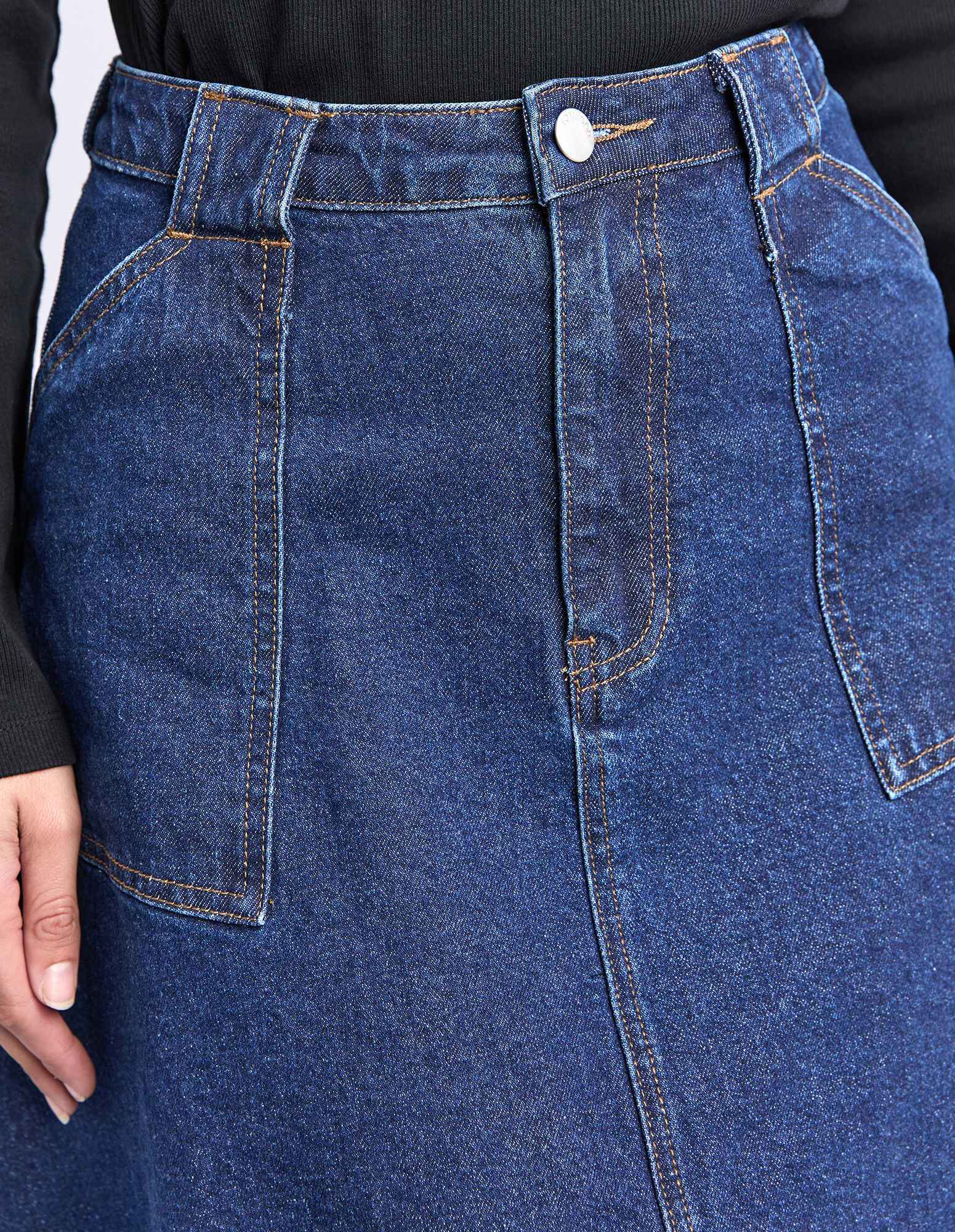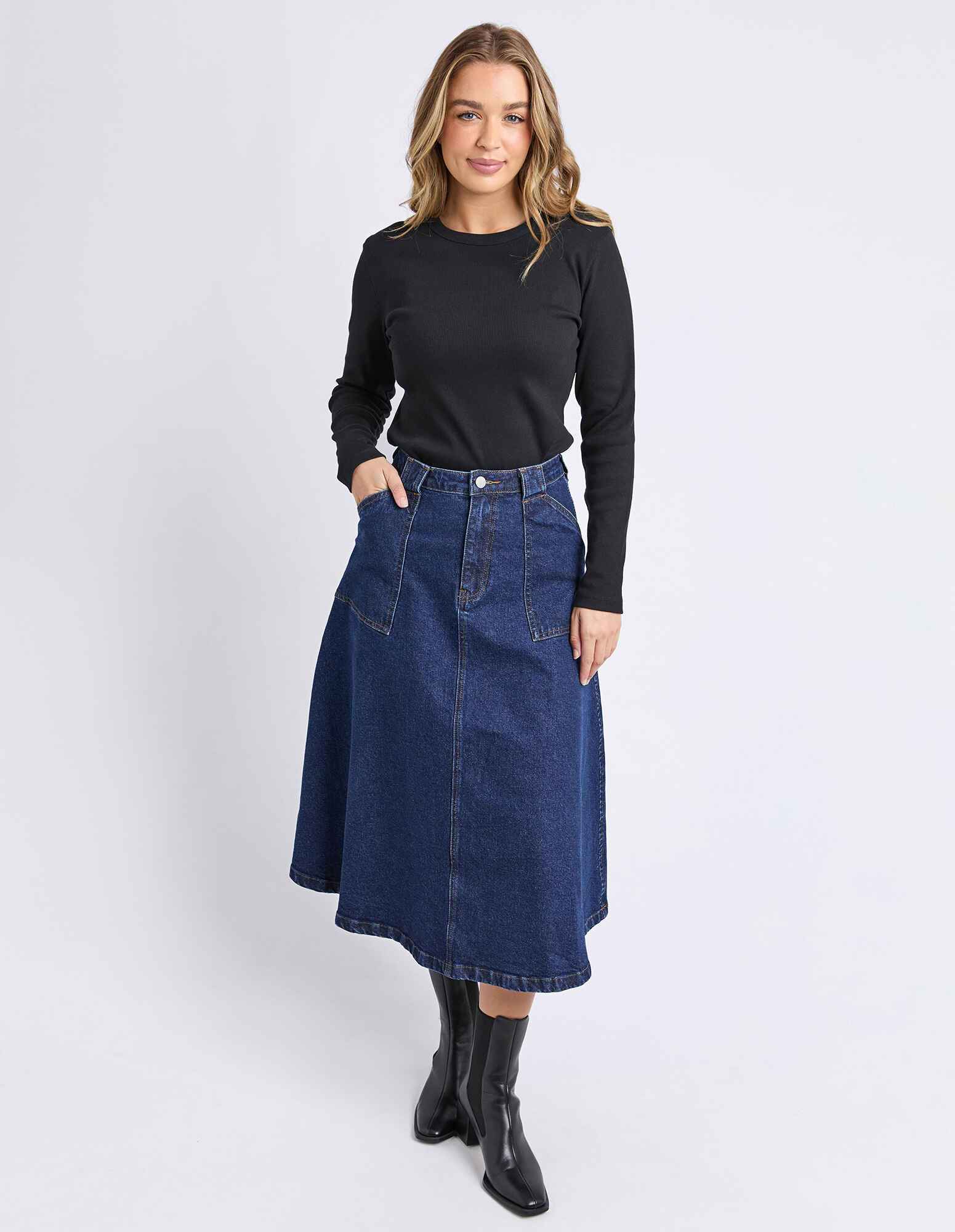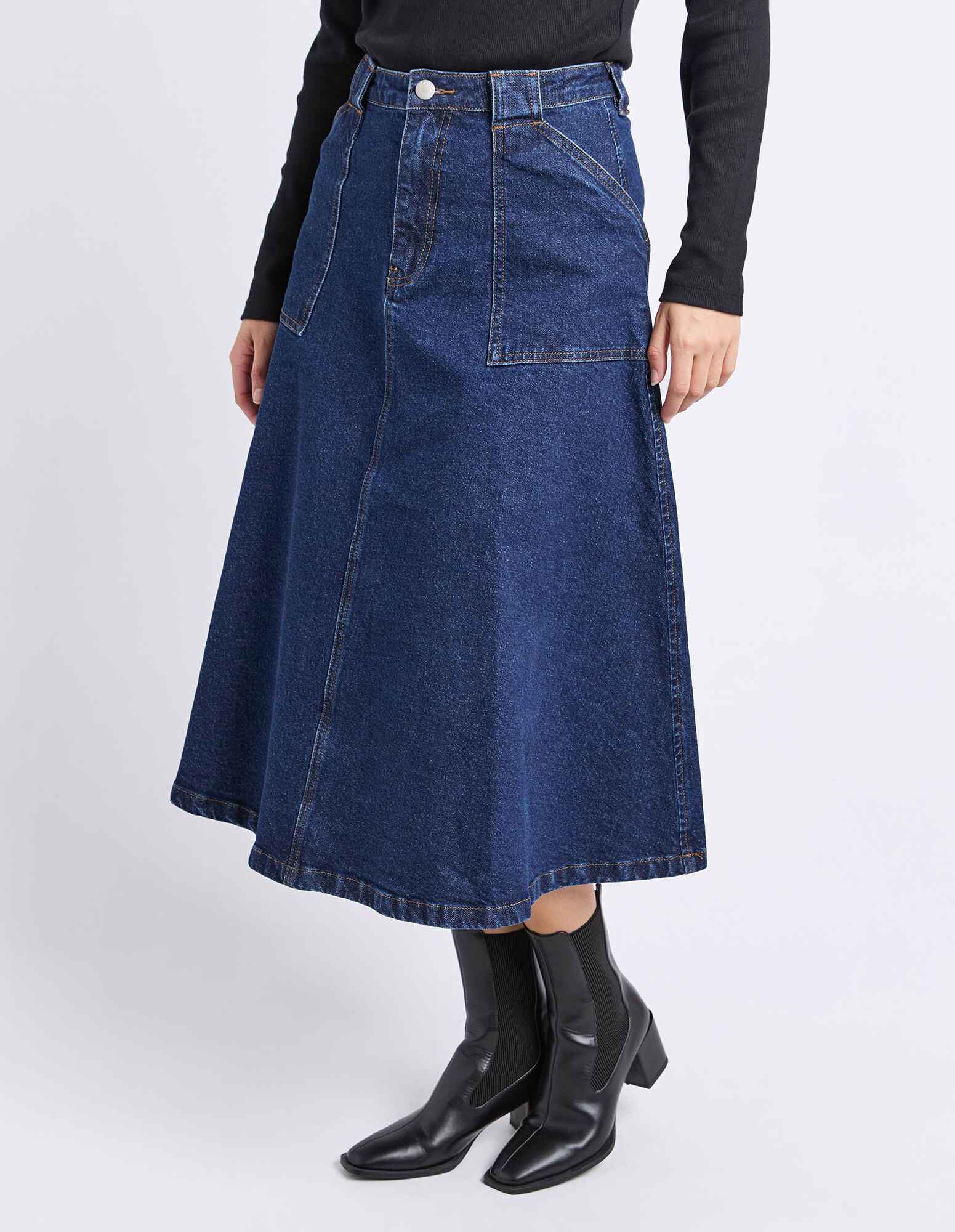 The Potter Skirt brings a modern spin to classic denim with its full, easy-moving shape and clean front fly. Designed with front patch pockets and just the right amount of stretch, it’s made for all-day comfort without losing structure. Style it with boots or sneakers and let it do the talking.
