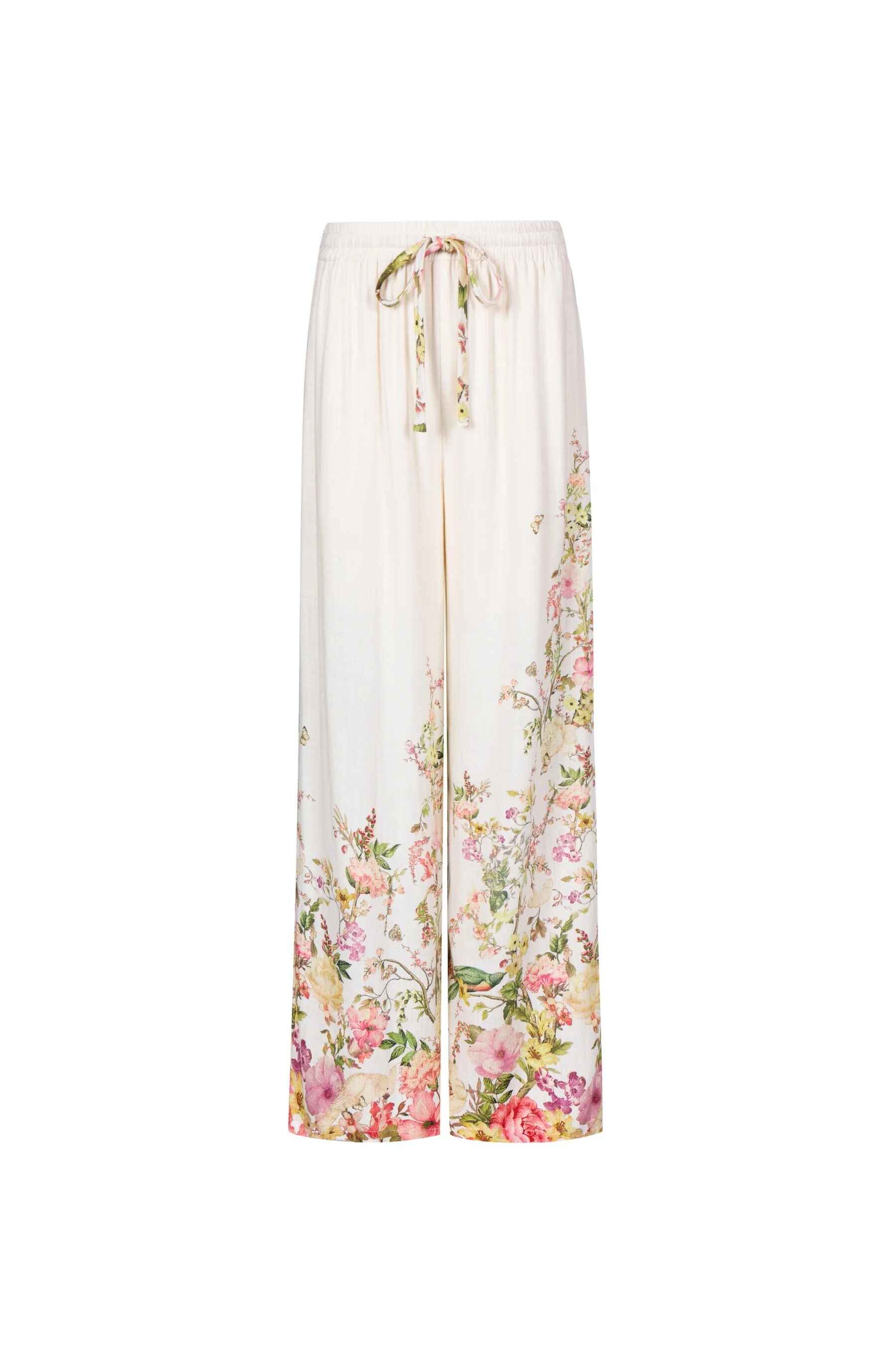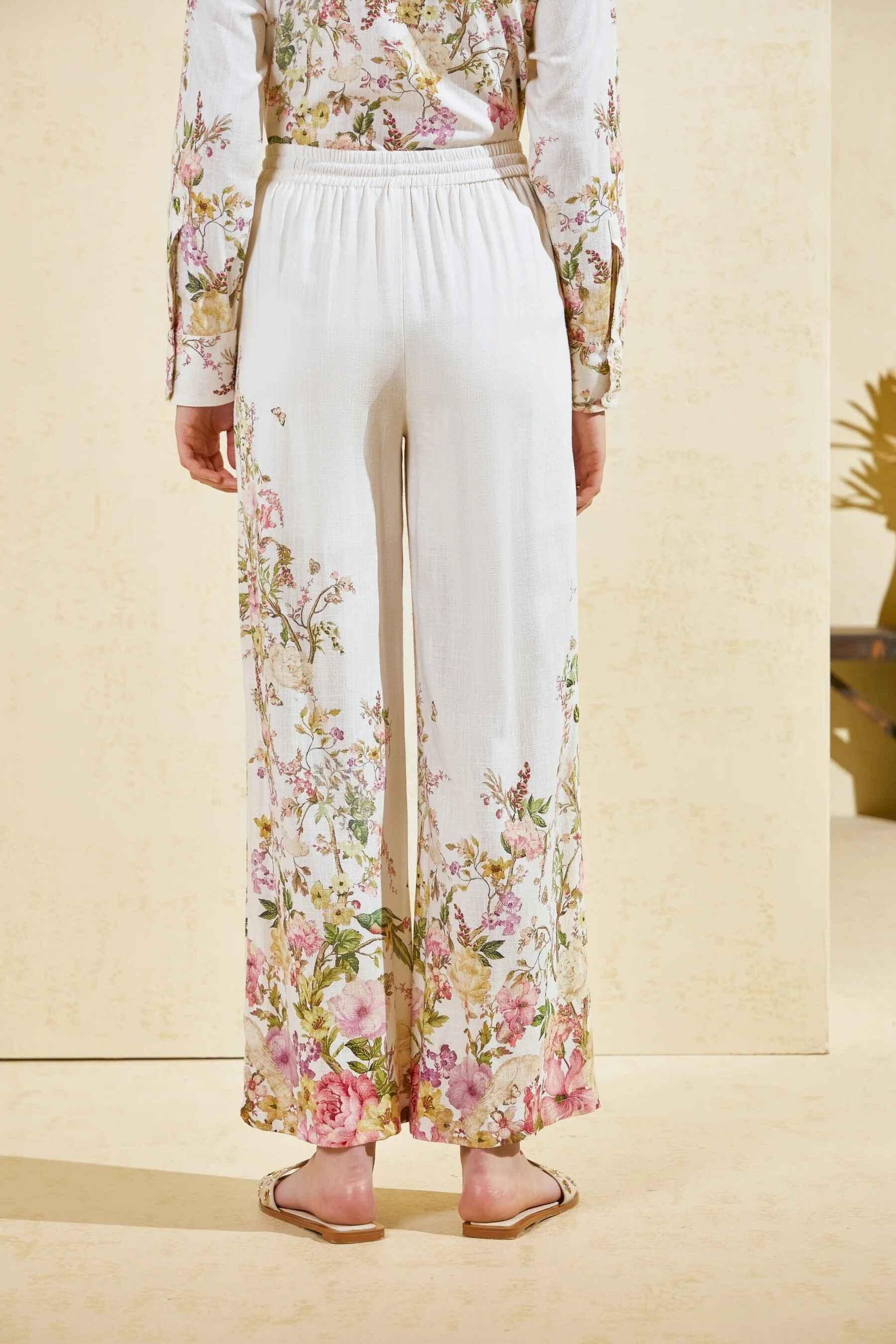Rosie shows a pair of beautifully delicate wide-leg pants crafted from a cotton and linen blend, giving them a soft, breathable texture with a hint of natural structure. The base color is a creamy, off-white ivory, offering a serene and elegant canvas.The waistband is elasticized for comfort and finished with a drawstring tie made from matching floral-patterned fabric, allowing for a customizable fit while maintaining the relaxed, graceful vibe. The legs are flowy and loose, perfect for creating a breezy silhouette that moves gracefully with the body.-Lined
