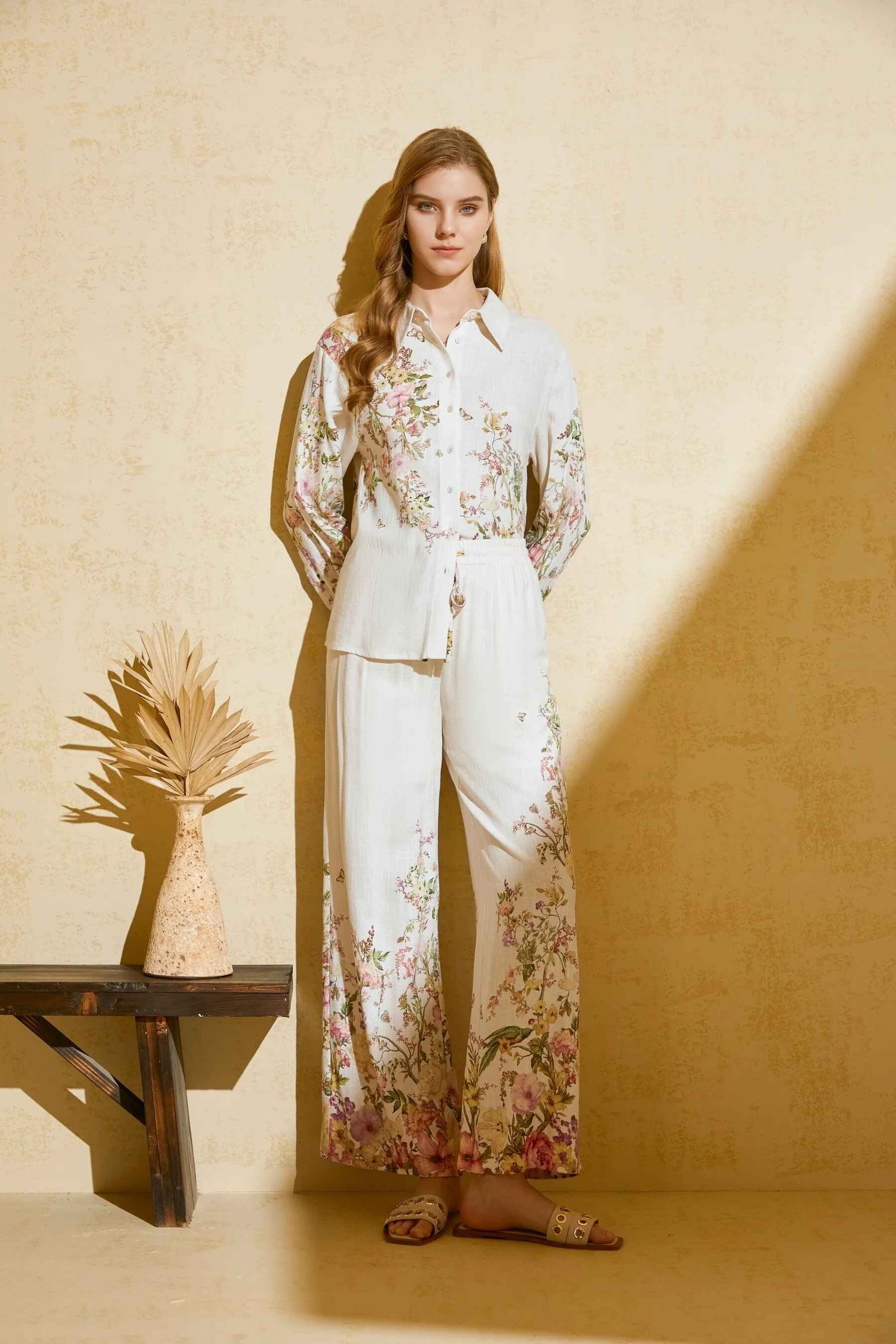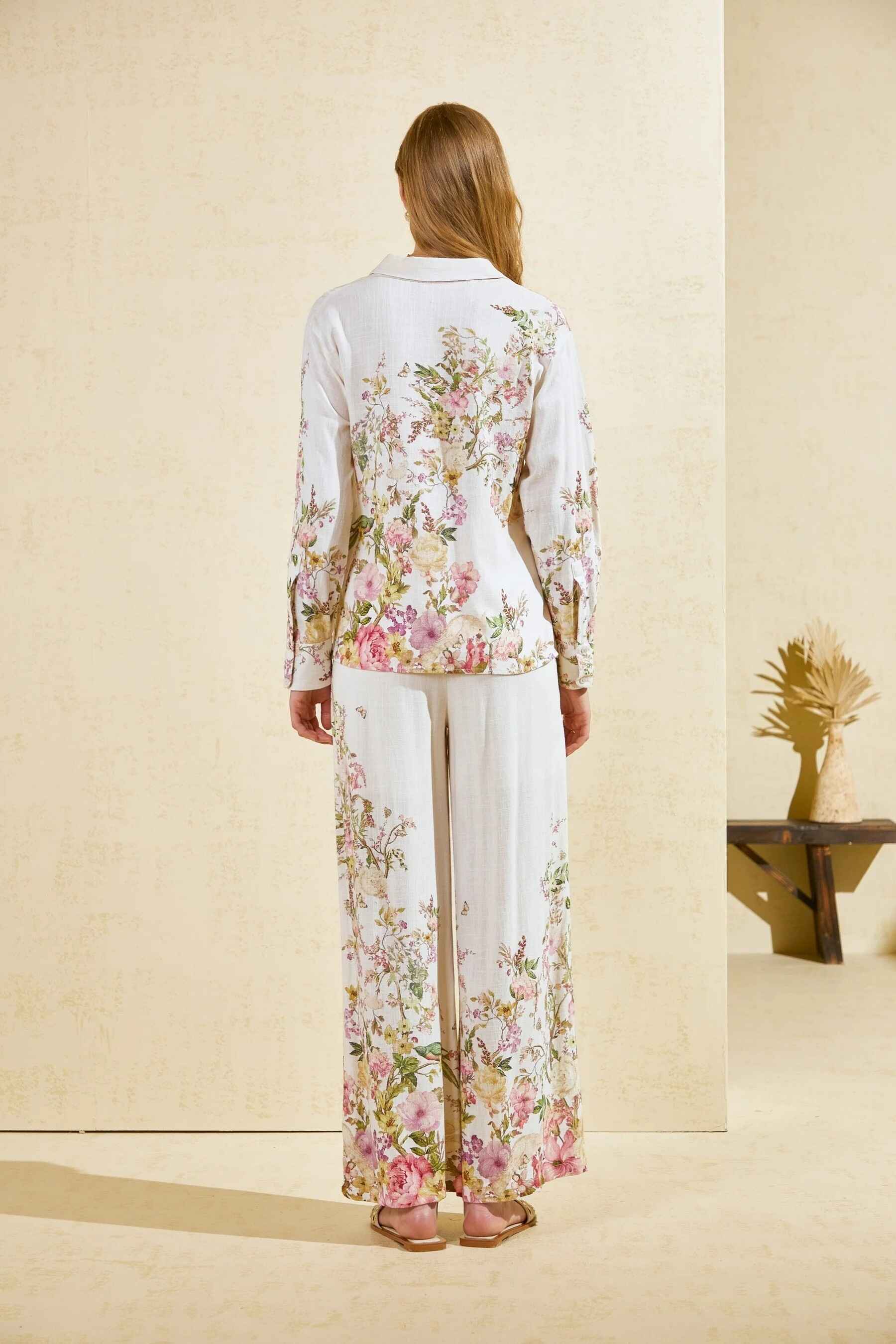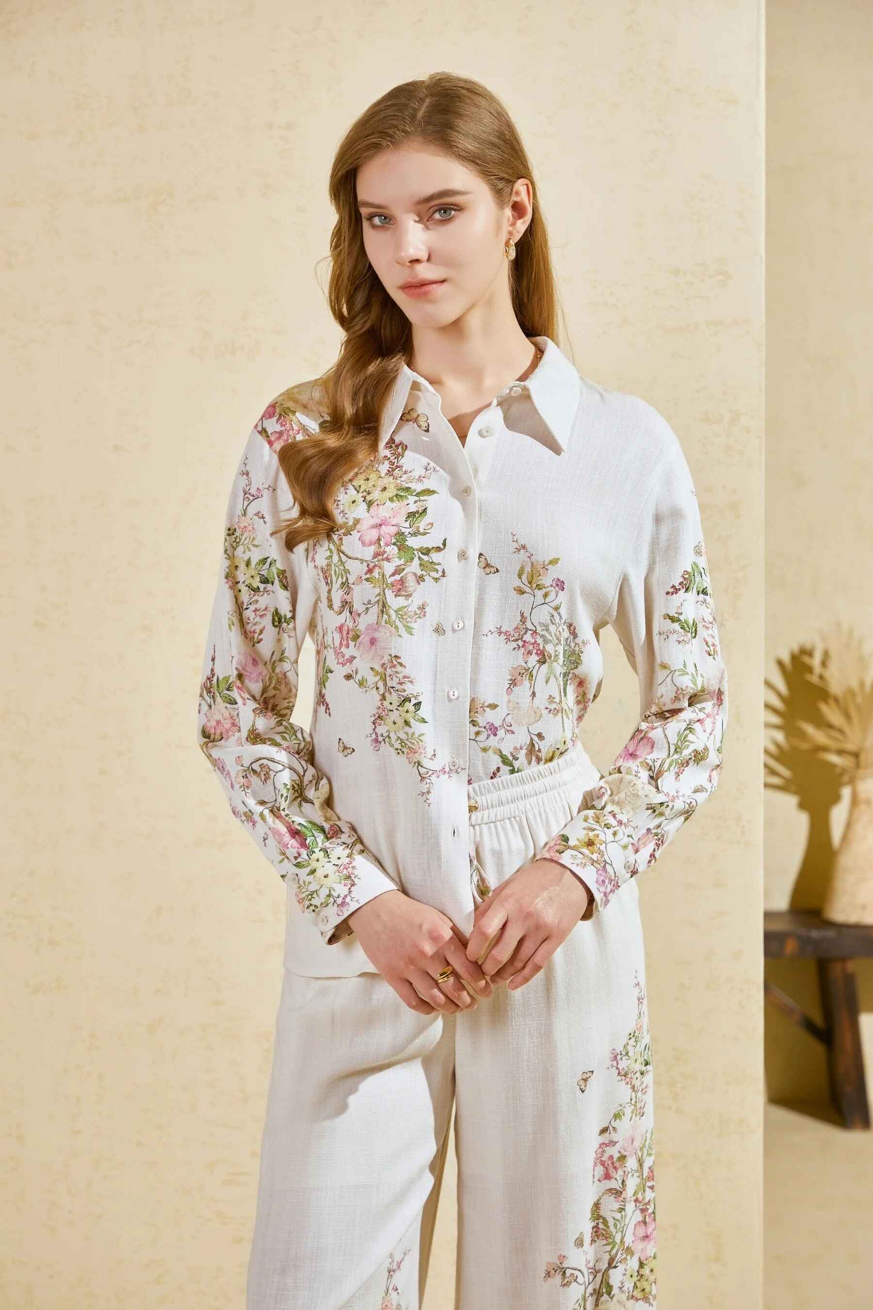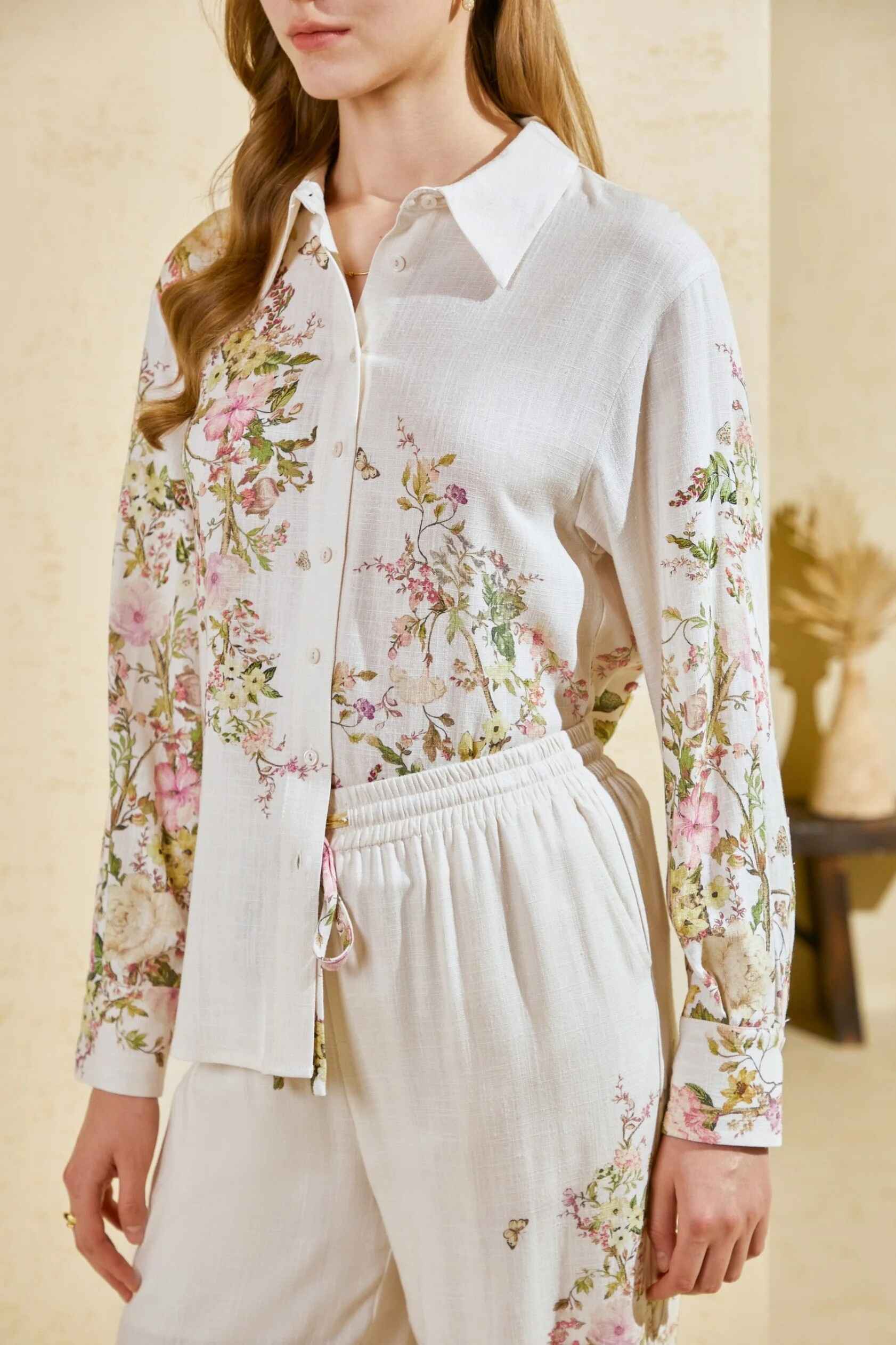 Rosie shows an exquisitely elegant button-down shirt made from a luxurious cotton and linen blend, offering a perfect balance between soft breathability and refined structure. The floral arrangement looks almost like a natural draping of wildflowers, punctuated by tiny details such as fluttering butterflies for an added touch of whimsy and lightness. The print placement feels airy and artistic, never overwhelming, giving the shirt a painterly, almost watercolor effect.