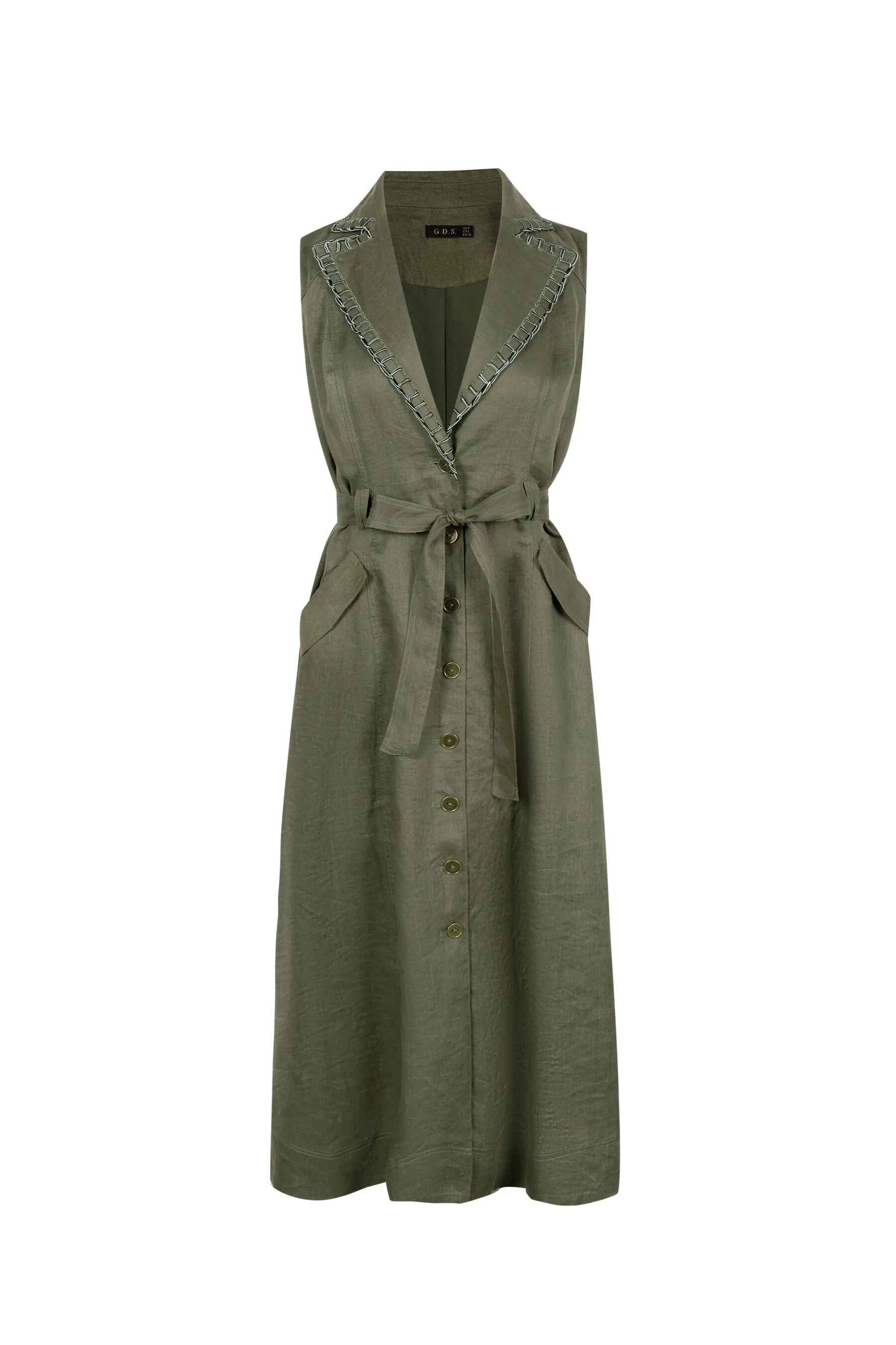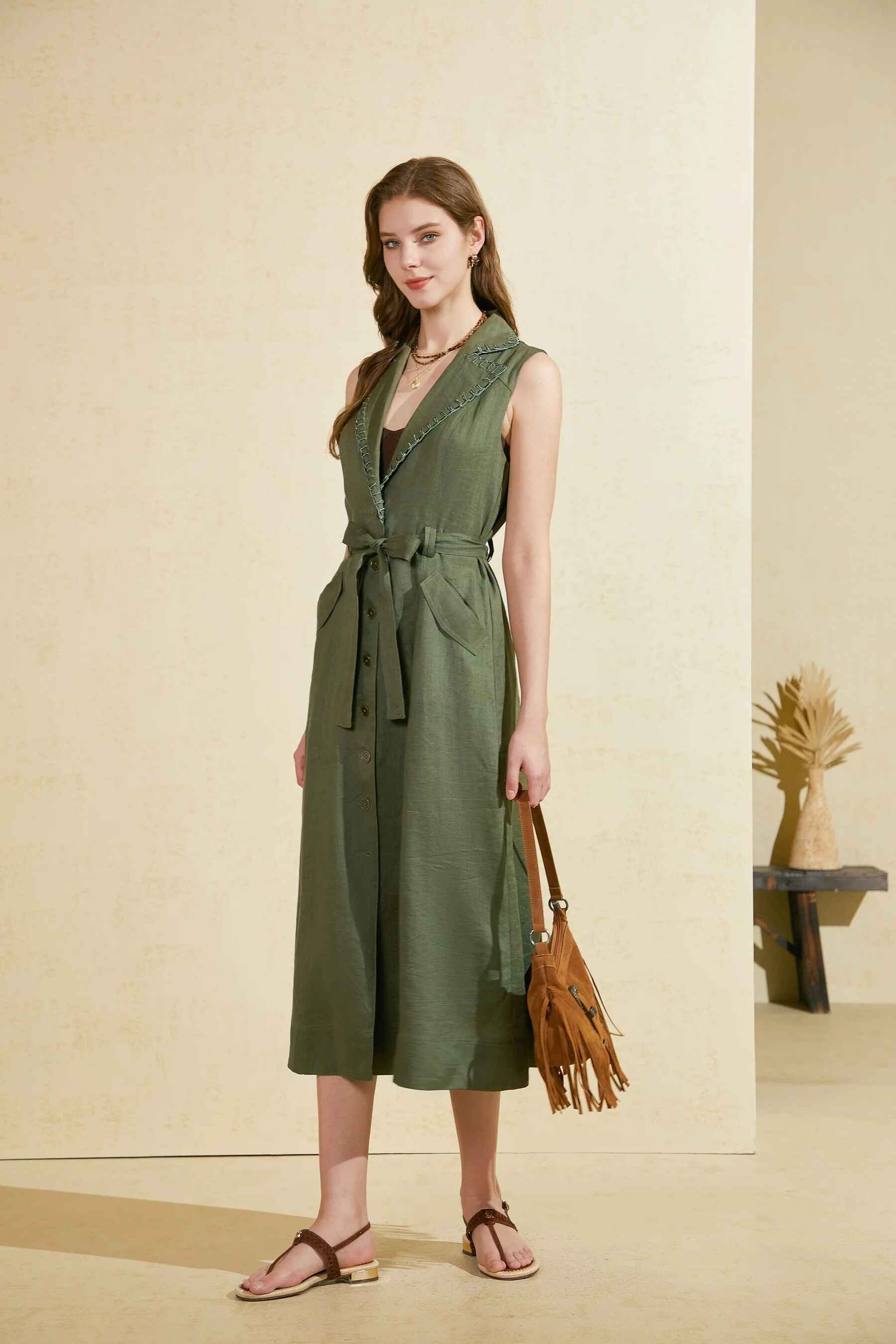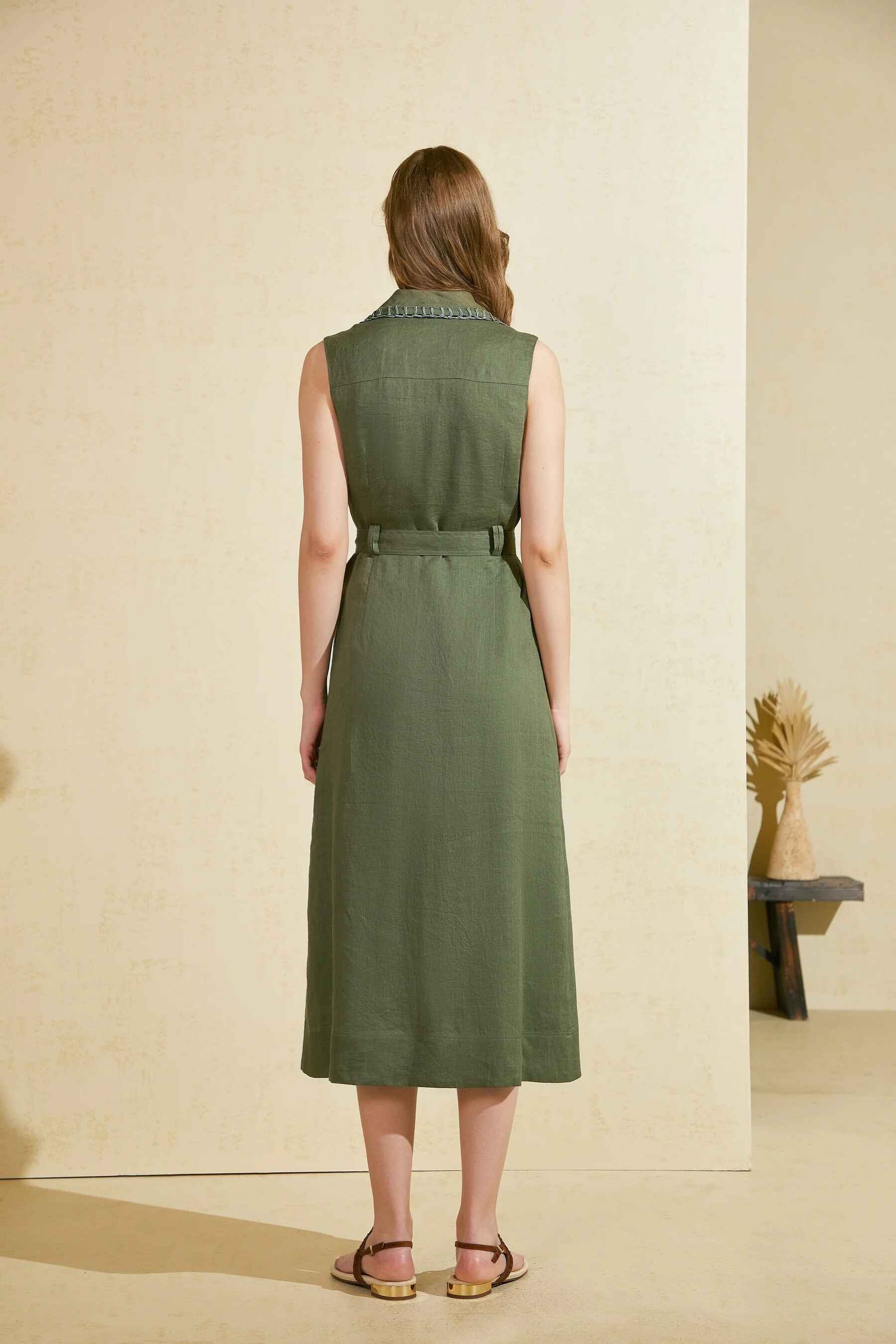 Matte with a slightly crisp, structured drape, characteristic of linen. Intricate oversized hand-stitched detailing outlines the collar in a light contrasting thread, giving it a handcrafted, artisanal edge. Samuel dress strikes a balance between structured polish and relaxed sophistication—ideal for those who appreciate clean lines with thoughtful details. - Lined