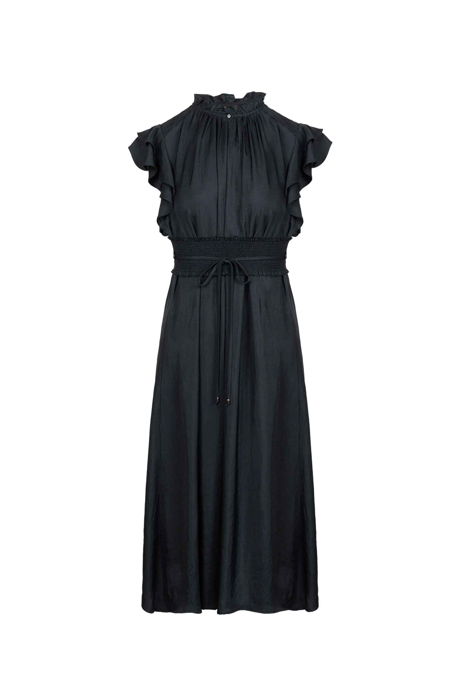 Sebastian shows a women's dress made of acetate fabric, giving it a smooth, fluid drape with a subtle sheen, enhancing its refined and silky appearance. Short flutter sleeves with layered ruffle edges, creating a feminine and airy movement. Elastic smocked waist panel with fine shirring, cinching the waist comfortably while adding texture.