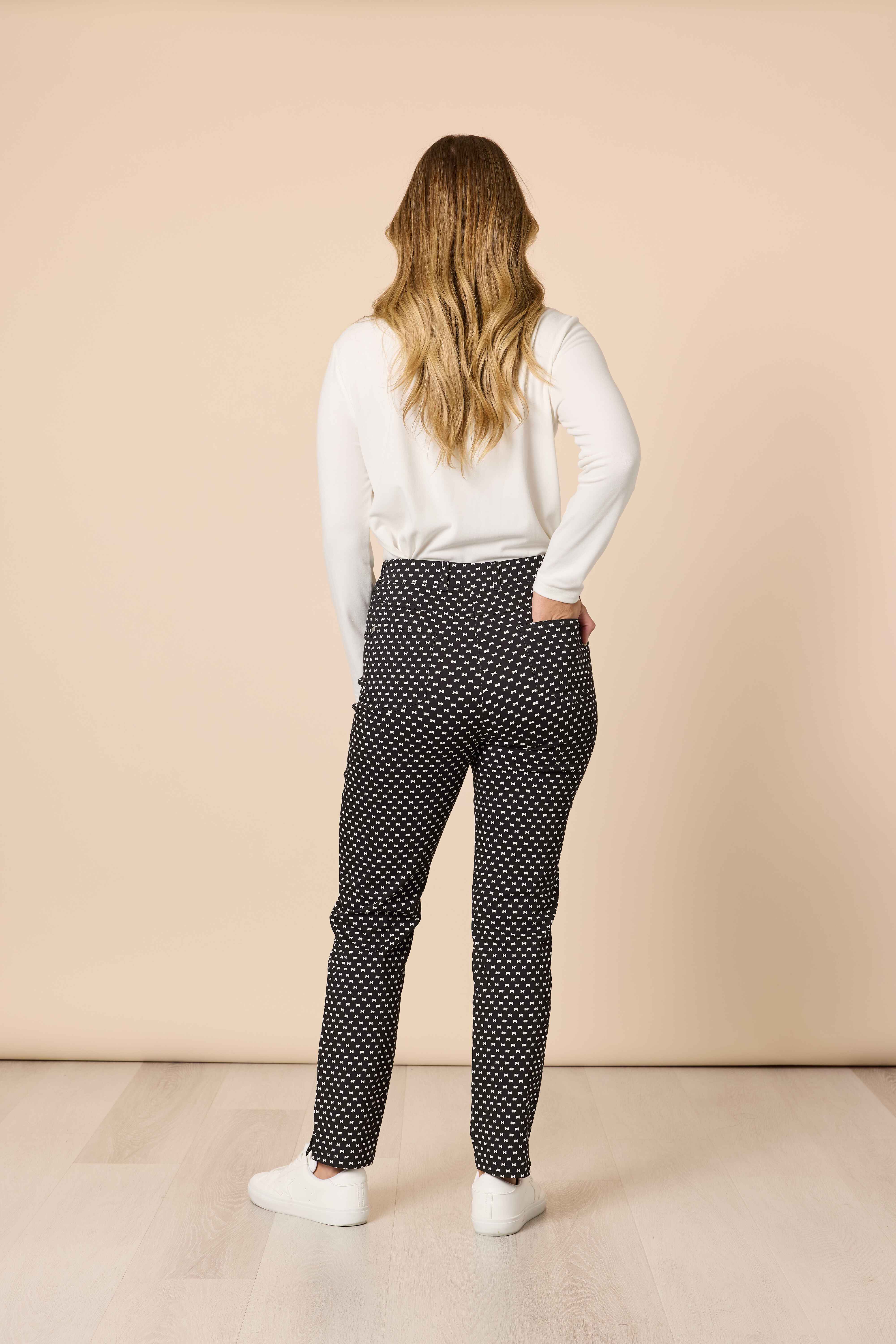 The Bow Tie Print Slim Leg Pant brings a playful yet polished twist to everyday dressing.Designed with a sleek, slim-leg silhouette, these pants offer a flattering shape that’s easy to style for both casual and elevated looks.