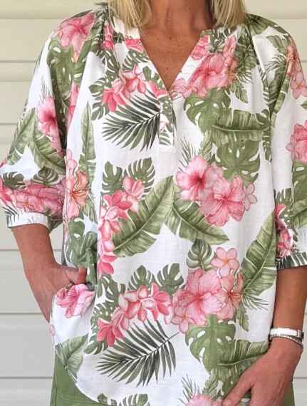 Featuring a crisp white base with lush green leaves and vibrant pink florals, this relaxed-fit blouse is perfect for warm-weather days and effortless dressing.