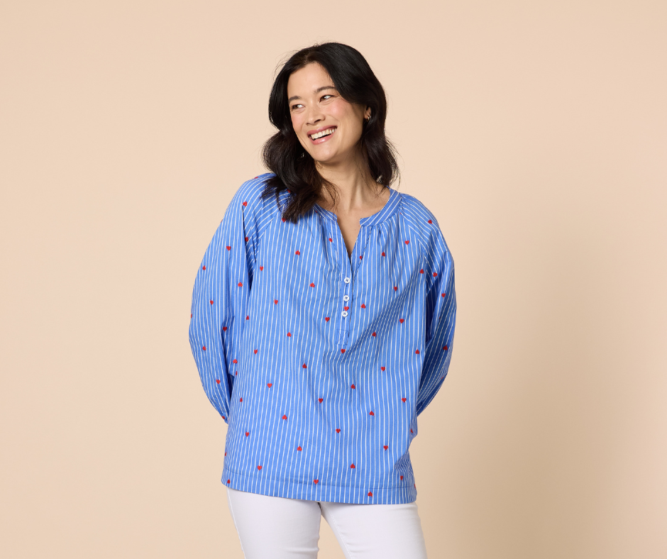 Crafted from a soft, breathable 100% cotton, this relaxed-fit blouse features a fresh blue-and-white stripe design adorned with delicate embroidered hearts for a playful, feminine feel.