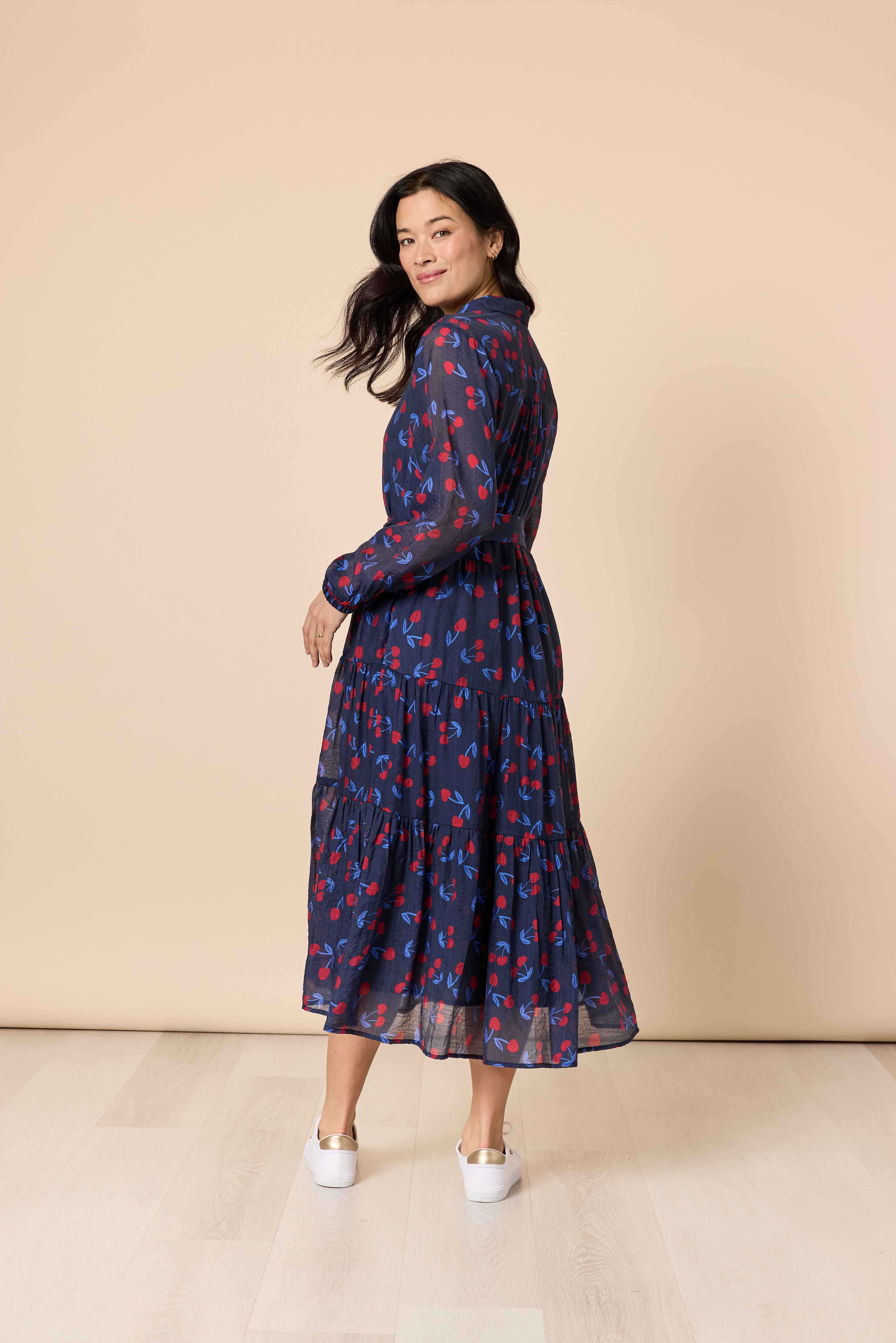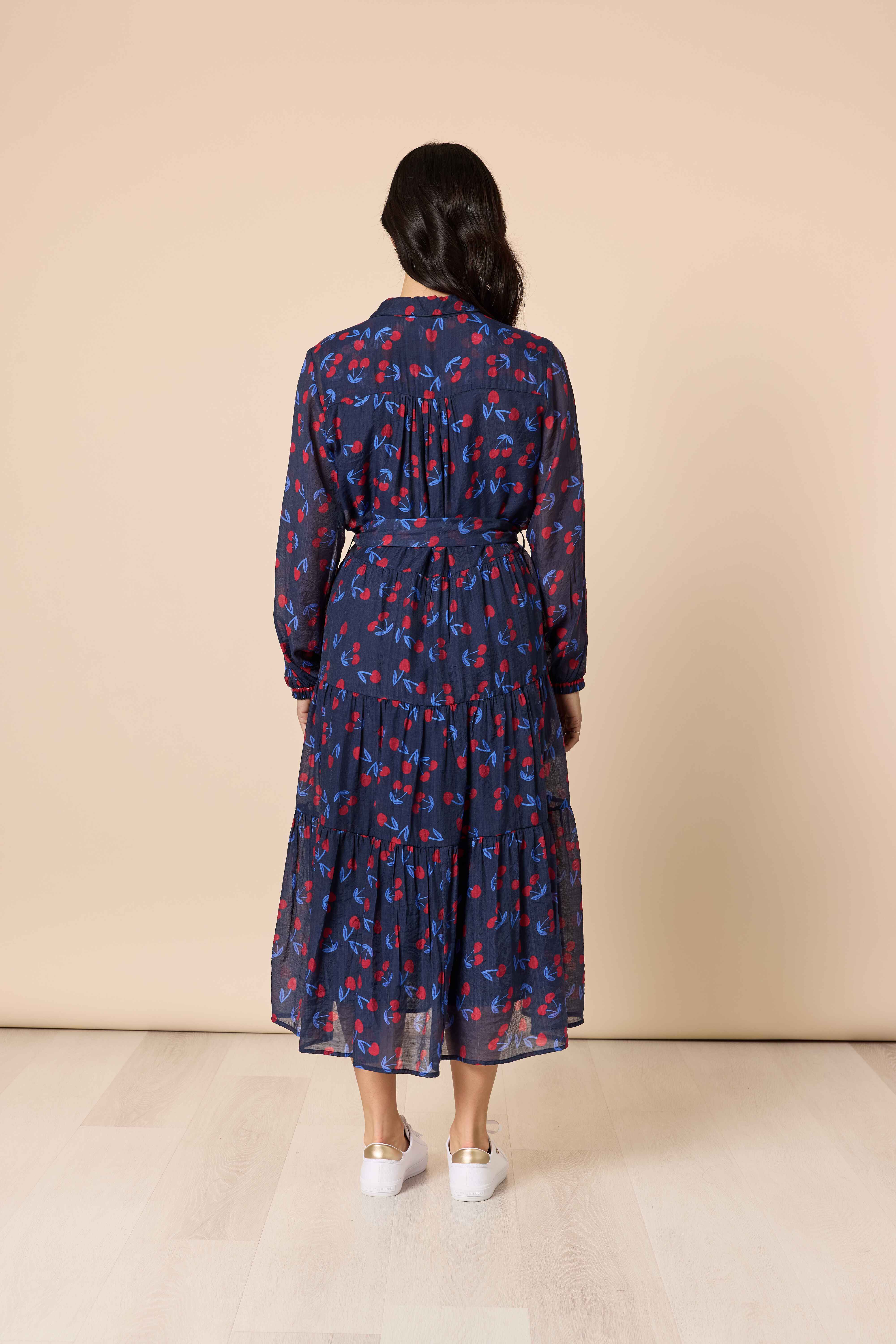 Featuring a soft sheer overlay adorned with a charming cherry print in navy and red, this dress blends playful femininity with timeless sophistication.