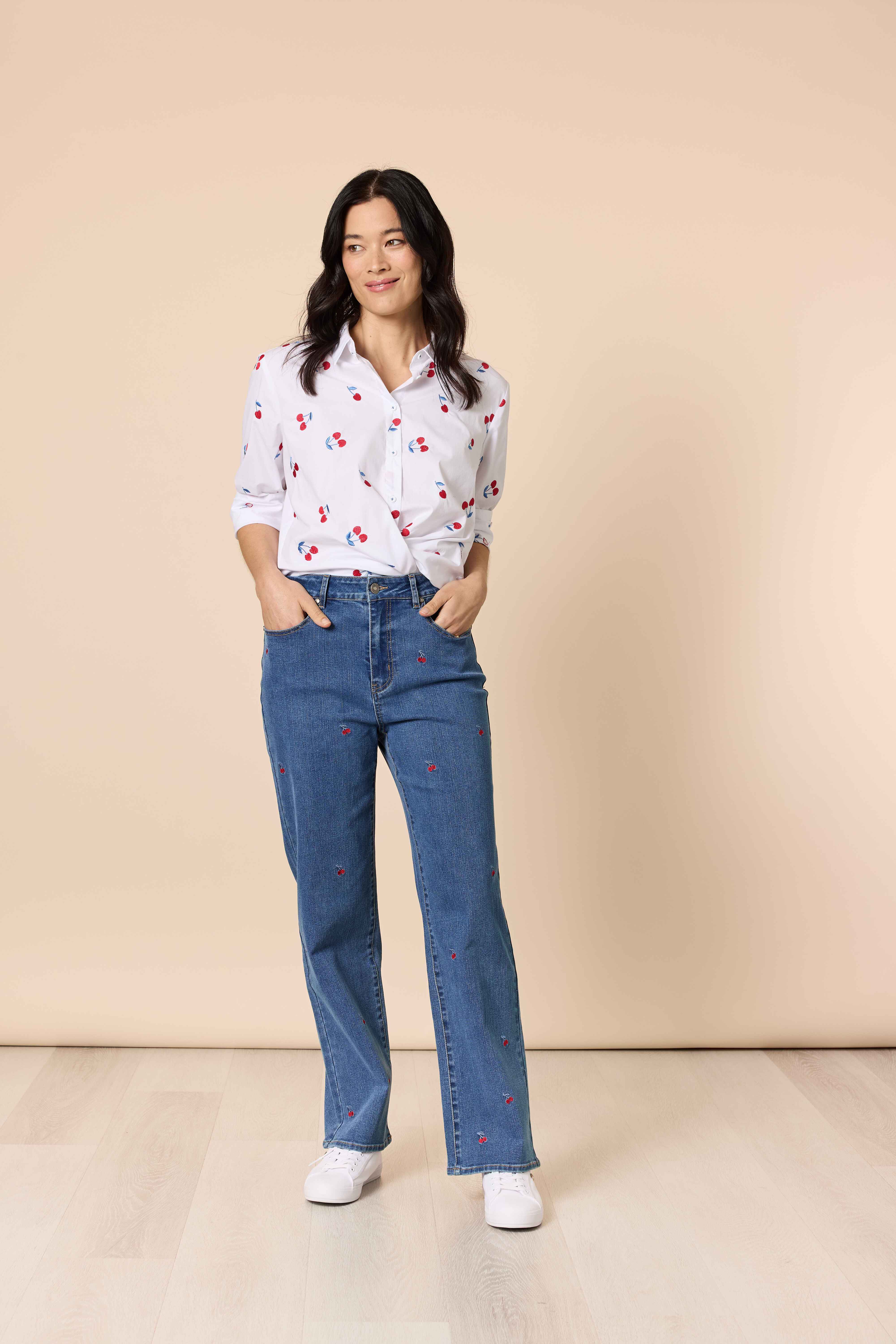 The charming cherry embroidery adds a pop of colour and personality, bringing a fresh, fun edge to a classic silhouette.