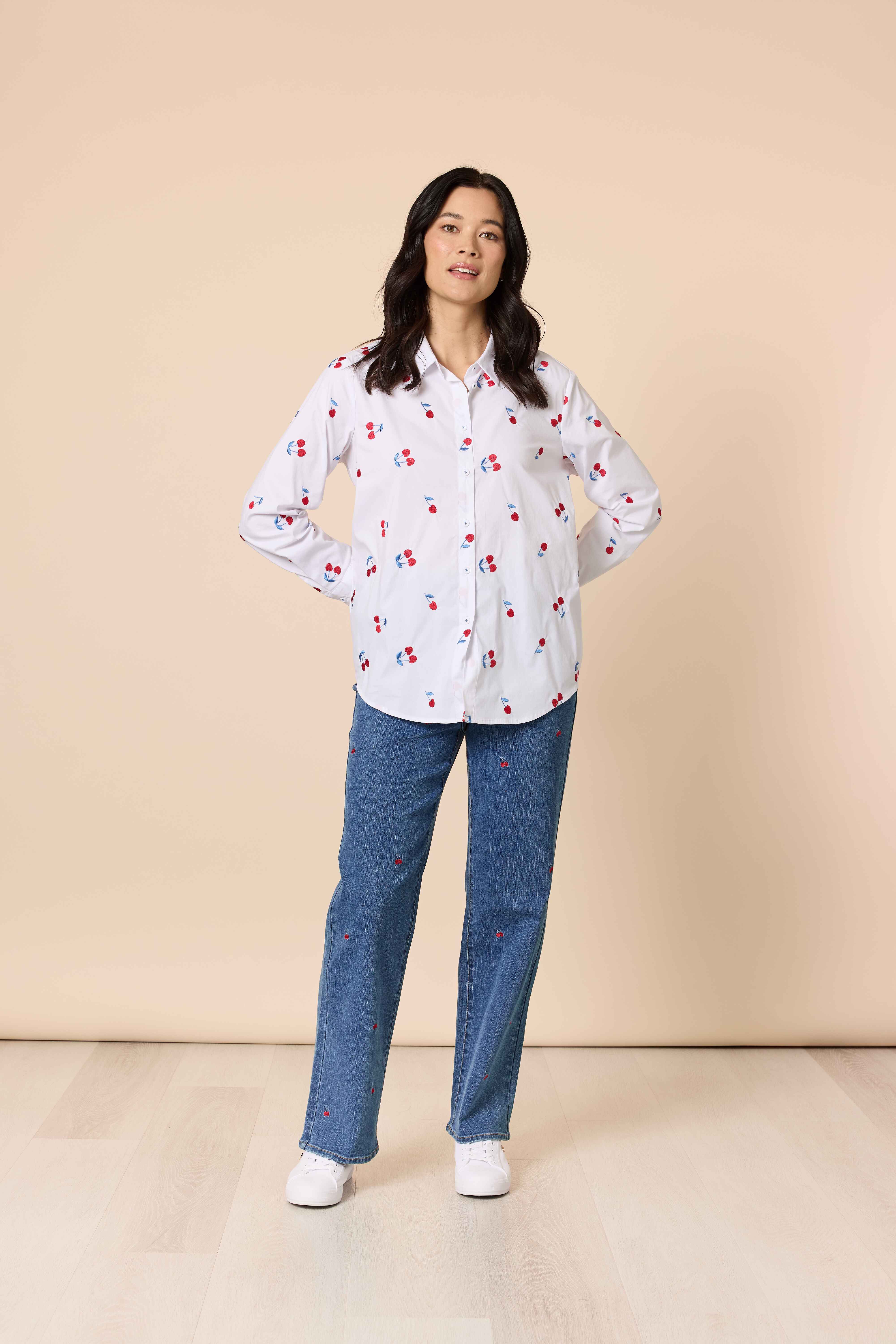 Add a playful twist to your wardrobe with the Embroidered Cherry Shirt.