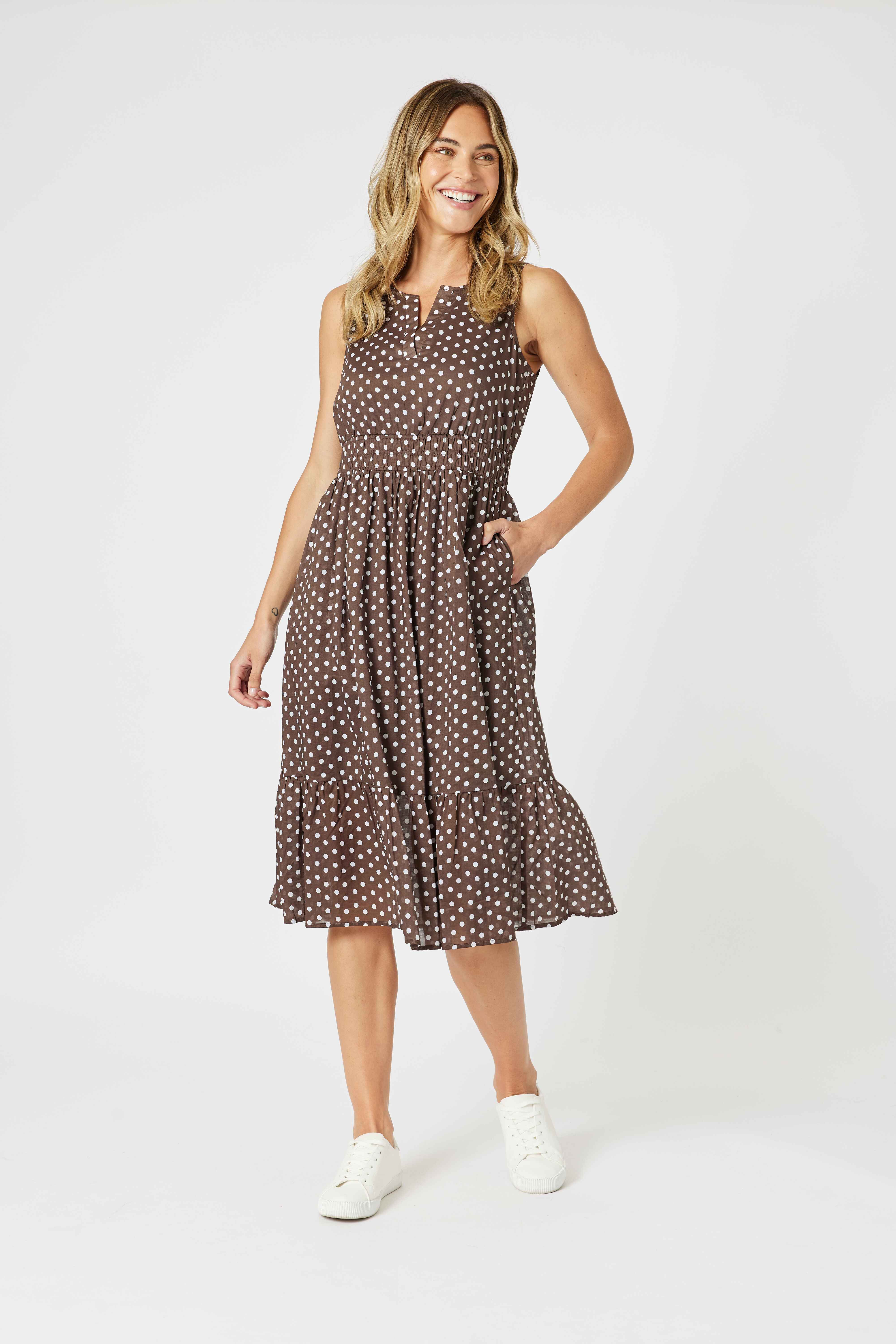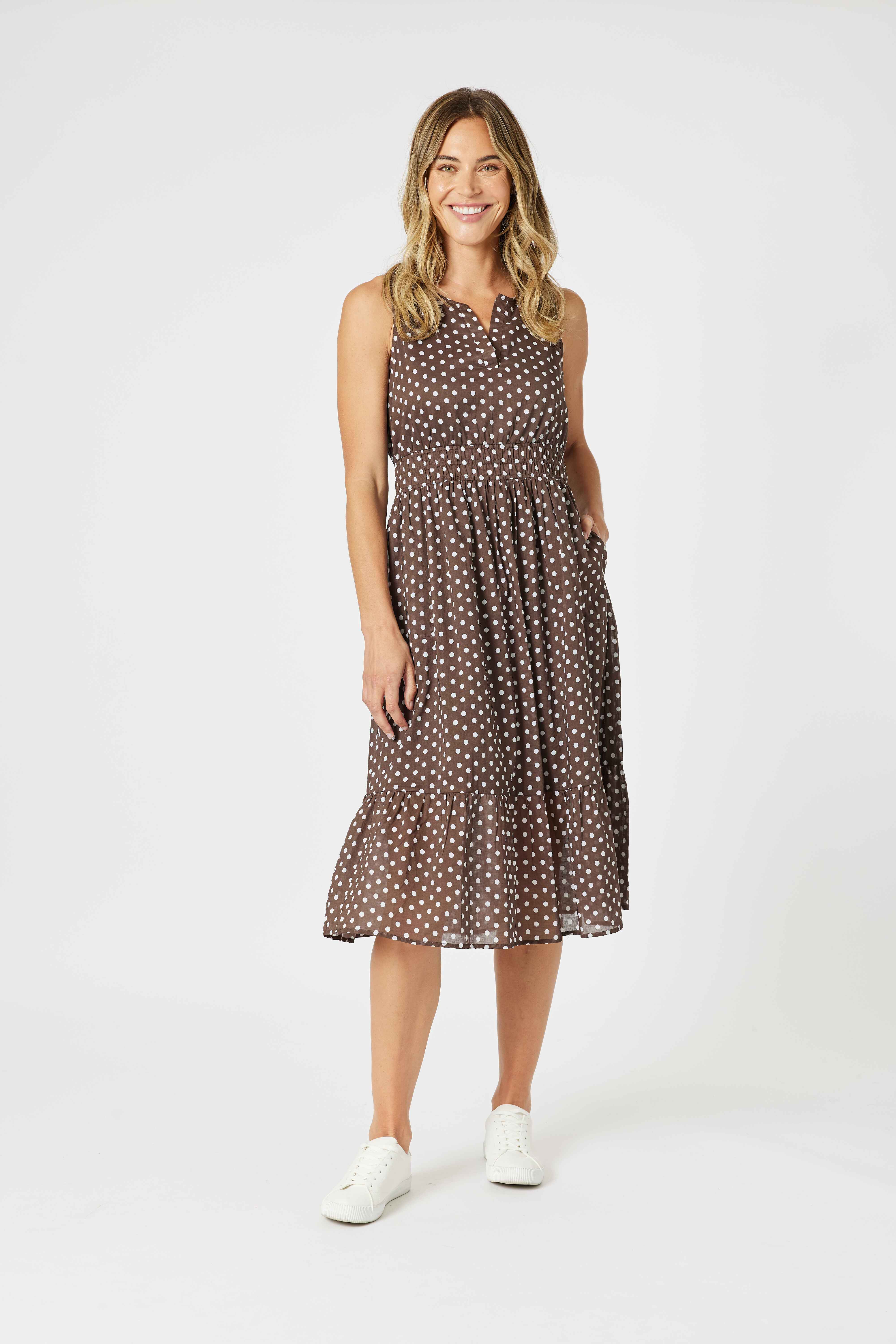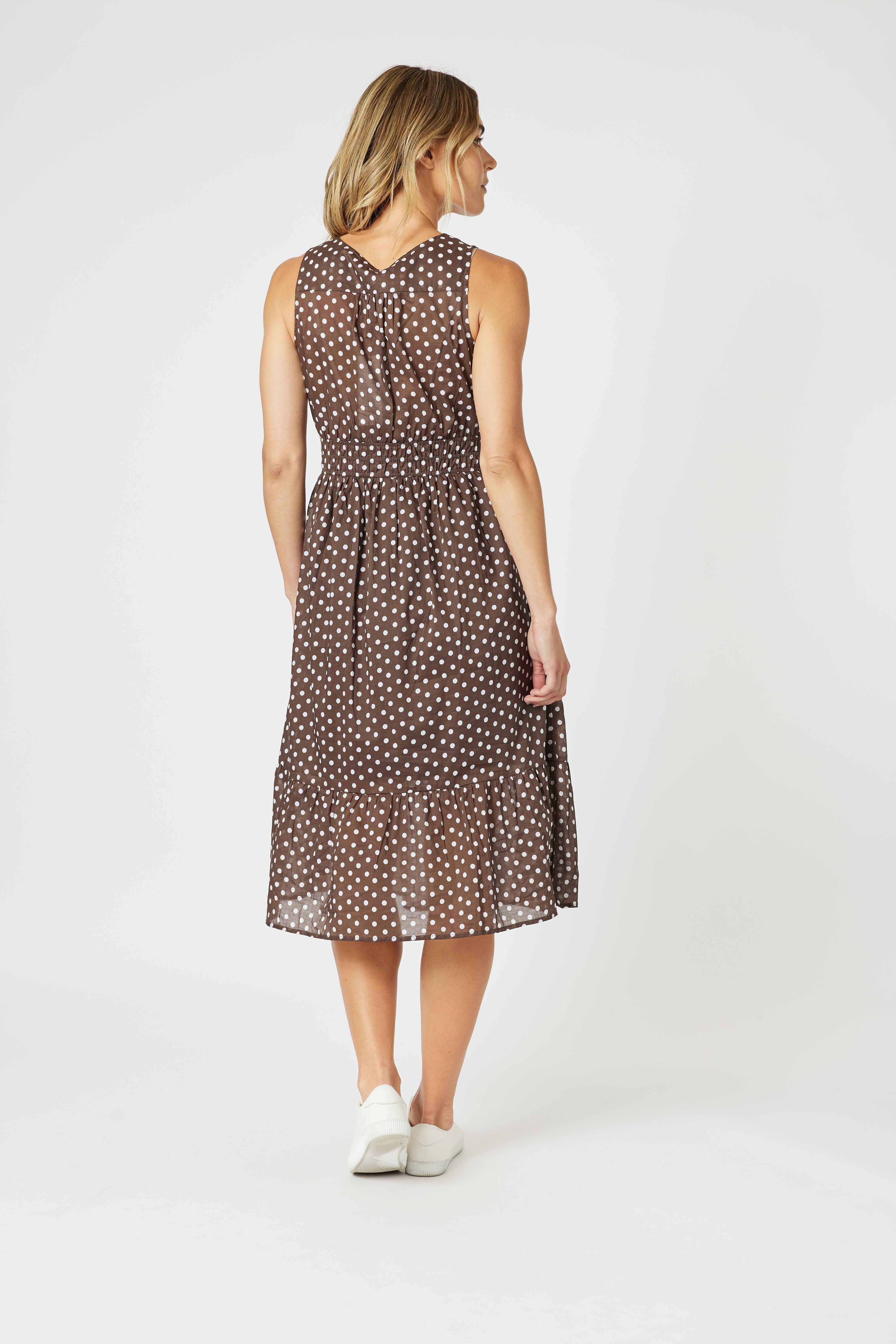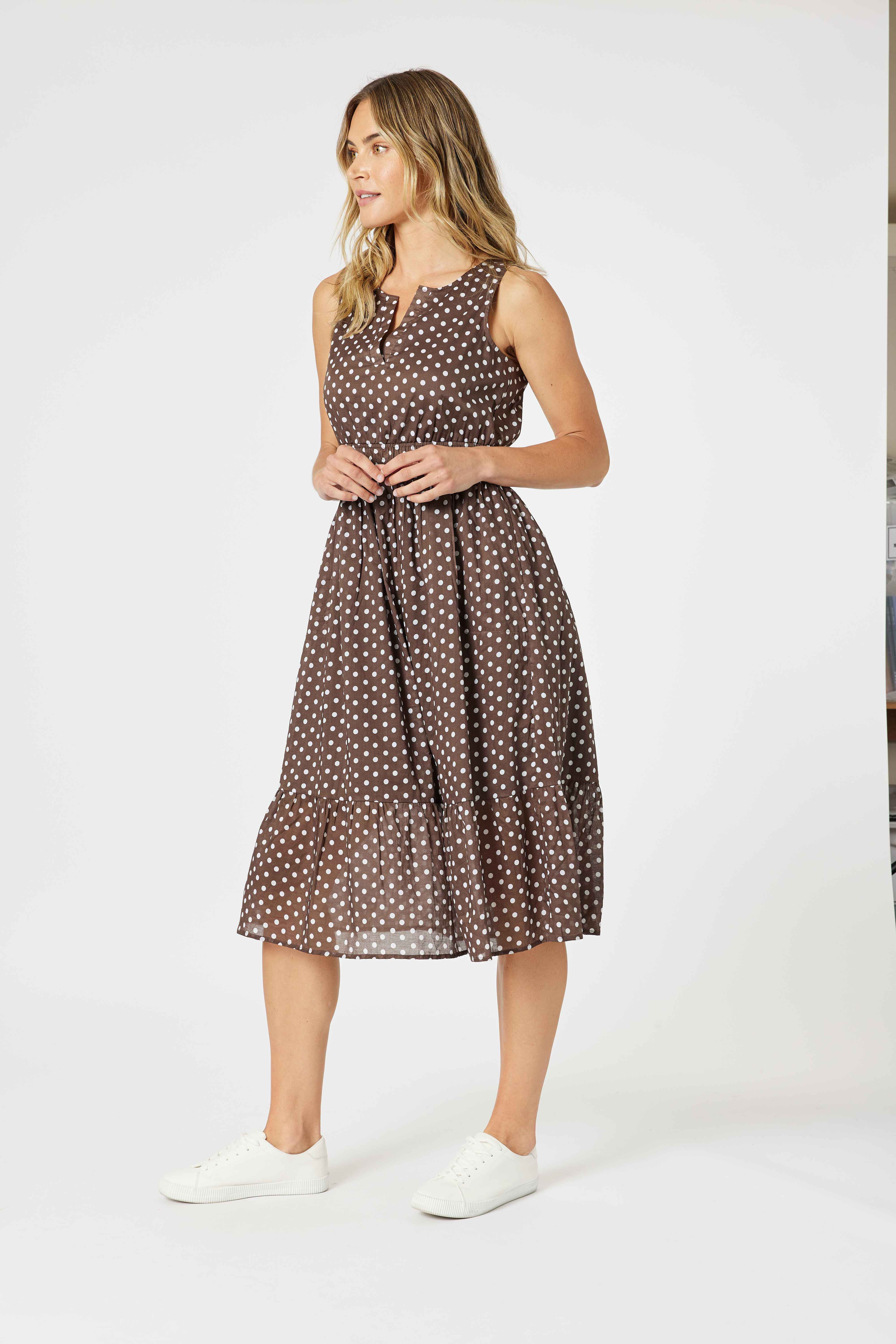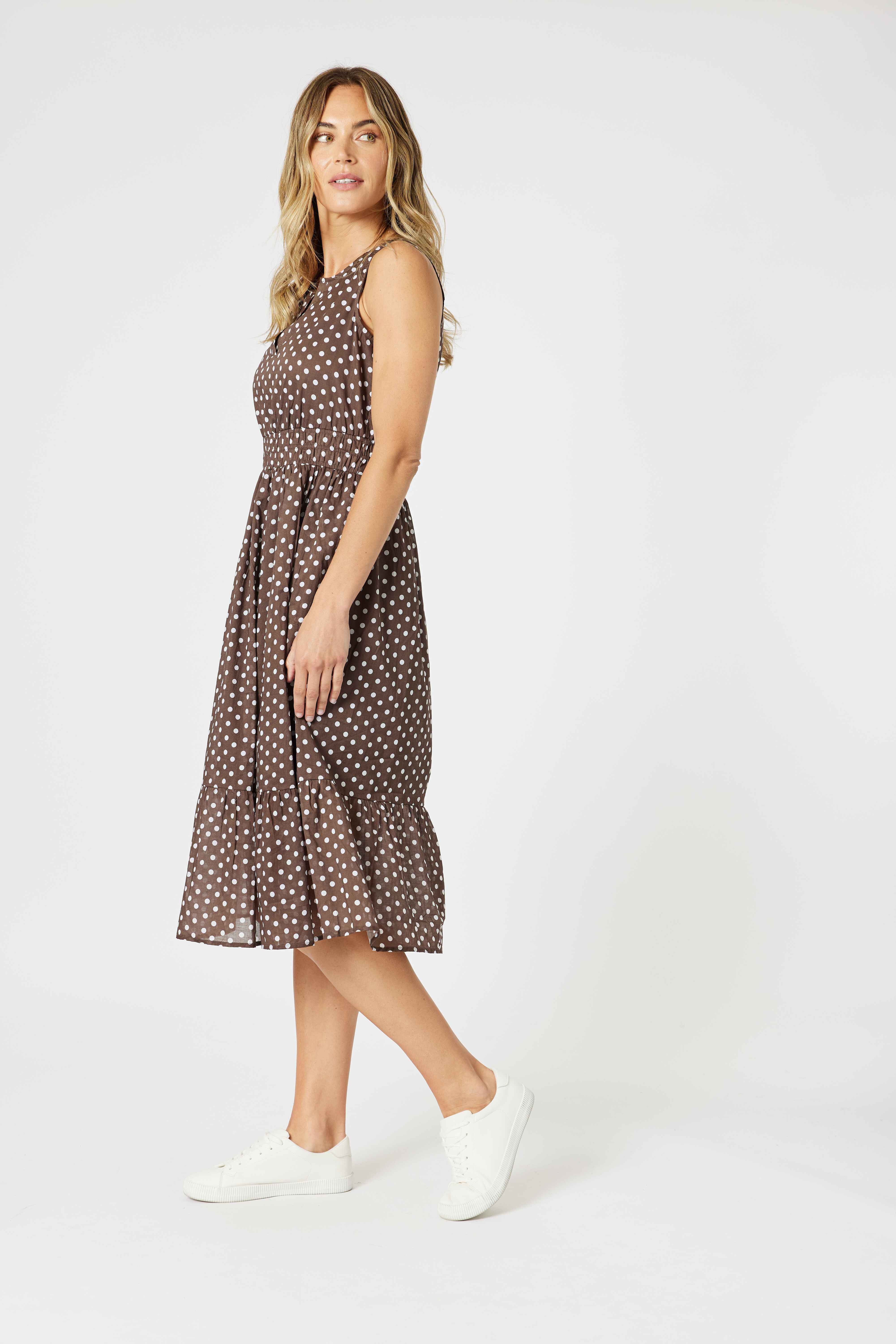Featuring a timeless koko base with white polka dots, this sleeveless midi dress has a flattering notch neckline, a gathered elastic waist for shape, and a softly tiered skirt that moves beautifully.