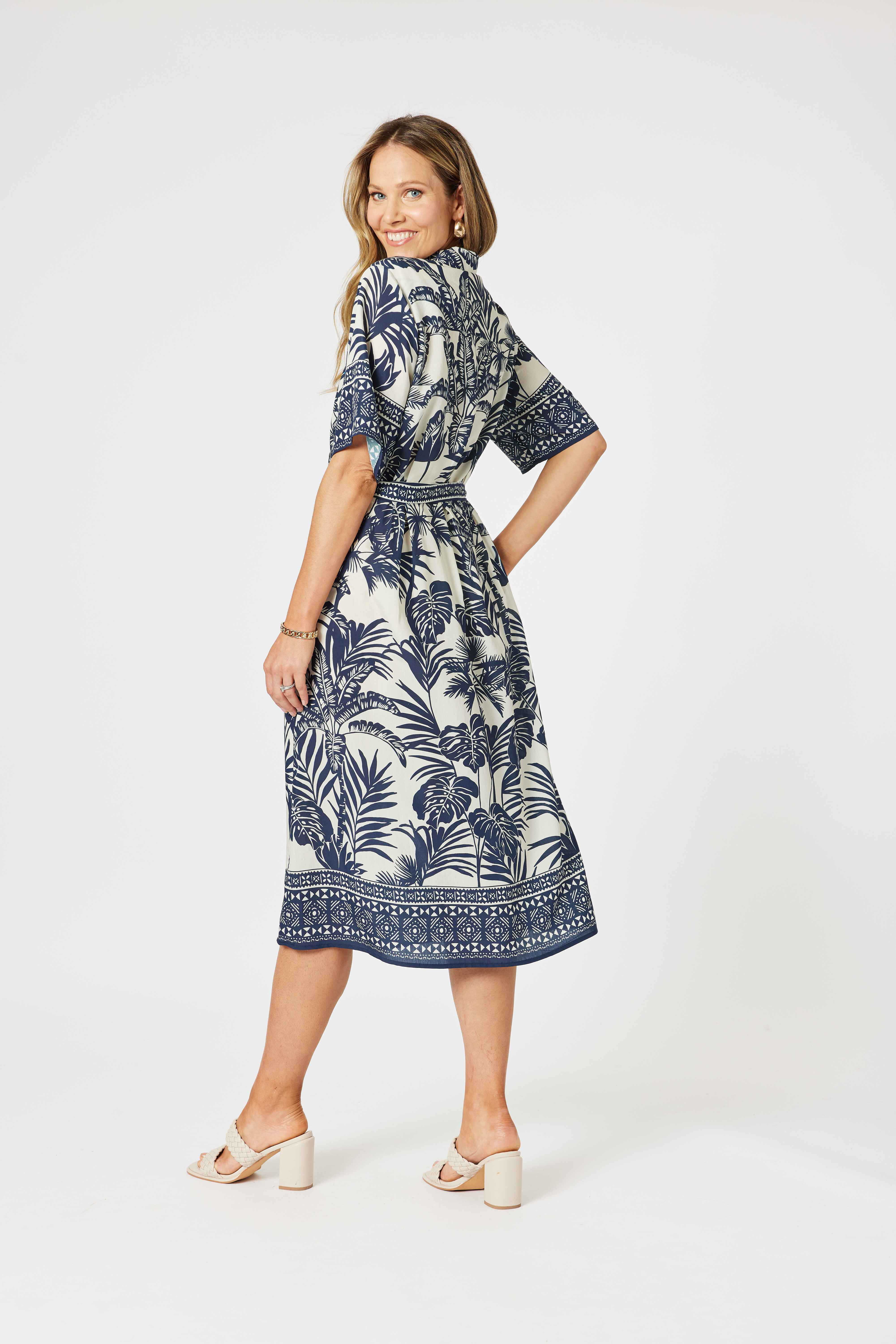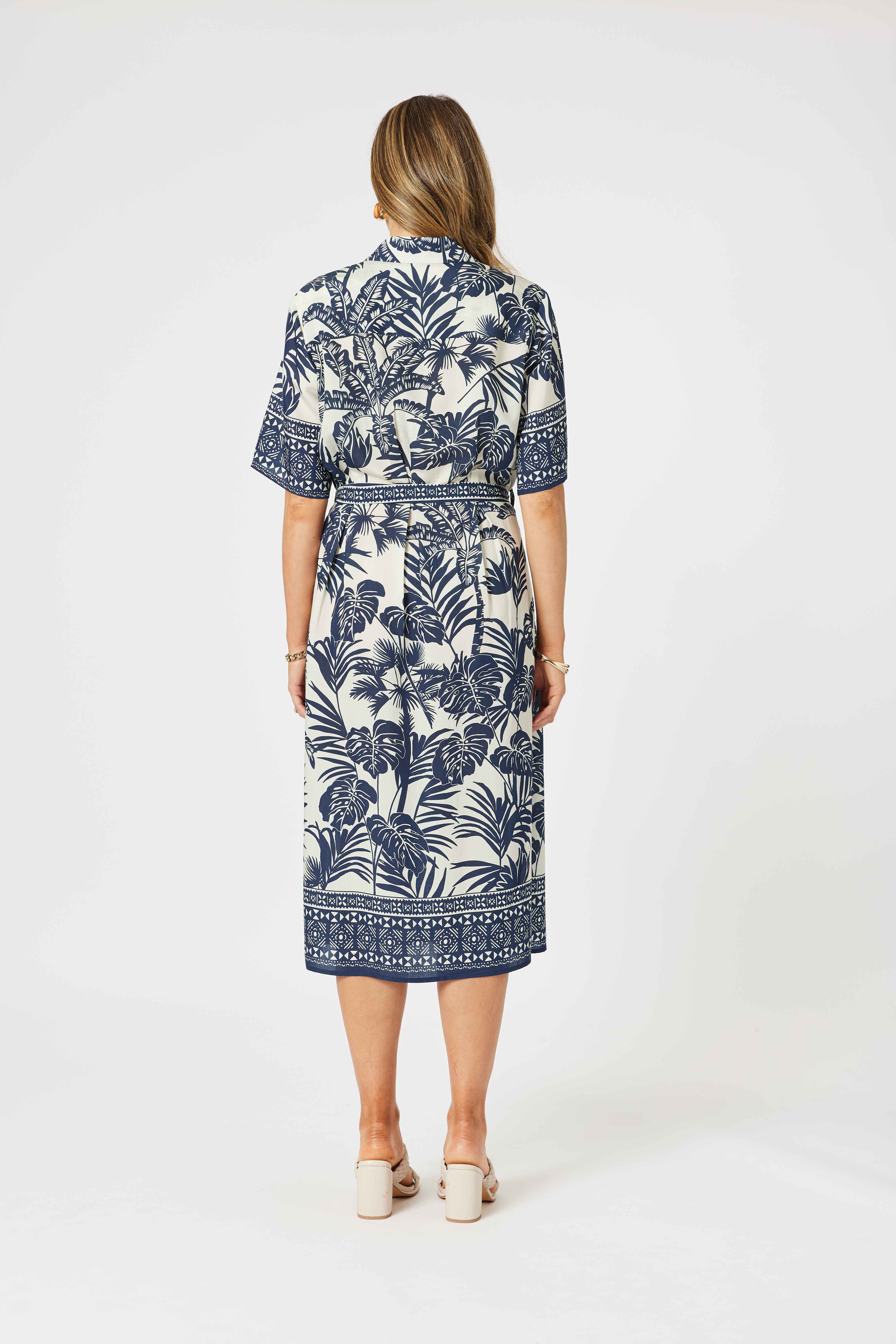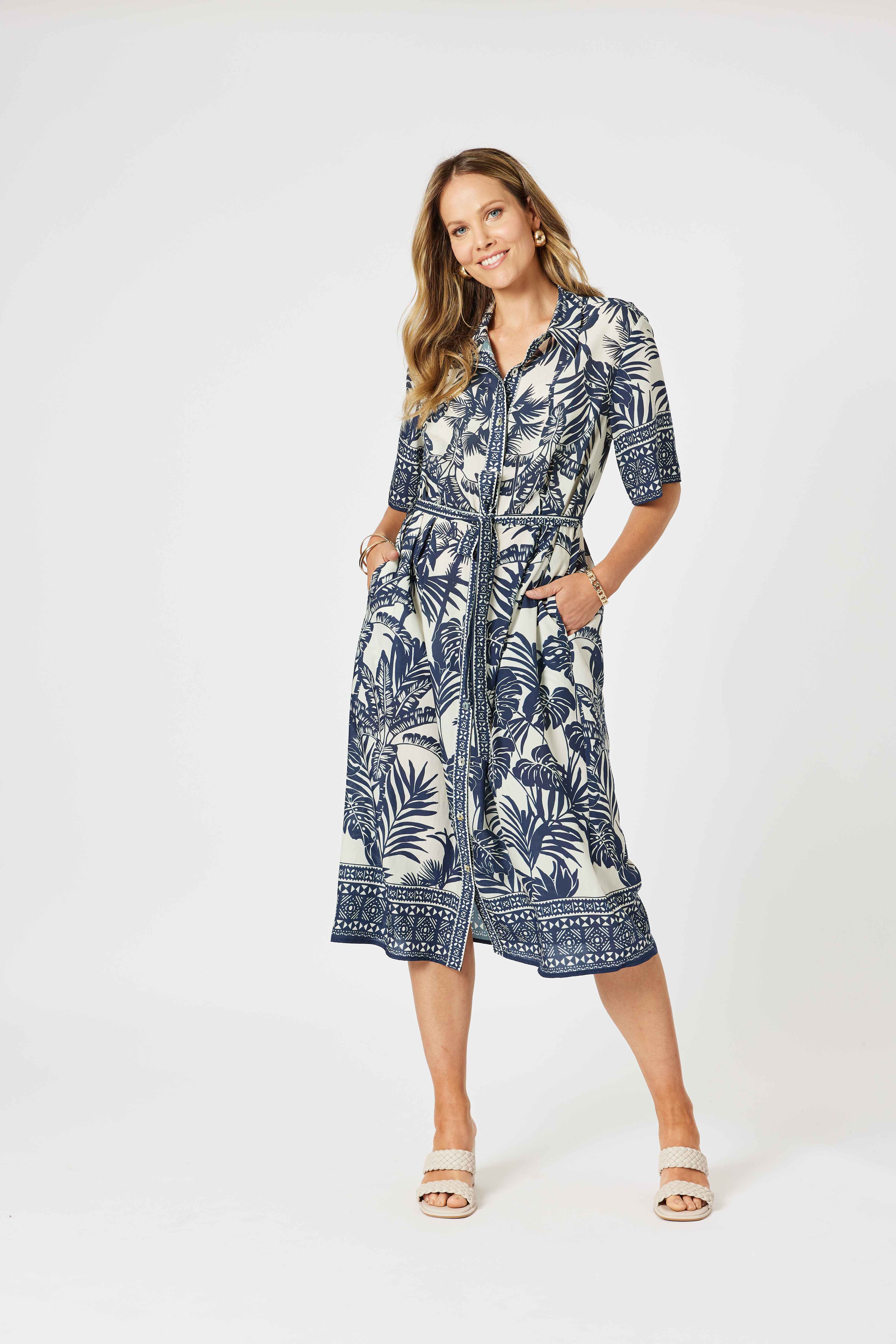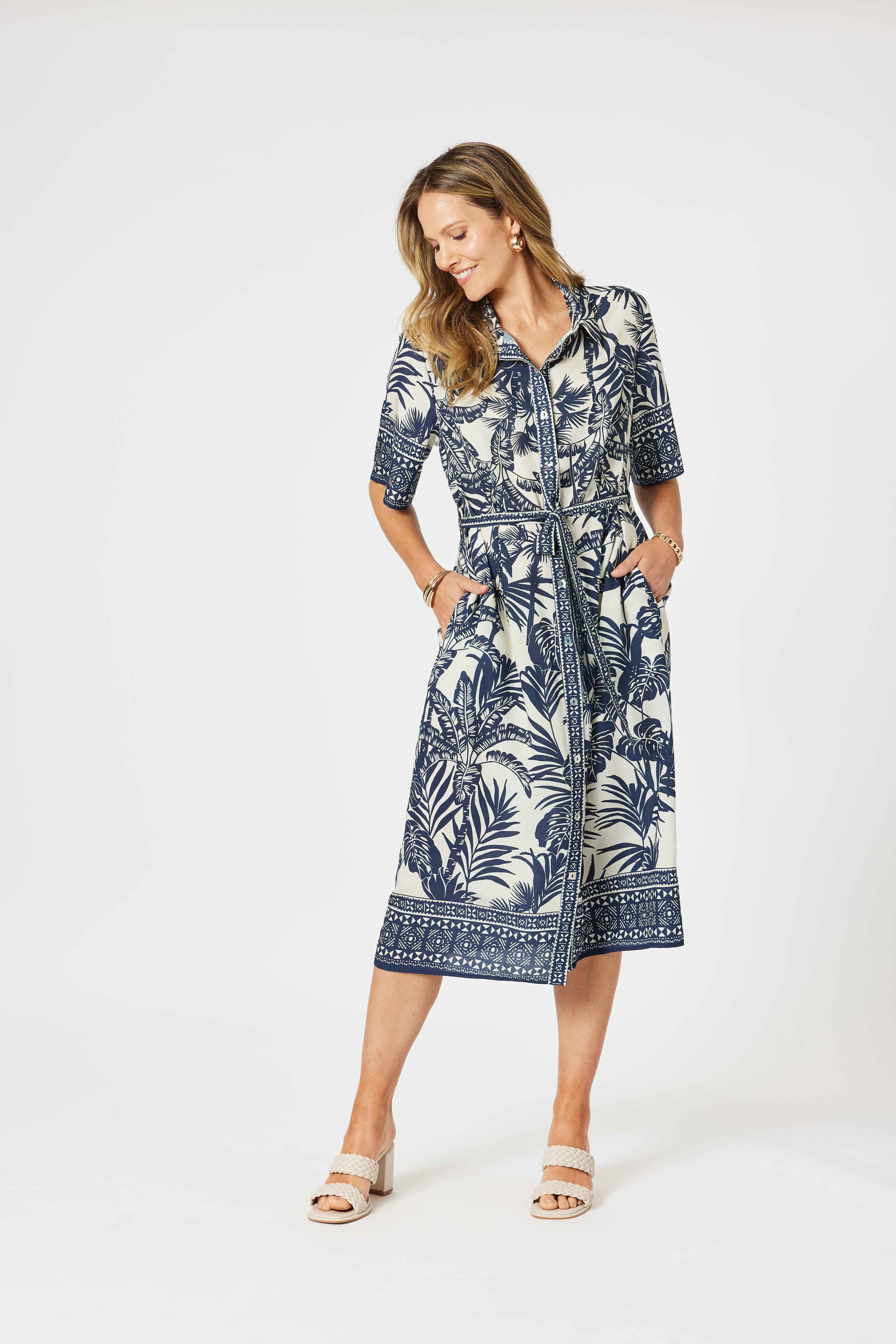 Elevate your everyday style with this effortlessly chic shirt dress, featuring a striking navy and ivory botanical print. Designed with a flattering button-down front, short sleeves, and a classic collared neckline, it offers both comfort and sophistication. The removable waist tie cinches the silhouette for a figure-flattering fit, while the side pockets add a touch of practicality. Finished with a contrasting border print along the hem, sleeves, and placket, this midi-length dress transitions seamlessly from day to night.