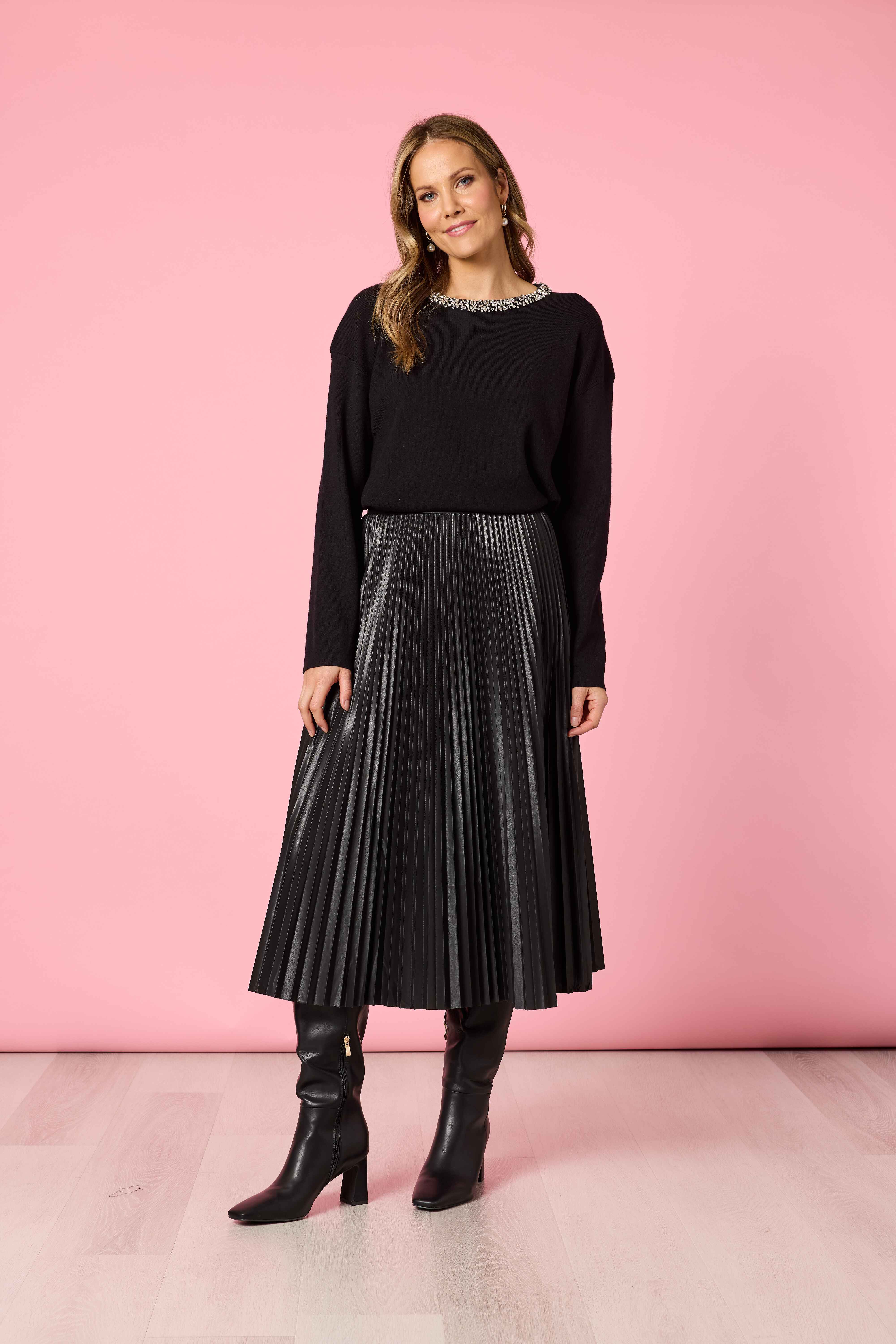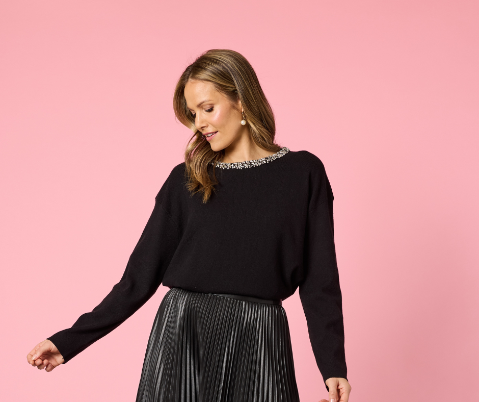 Add a touch of sparkle to your everyday wardrobe with the Nero Diamante Knit. This elegant knit features a beautifully embellished diamante neckline, giving it a luxurious feel that transitions effortlessly from day to night. Crafted from a soft, mid-weight knit, it offers a relaxed yet refined silhouette with full-length sleeves and a comfortable fit. Perfect for pairing with Florence Pleat Skirt, Opera Pant, or denim, this piece brings understated glamour to any outfit.