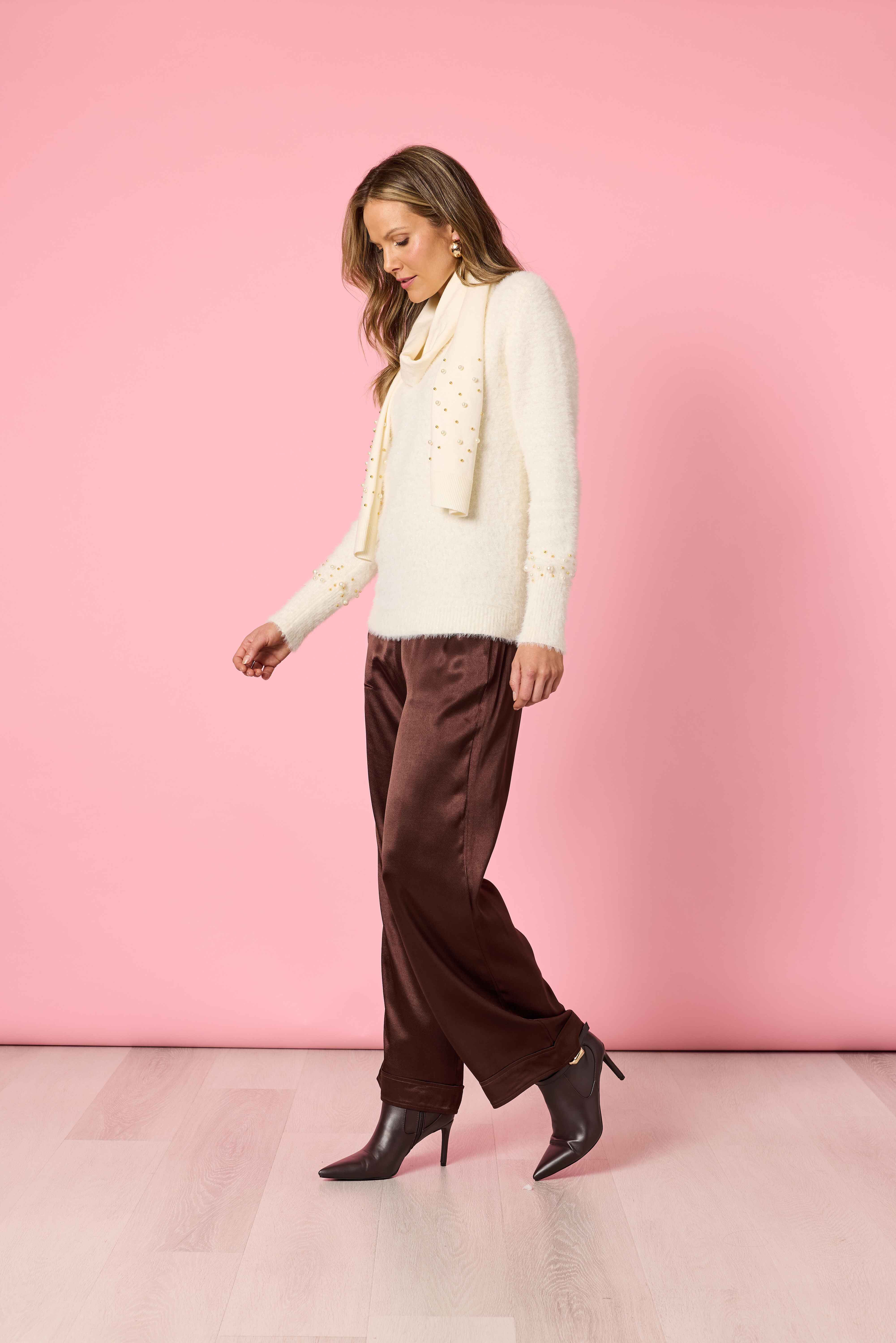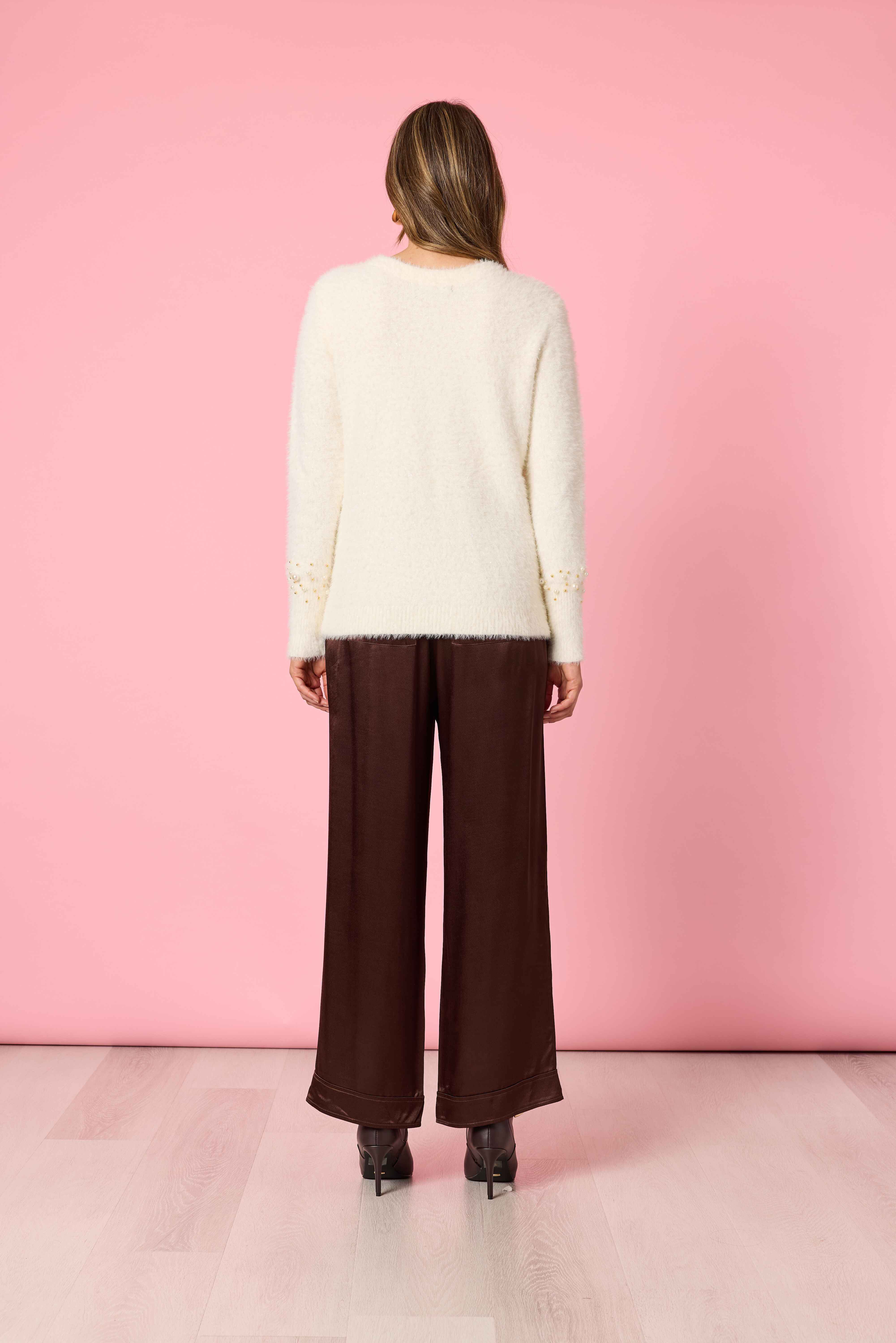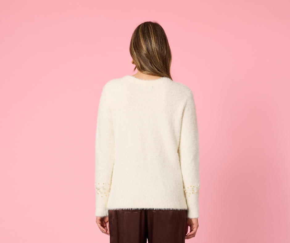 This ultra-soft ivory sweater brings a touch of luxury to everyday dressing, with its plush textured knit that has silver sparkling sequins throughout, feeling cosy but looking stylish. Delicate pearl embellishments along the sleeves add a feminine sparkle, giving this piece an effortlessly elegant finish.