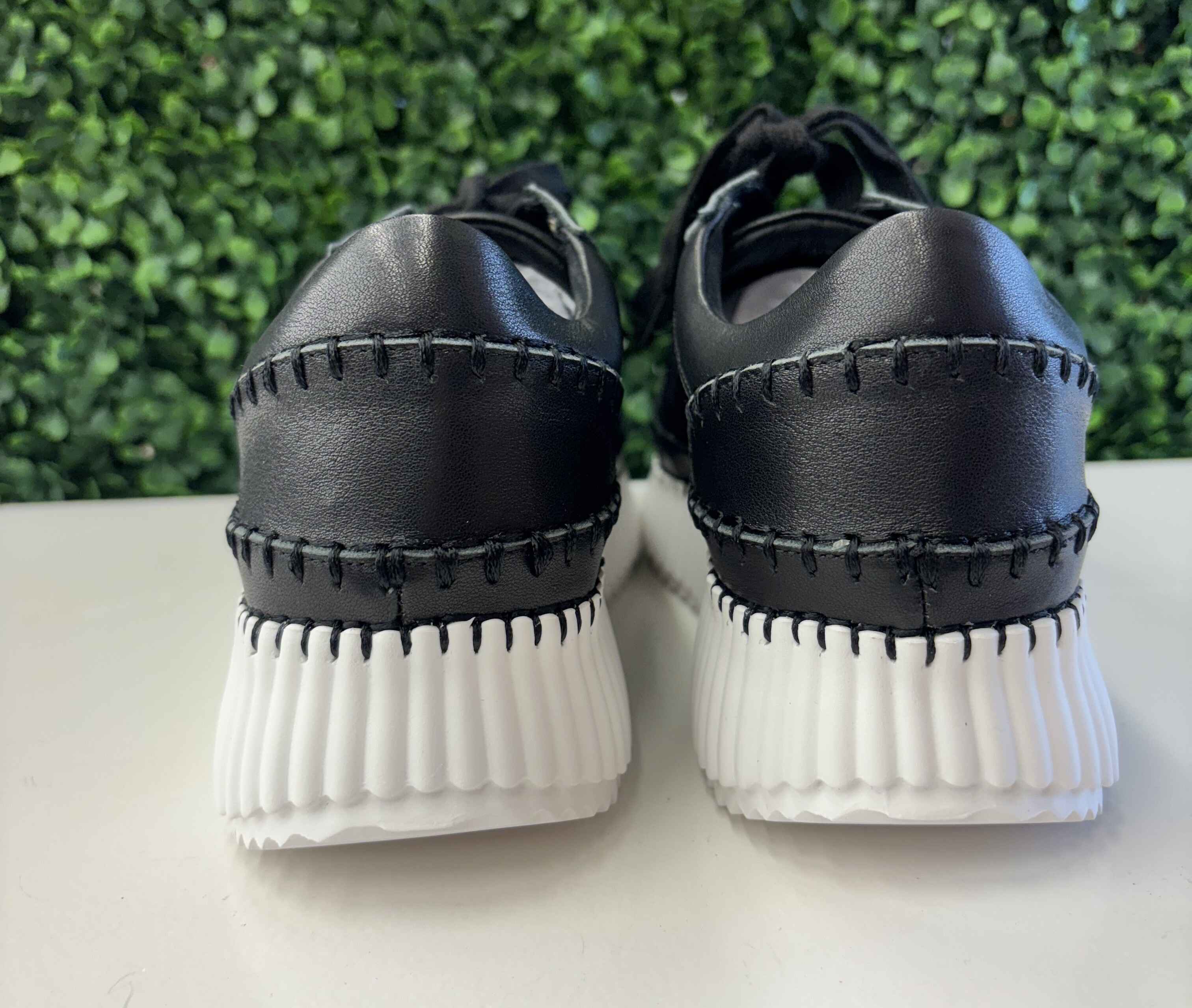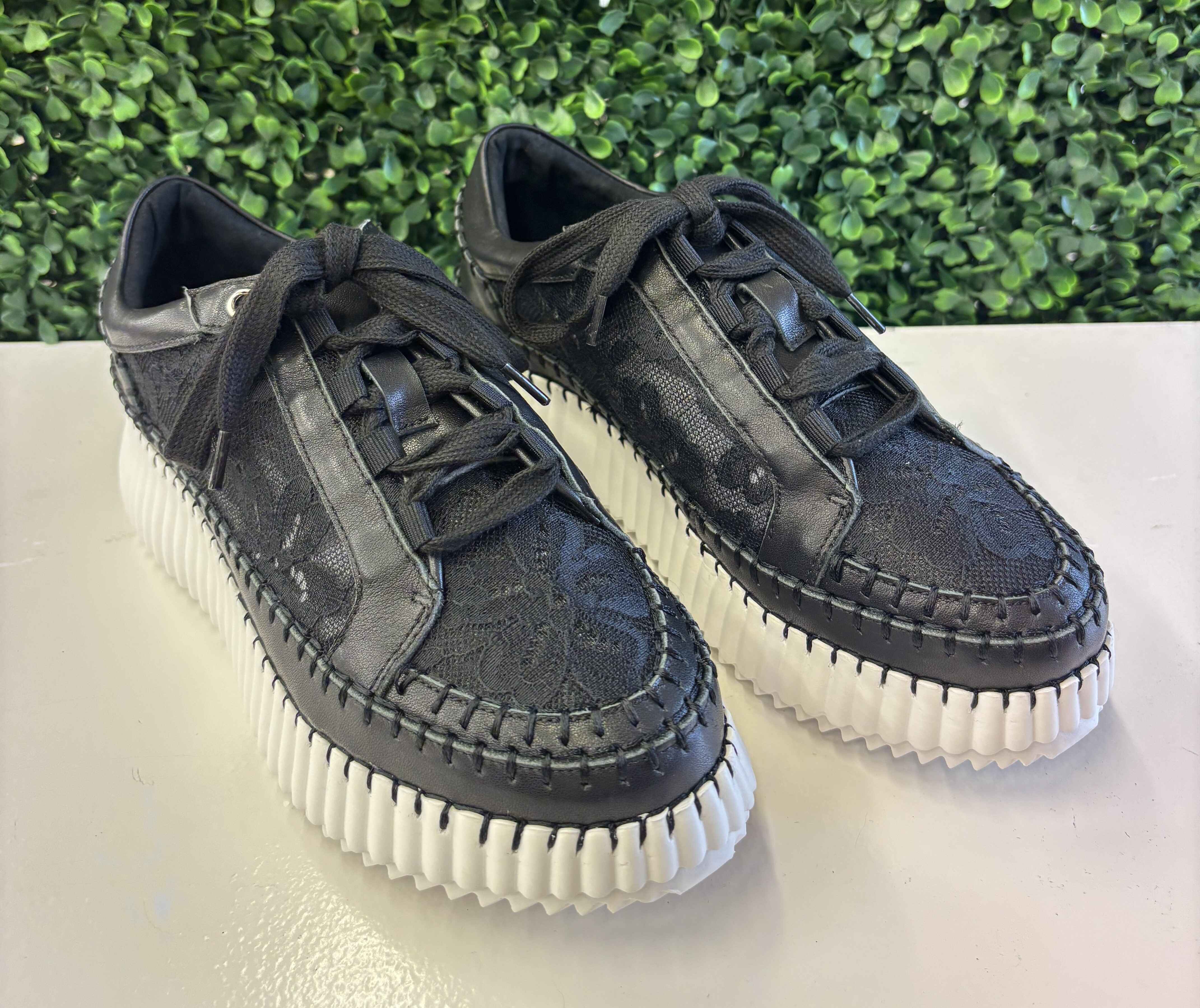Step into bold style with these black lace-detail sneakers. Designed with a unique mix of textures, the upper blends sleek faux leather panels with intricate tonal lace overlay for a modern twist on a classic silhouette. The hand-stitched accents add an artisanal touch, while the crisp white ridged sole gives a sporty edge and lasting comfort.