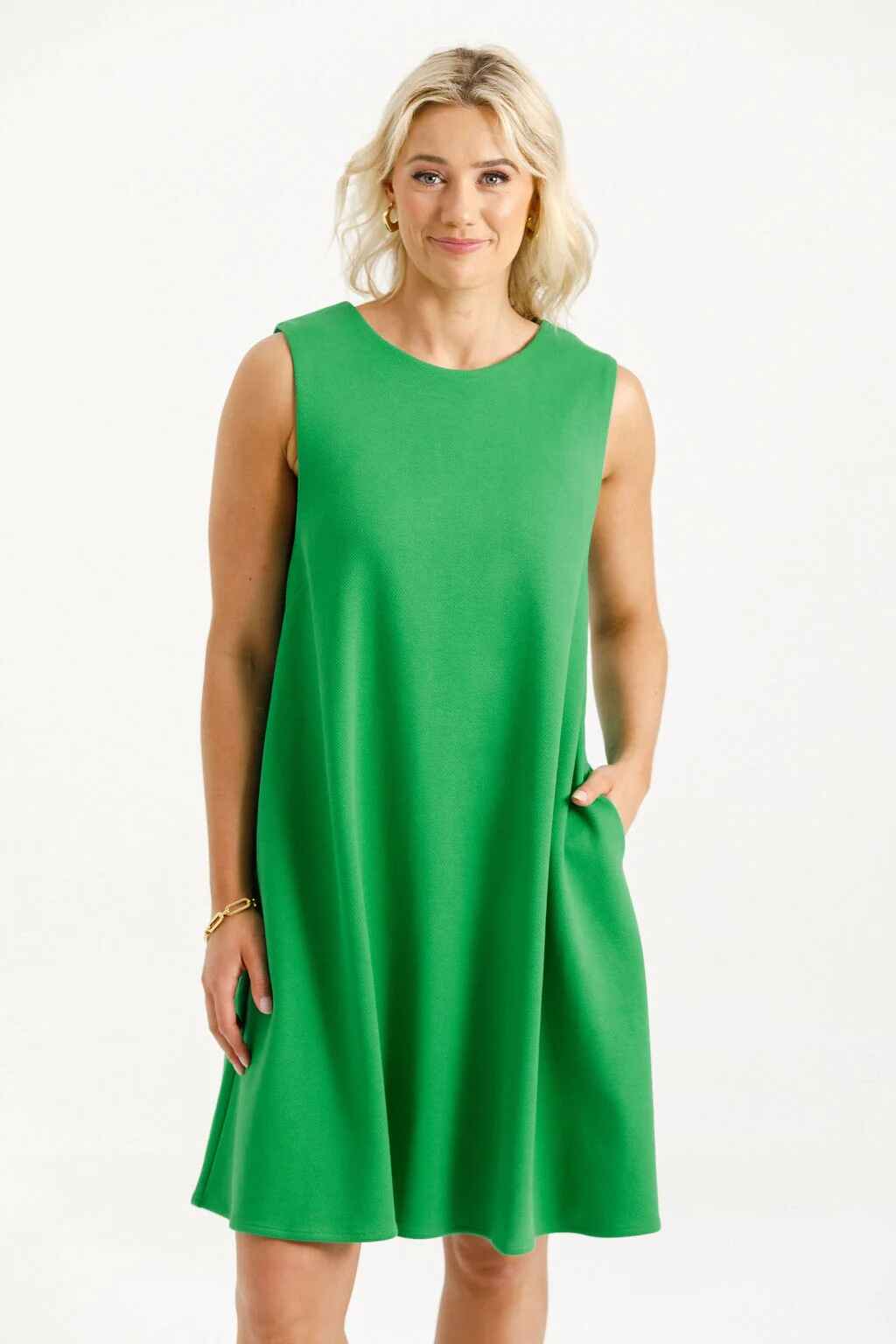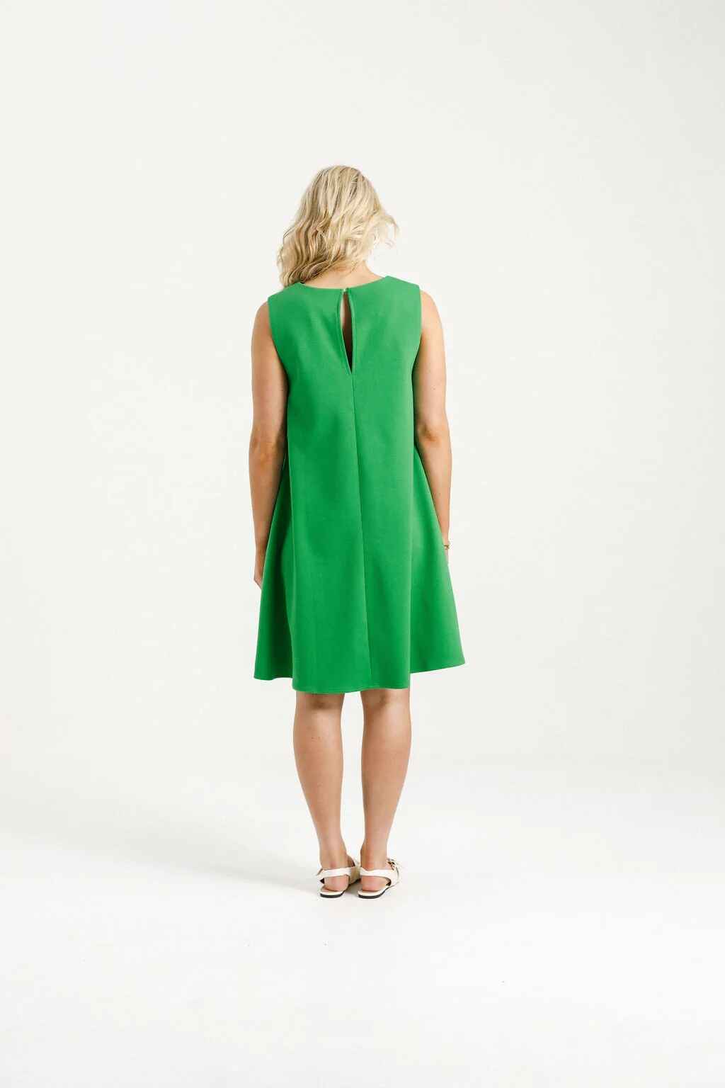 Fun, flirty, and effortlessly chic, the July Dress features a playful flared hem and functional pockets. Crafted in our stunning Kelly Green fabric, it’s finished with a button closure at the back neck for a sleek and stylish touch.Perfect for sunny days and summer outings.See More Details below to find your perfect fit!