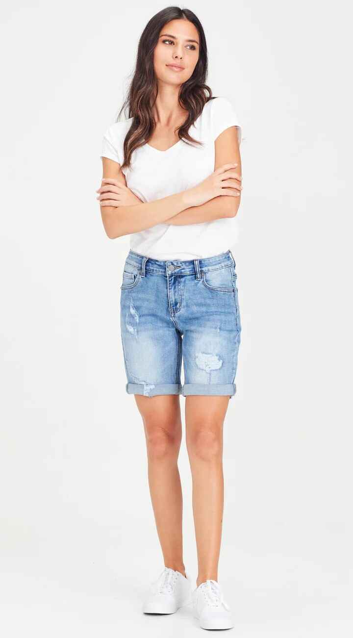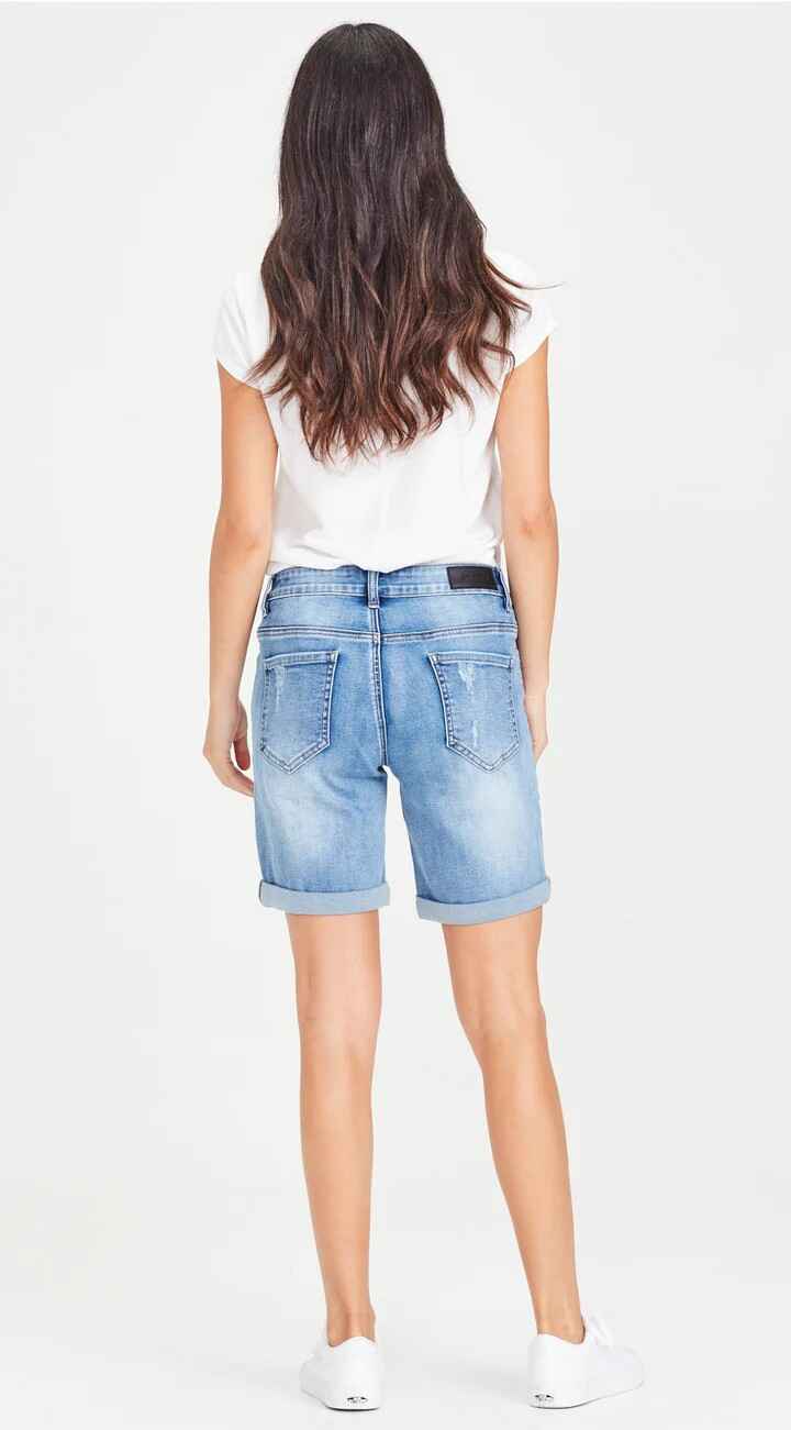 Mid waisted long shorts with a super comfy soft stretch denim and a rolled cuff.