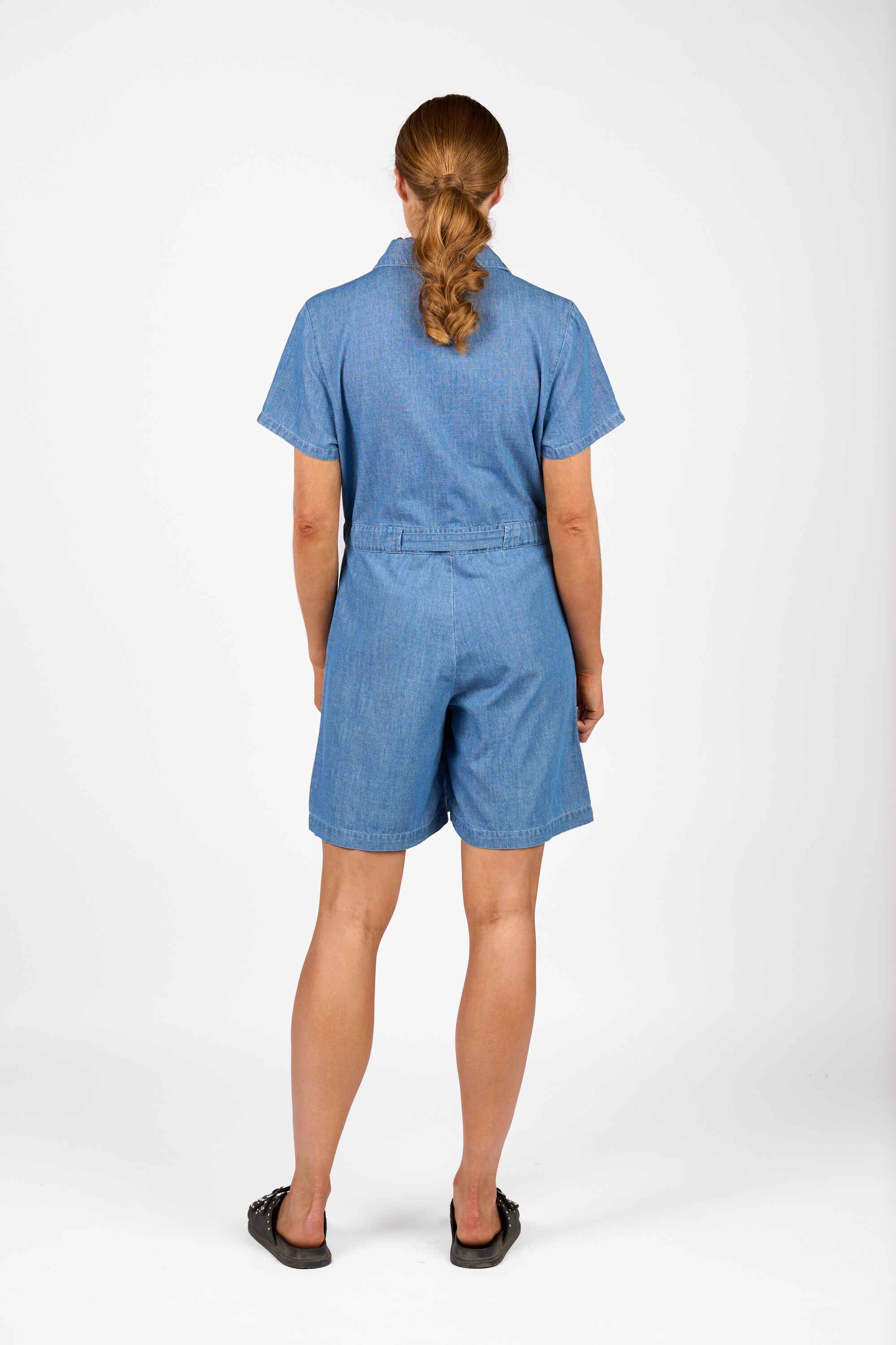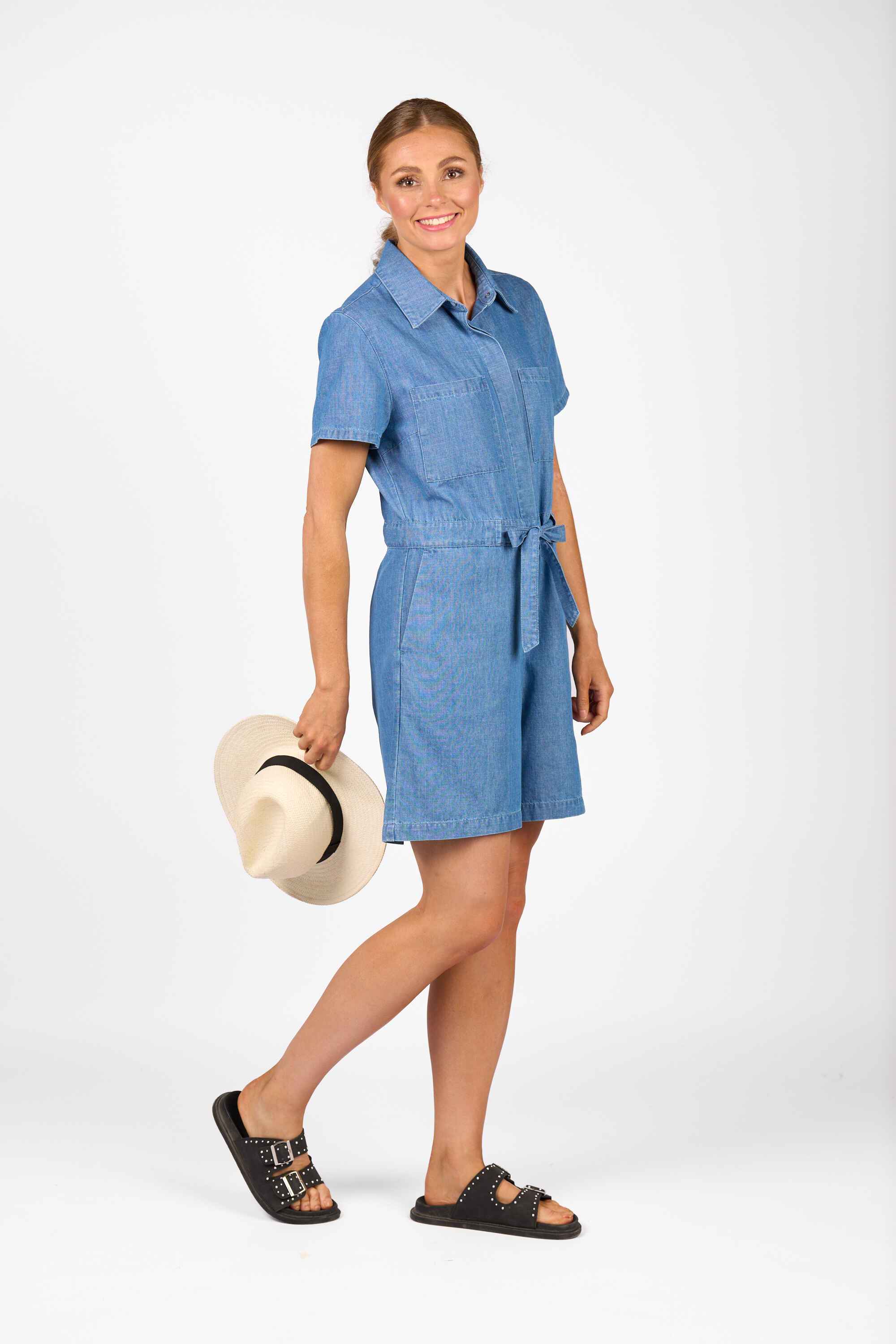 The Bank Jumpsuit is a relaxed, utility-inspired one-and-done made for sunny days. Crafted from lightweight cotton with a denim look, it features a collared neckline, short sleeves, and a tie waist to shape the silhouette. A playful take on workwear that keeps things cool and effortless. • Made from a lightweight cotton fabric with a denim look• Shirt collar• Short sleeves• Two front patch pockets, with small 'KNEWE' brand plate on right pocket• Popper dome front fastening• Waist tie• Hidden button and zipper fly for shorts fastening• Slash pockets on shorts• Relaxed fit • Model is 175cm tall, and wears size 10 100% Cotton Care Instructions:Wash inside out, cold gentle wash with similar colours. Do not soak or bleach. Line dry in shade, do not tumble dry. Dry cleanable. Always check the label.