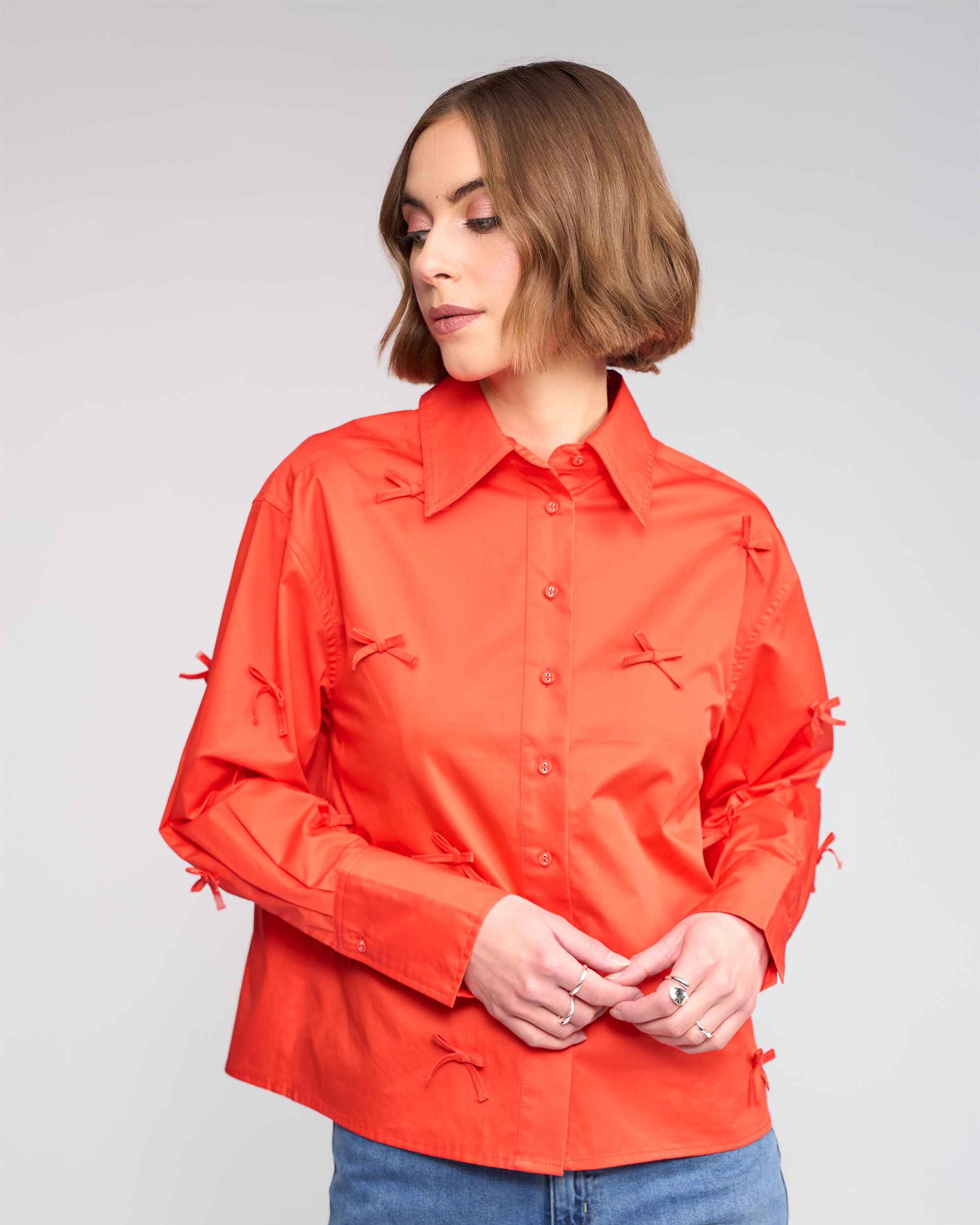 Crisp cotton shirt in Lava, a bold bright orange. Designed with classic shirting details, the front is finished with fabric bow appliqués for a playful twist on a timeless silhouette, while the back remains clean with traditional shirt construction, including a back yoke and centre box pleat.
