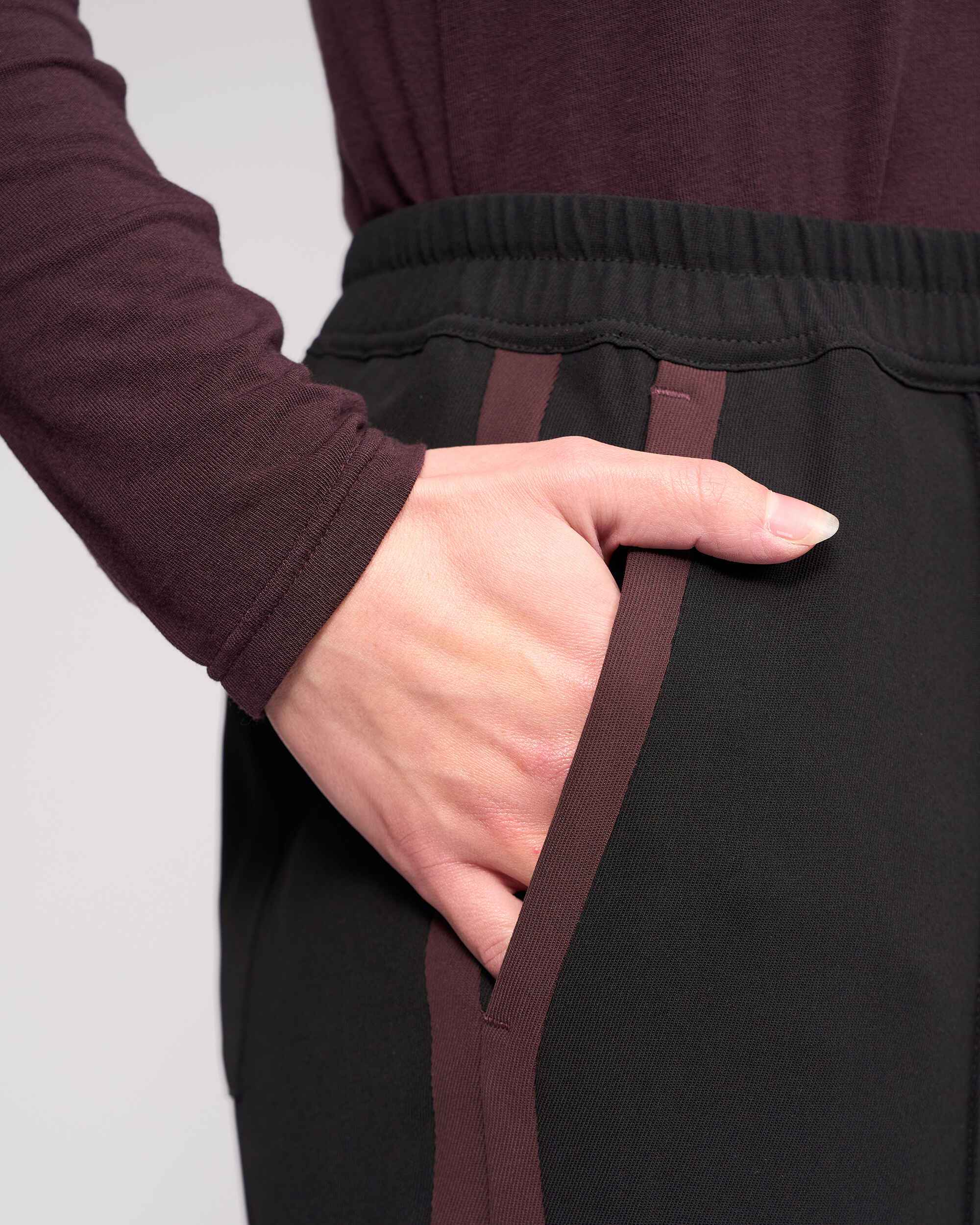Full-length straight-leg pant in black, featuring contrast Raisin-coloured stripes running down the side seams. Designed in an easy pull-on style with an elasticated waistband and matching drawstrings, this pant offers relaxed comfort with tailored detailing.
