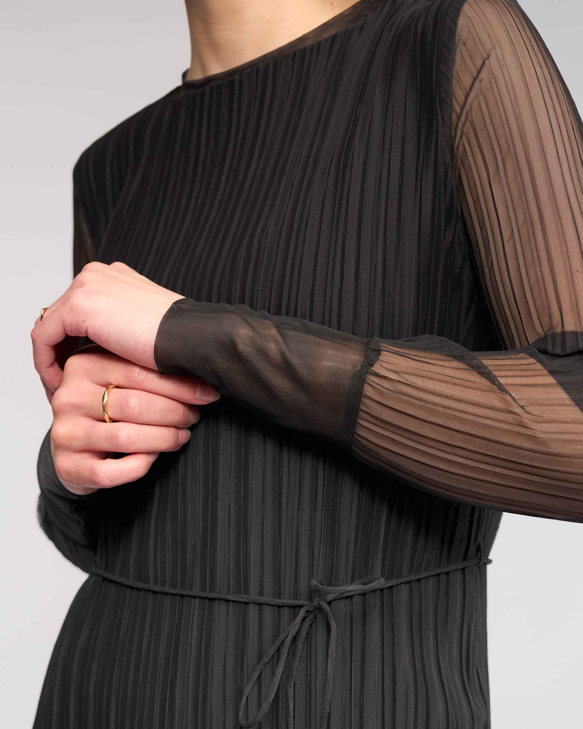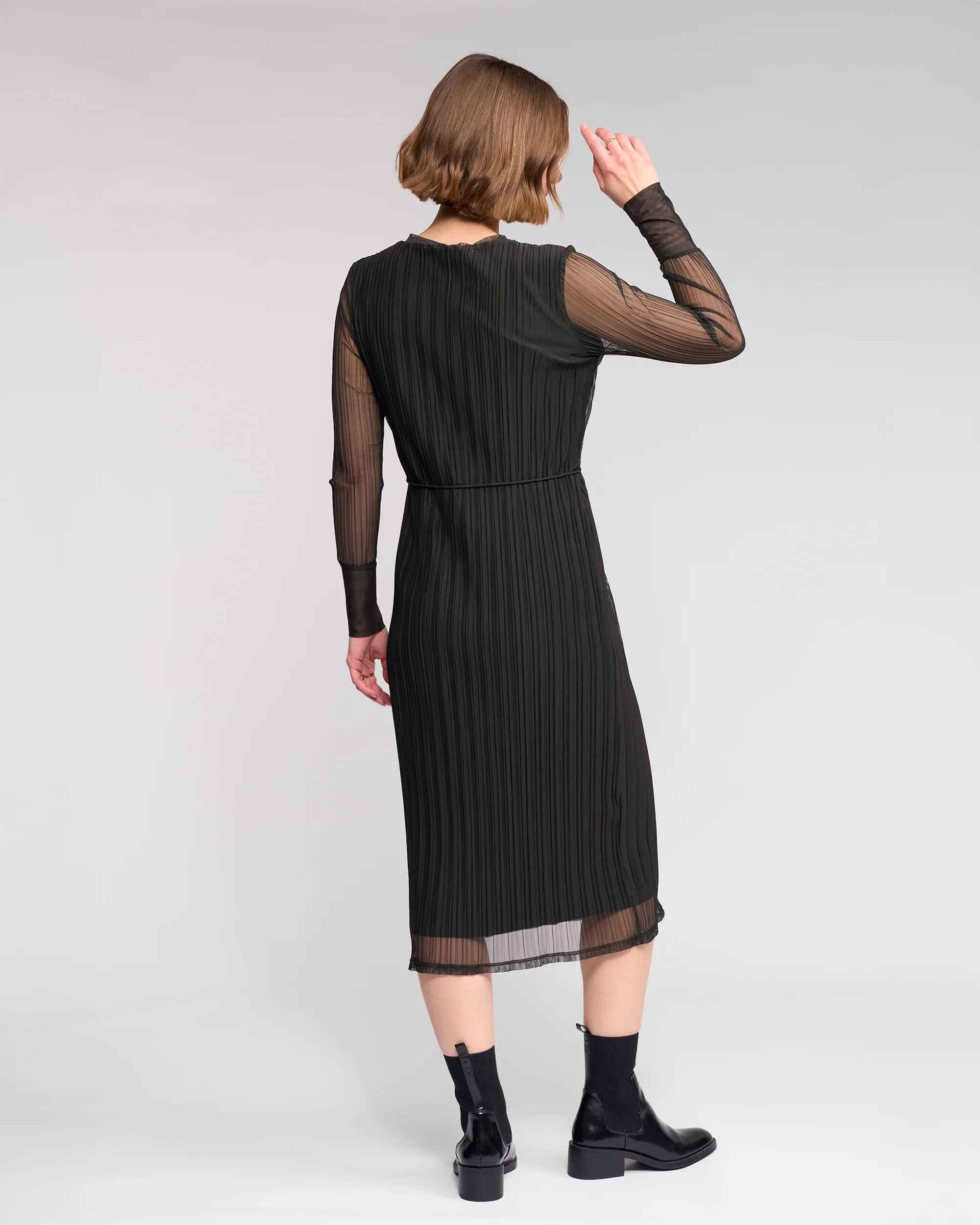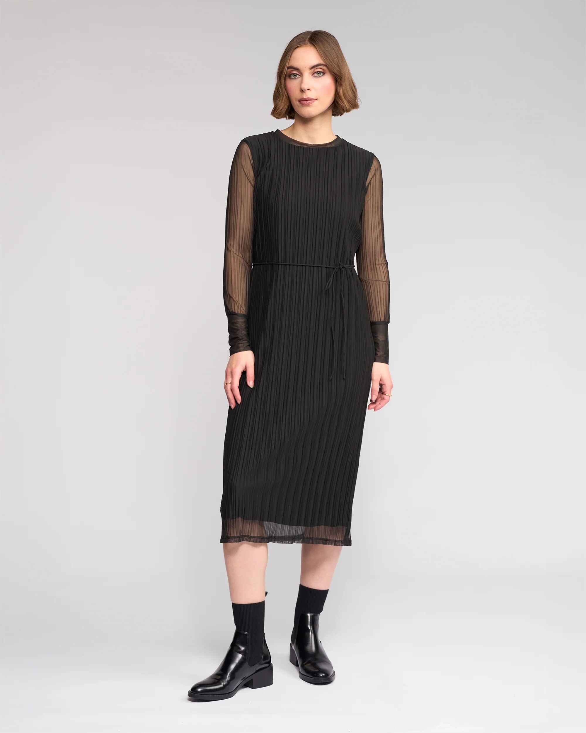 Long sleeve winter dress crafted from a stretchy crinkle mesh in the Dusk print, featuring a bronze base with black and soft pink geometric shapes. Designed with a slim fit silhouette, round neckline and a matching self fabric waist tie to define the waist, this dress offers an elevated yet effortless winter option.