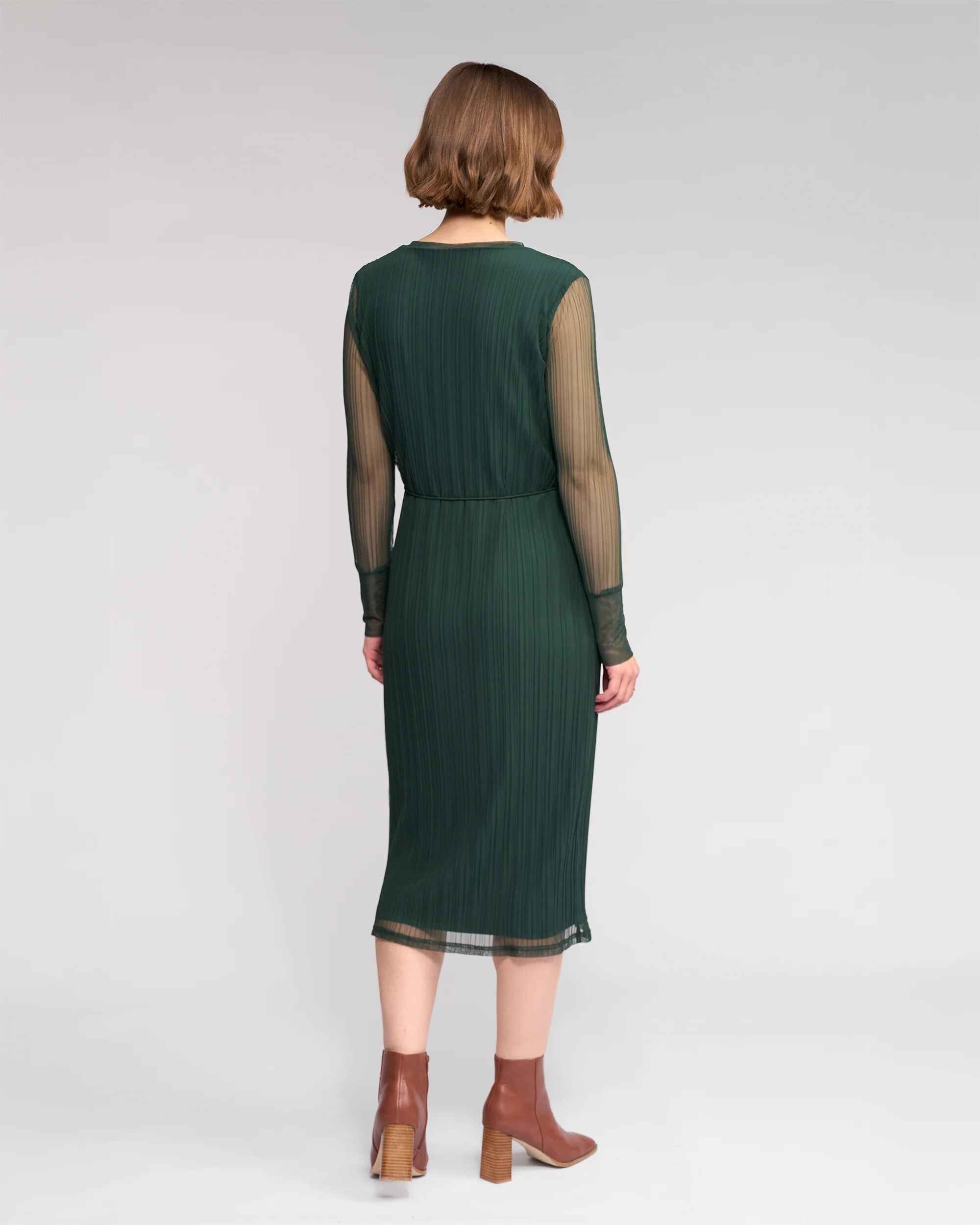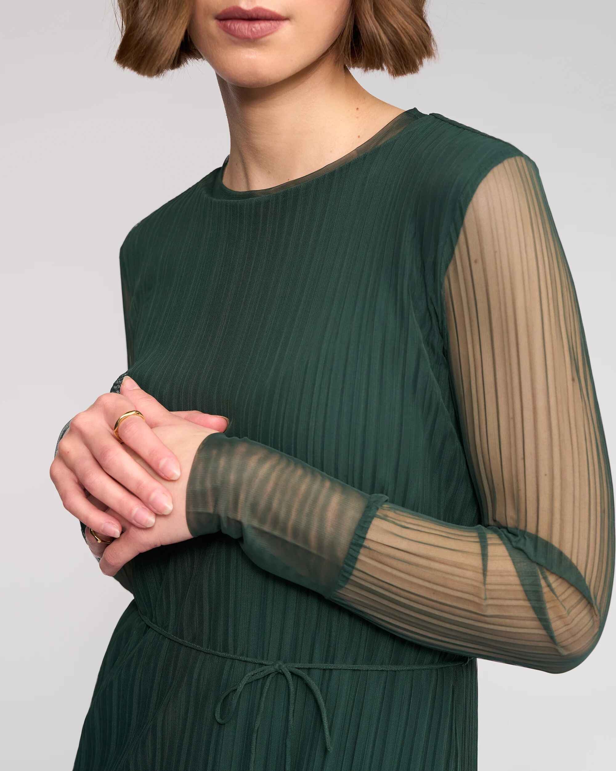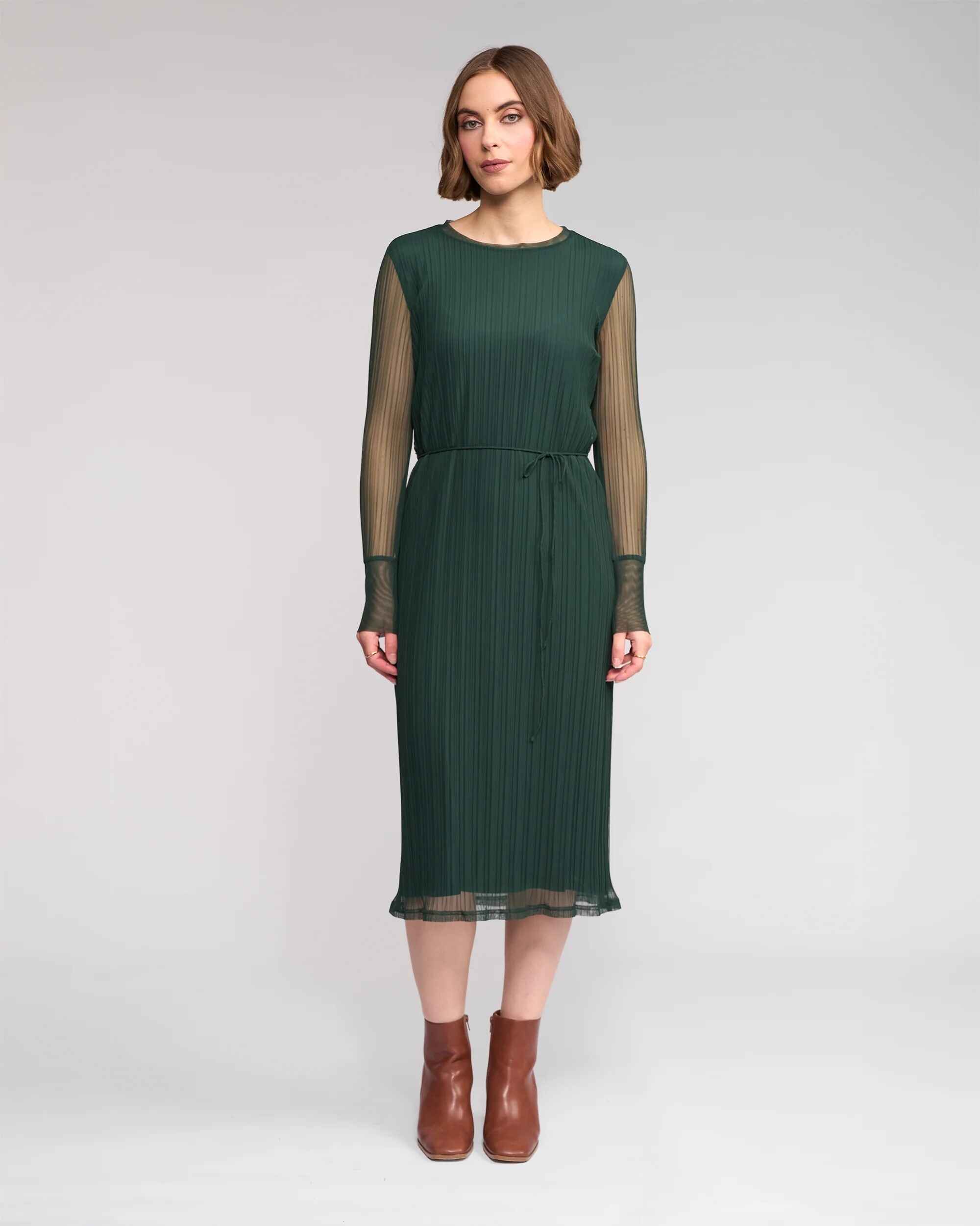 Long sleeve winter dress crafted from a stretchy crinkle mesh in the Dusk print, featuring a bronze base with black and soft pink geometric shapes. Designed with a slim fit silhouette, round neckline and a matching self fabric waist tie to define the waist, this dress offers an elevated yet effortless winter option.