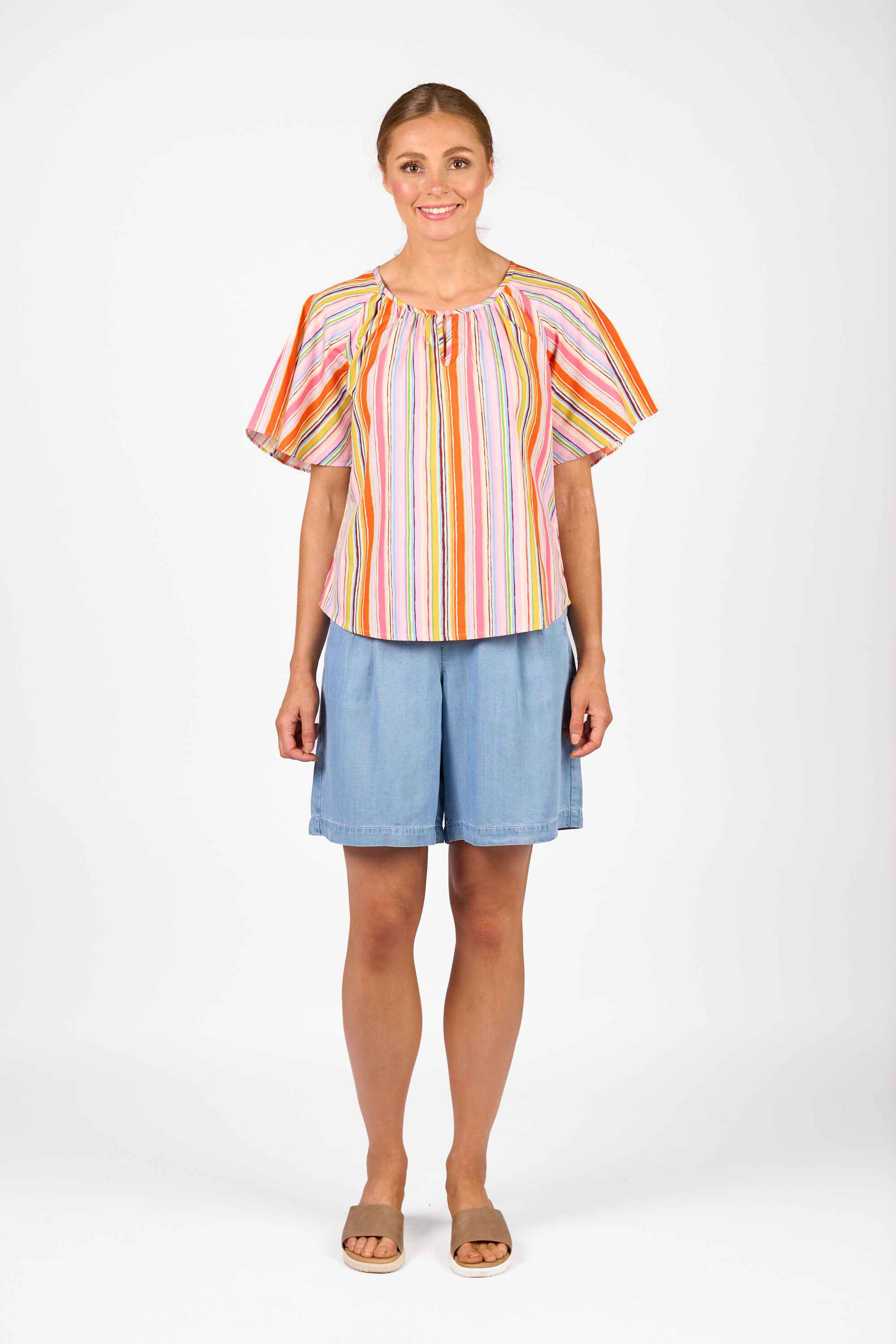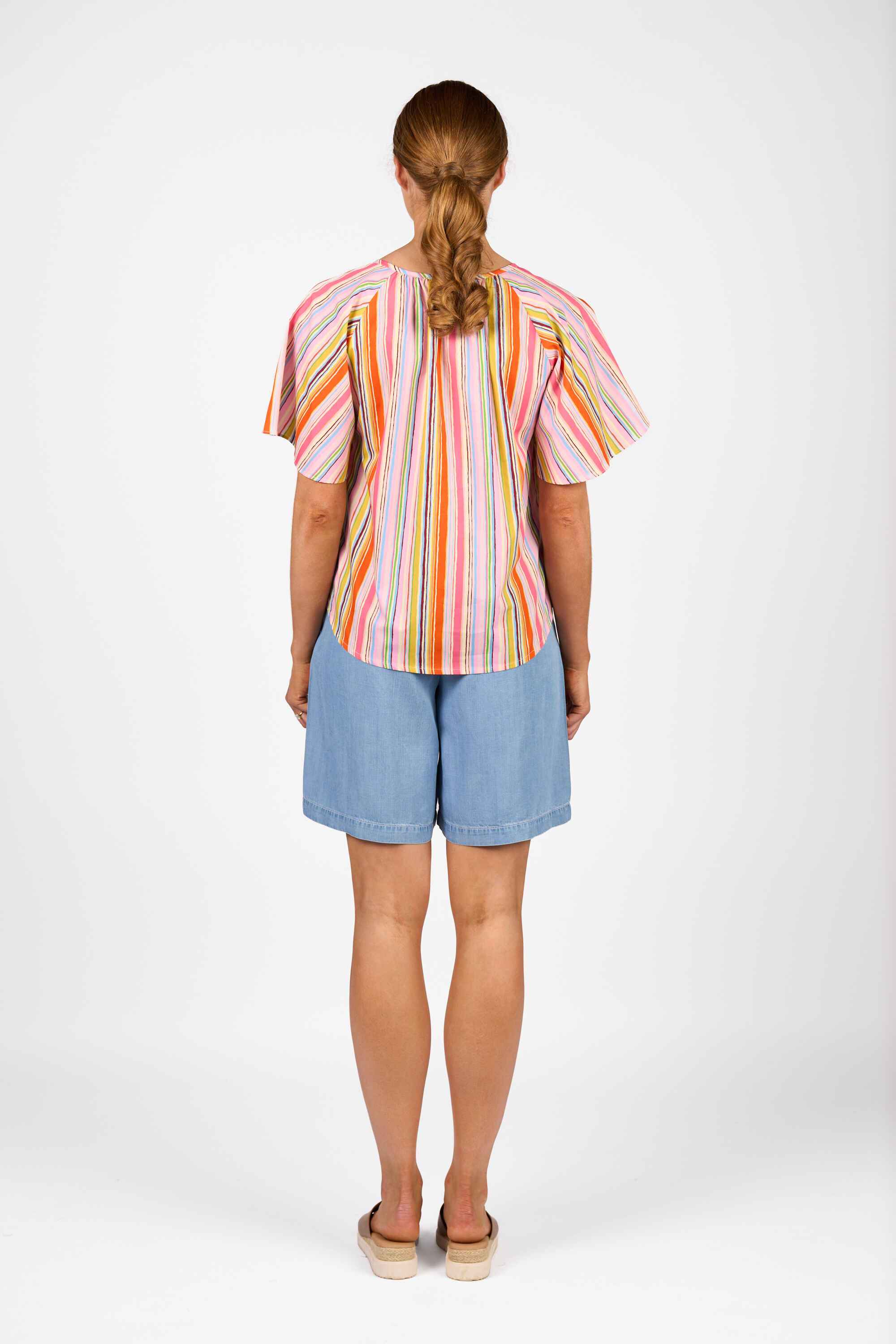 The Hazel Top in Bonbon is made from a lightweight 100% cotton fabric. It has a bound round neckline with a delicate enamel button, subtle gathers for texture, and relaxed floaty raglan sleeves for an easy, summery style.