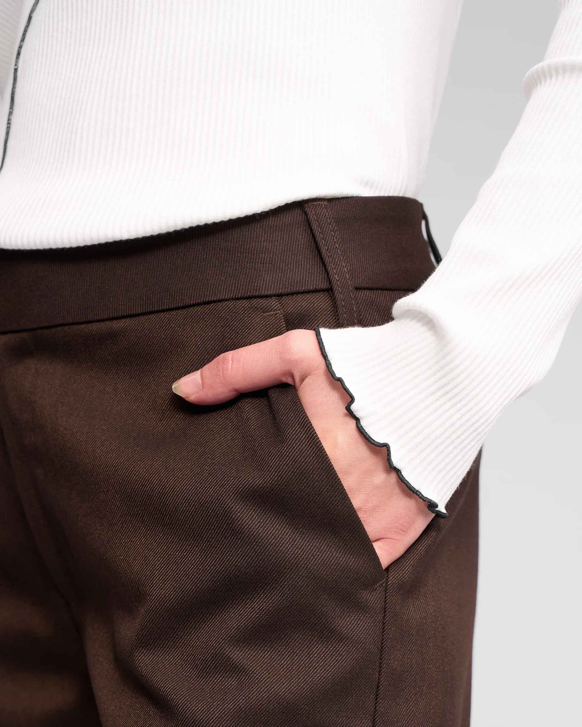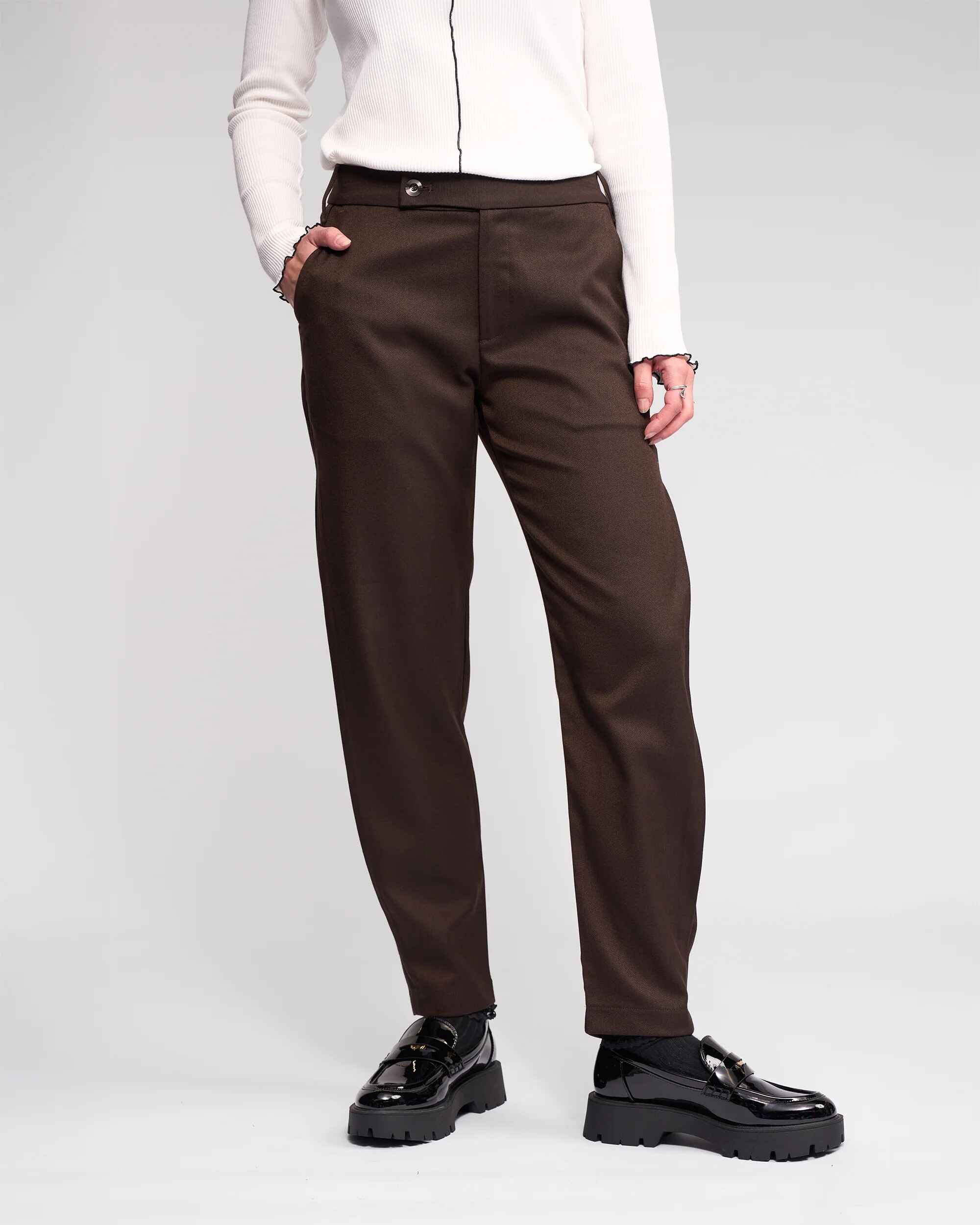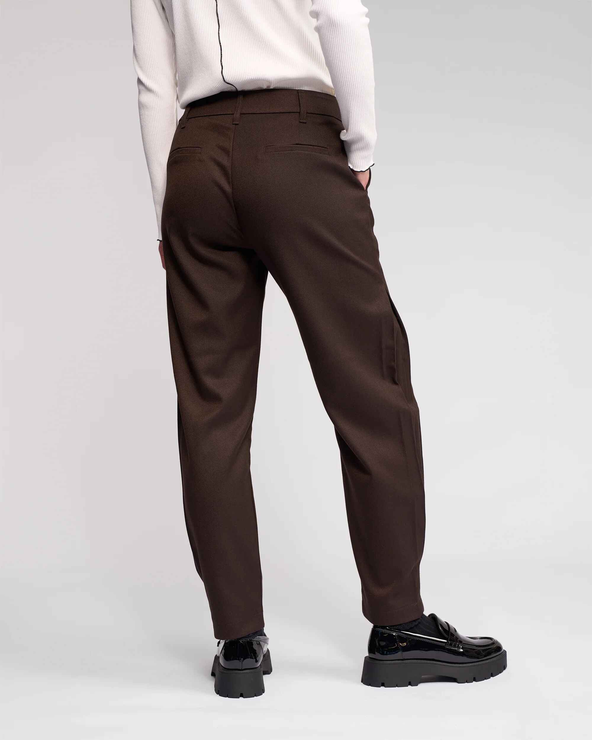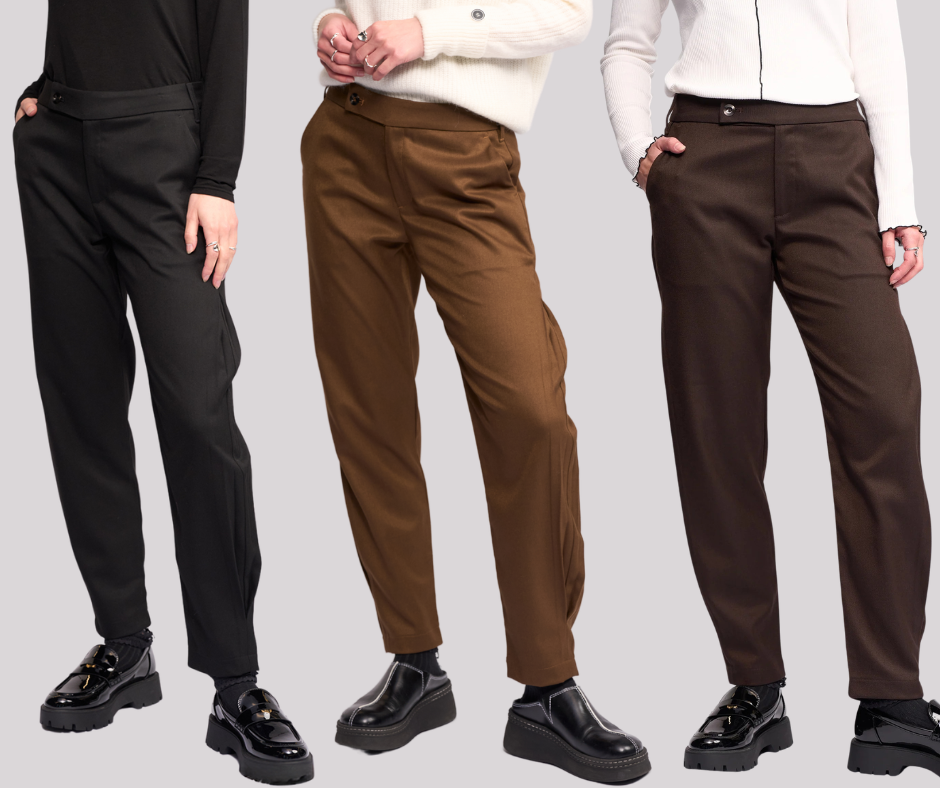 Relaxed-leg ankle-grazer pant available in Black, Cedar, a rich golden-brown hue, and Chocolate, a deep brown tone. Designed with an inverted pleat running along the side seams, this style features front angled pockets and an off-centre waistband closure with a buttoned tab, creating a clean, modern finish.