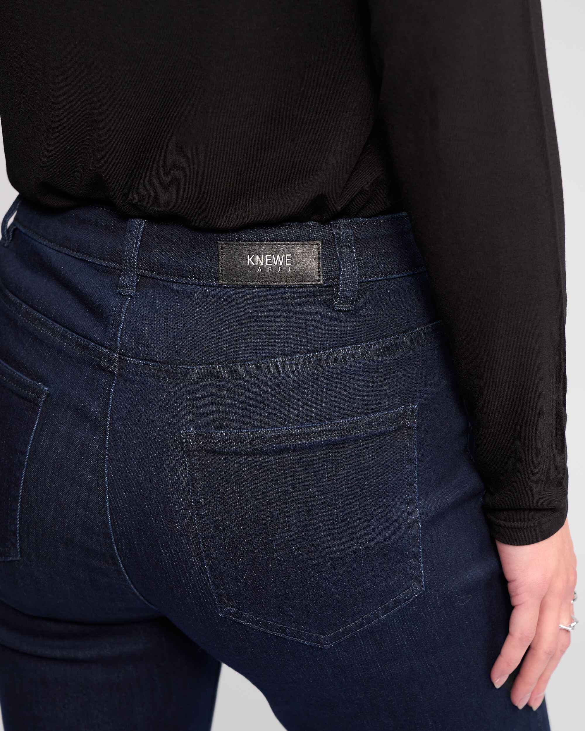• Leather 'KNEWE' brand patch on wearers back right-hand side waistband