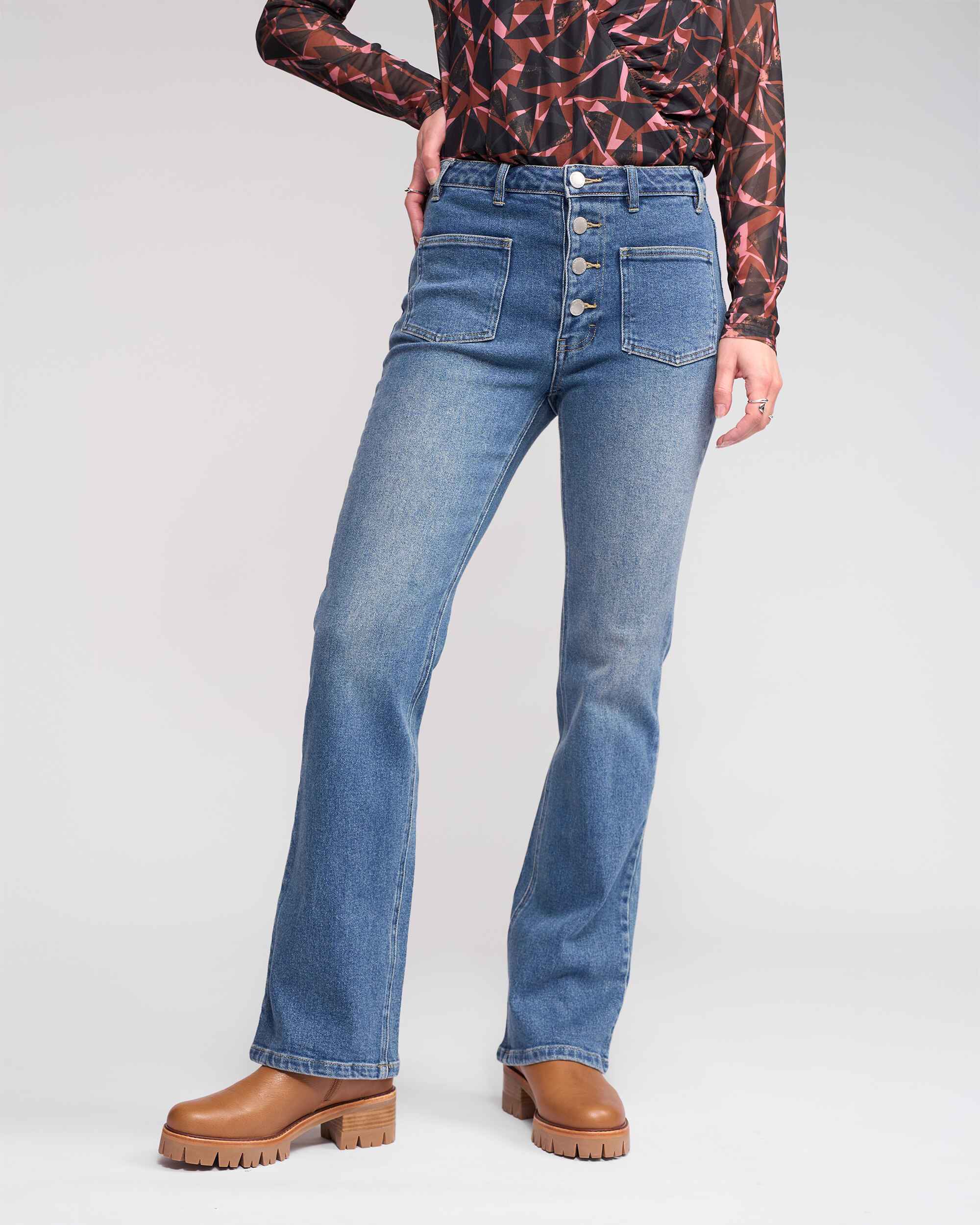 Full-length bootcut jean in Vintage Denim, a softly worn mid-blue wash with a lived-in feel. Cut from stretch denim for a comfortable, flattering fit.