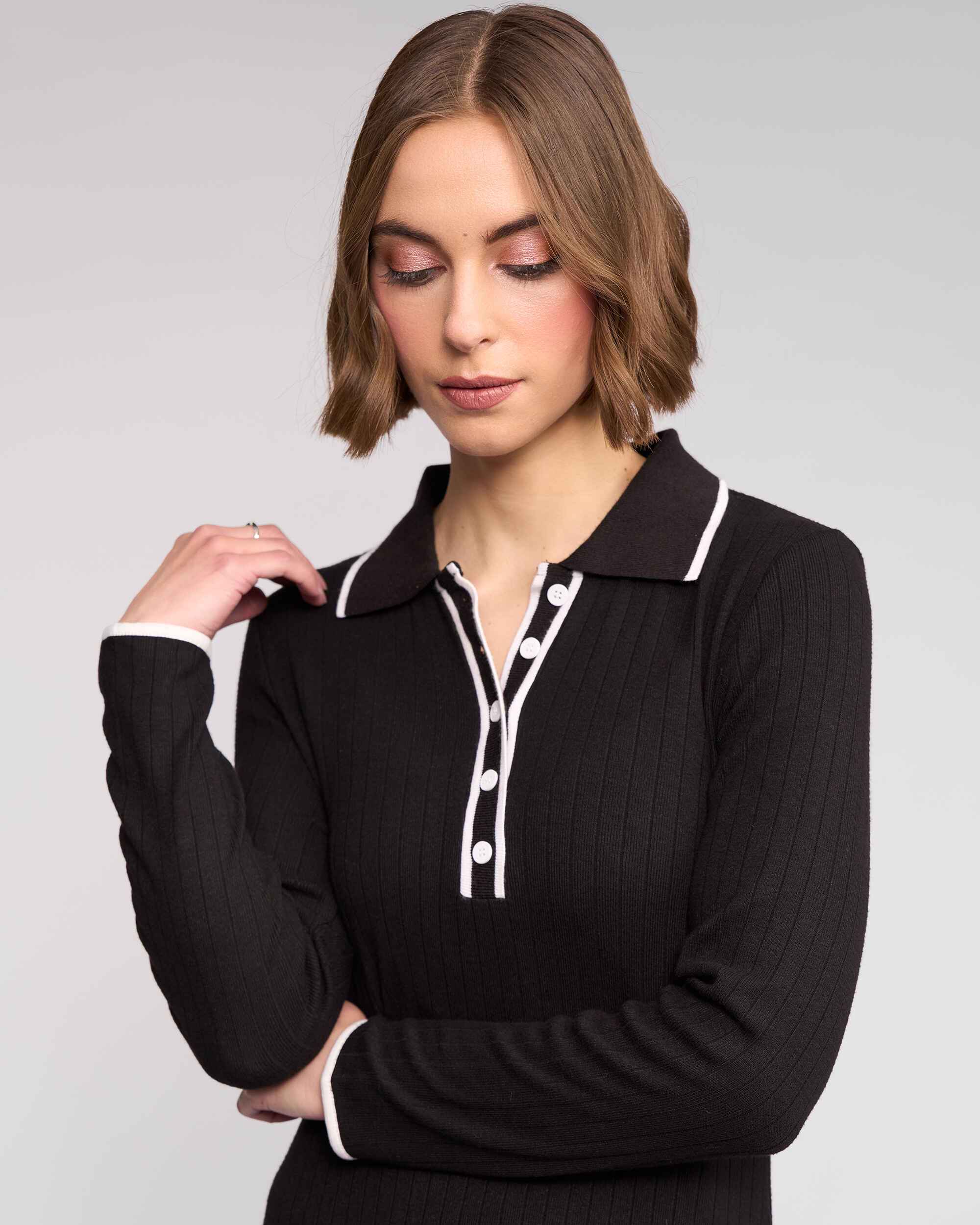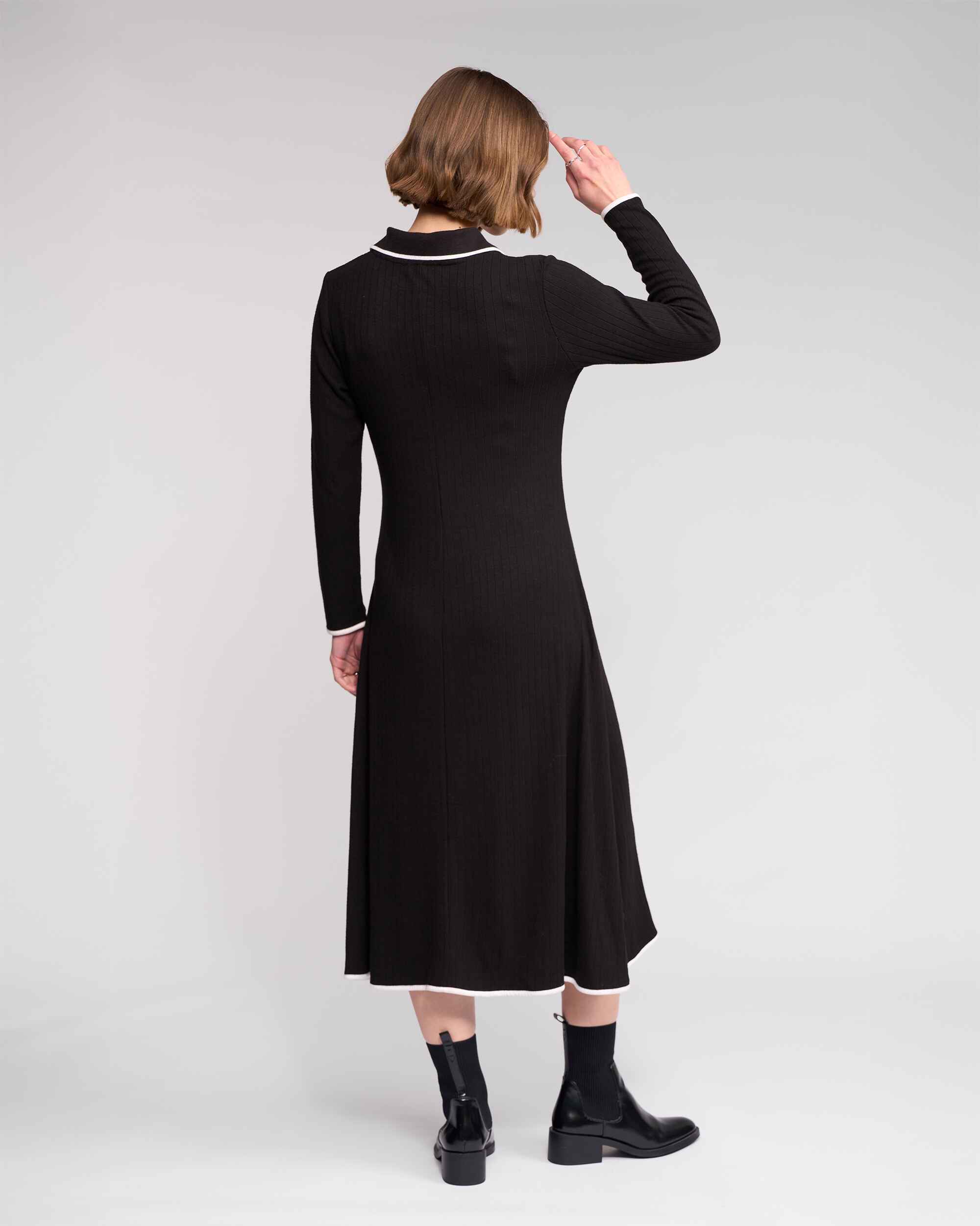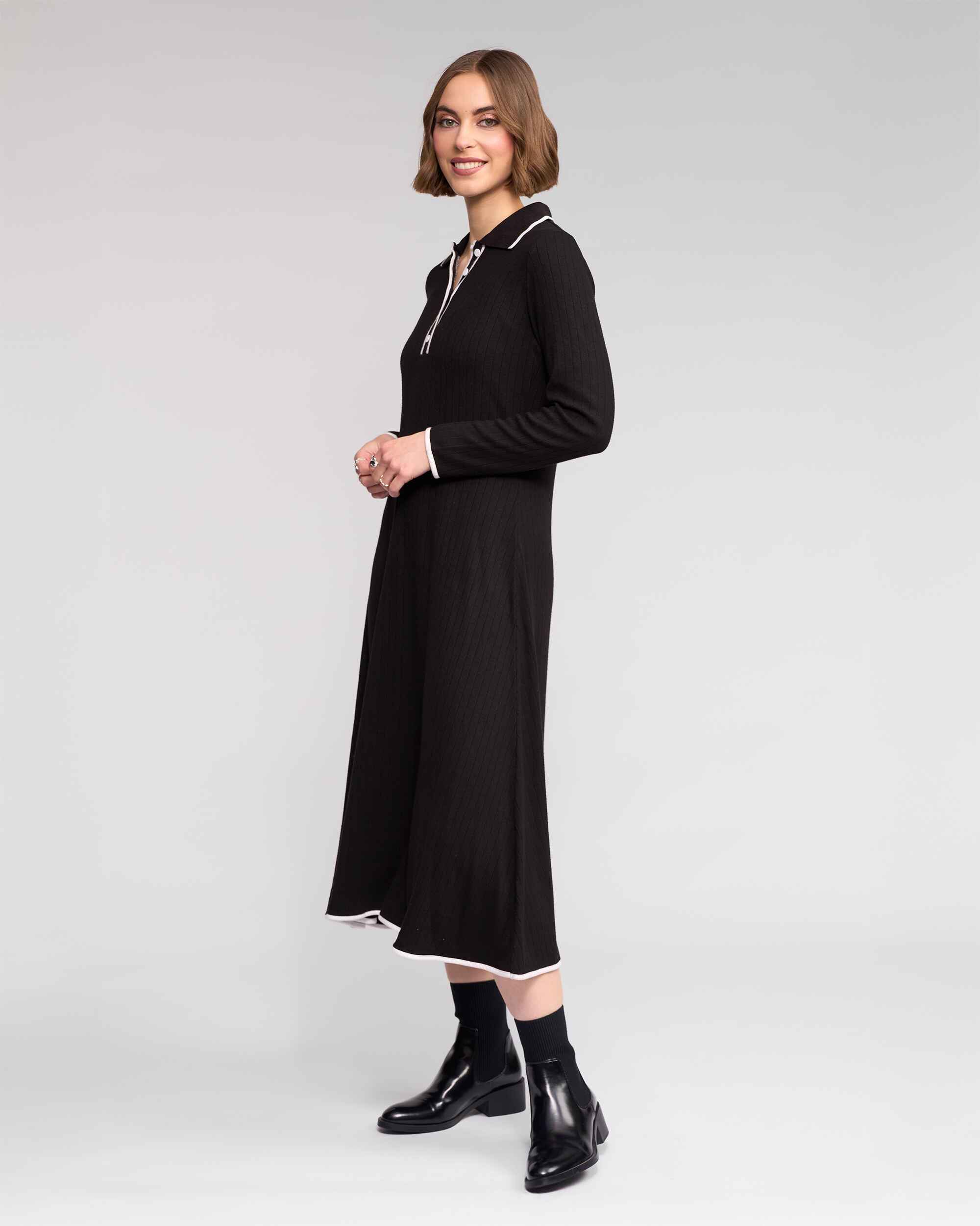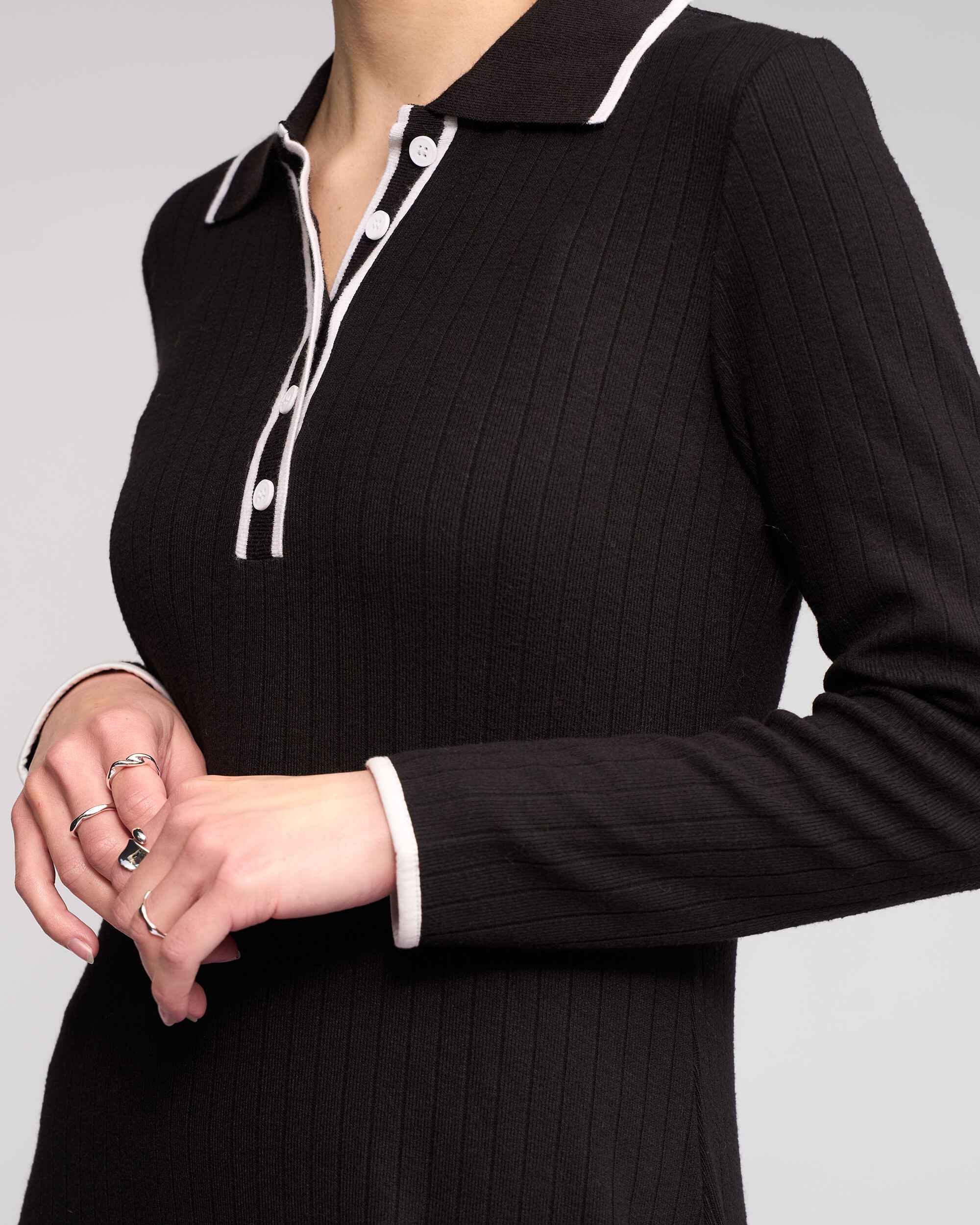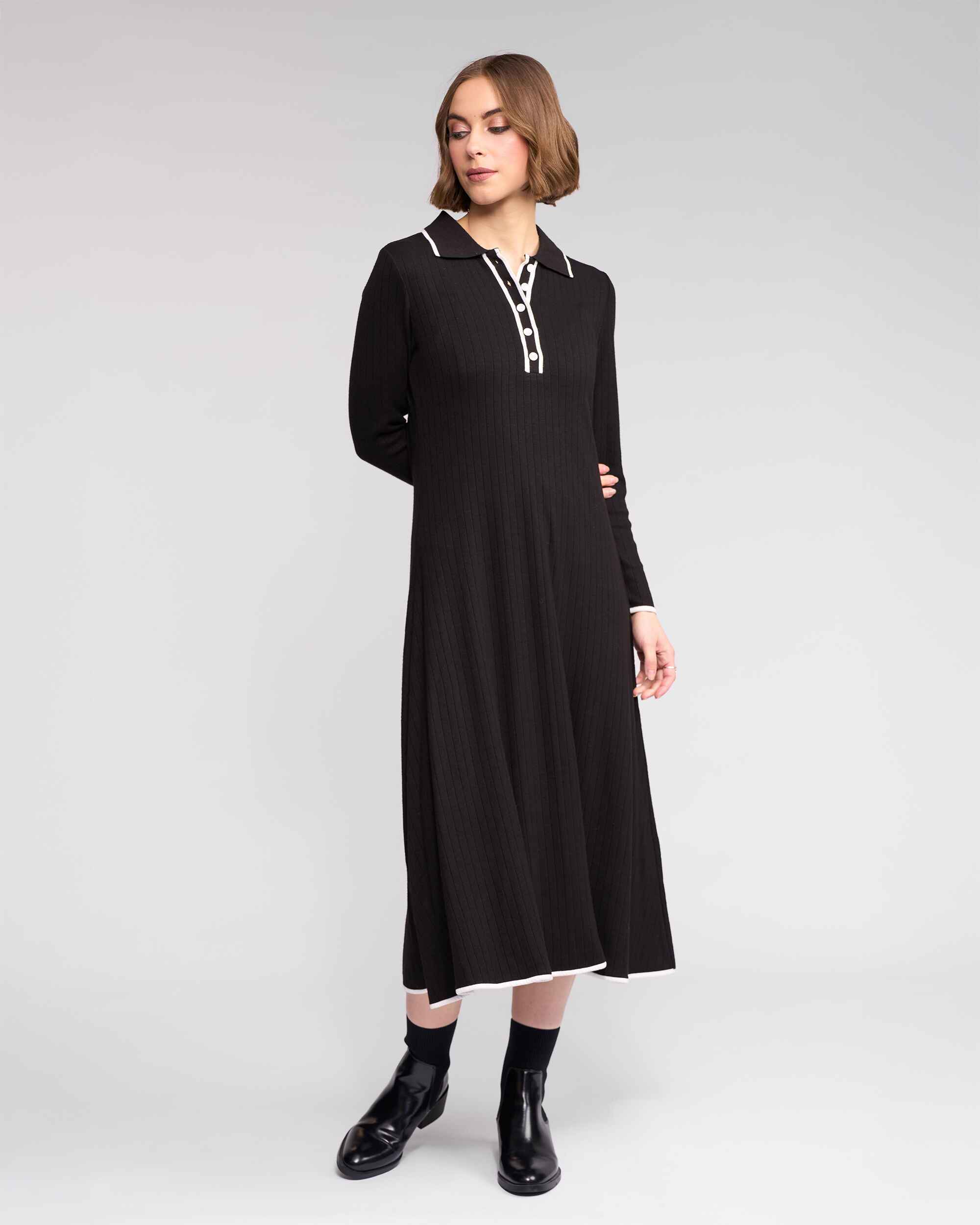 Long sleeve black ribbed knit dress designed in a fine, stretchy winter-weight knit for warmth and comfort. Featuring a shirt-style collar with a short button placket and contrast white detailing. Finished with vertical ribbing to elongate the body.