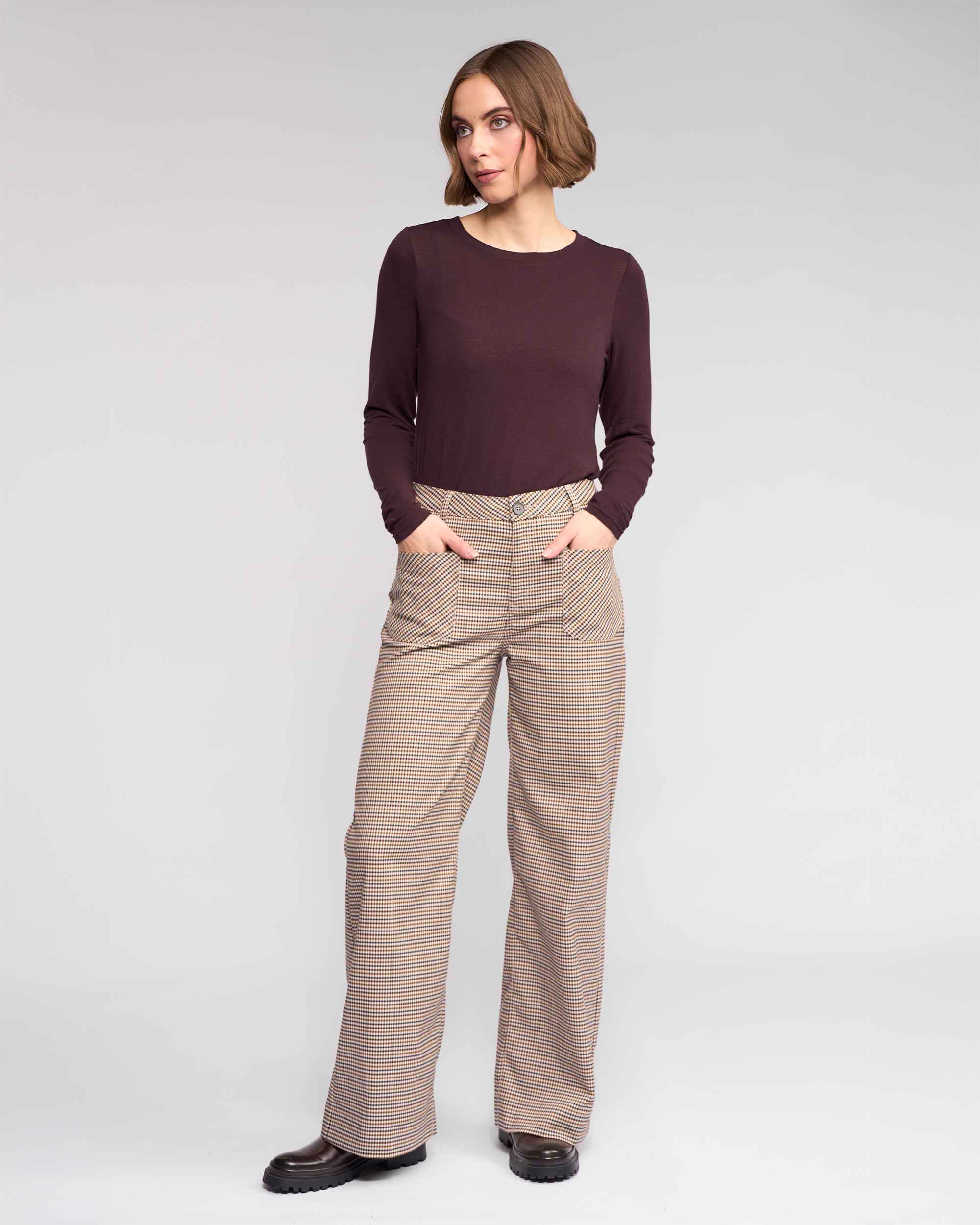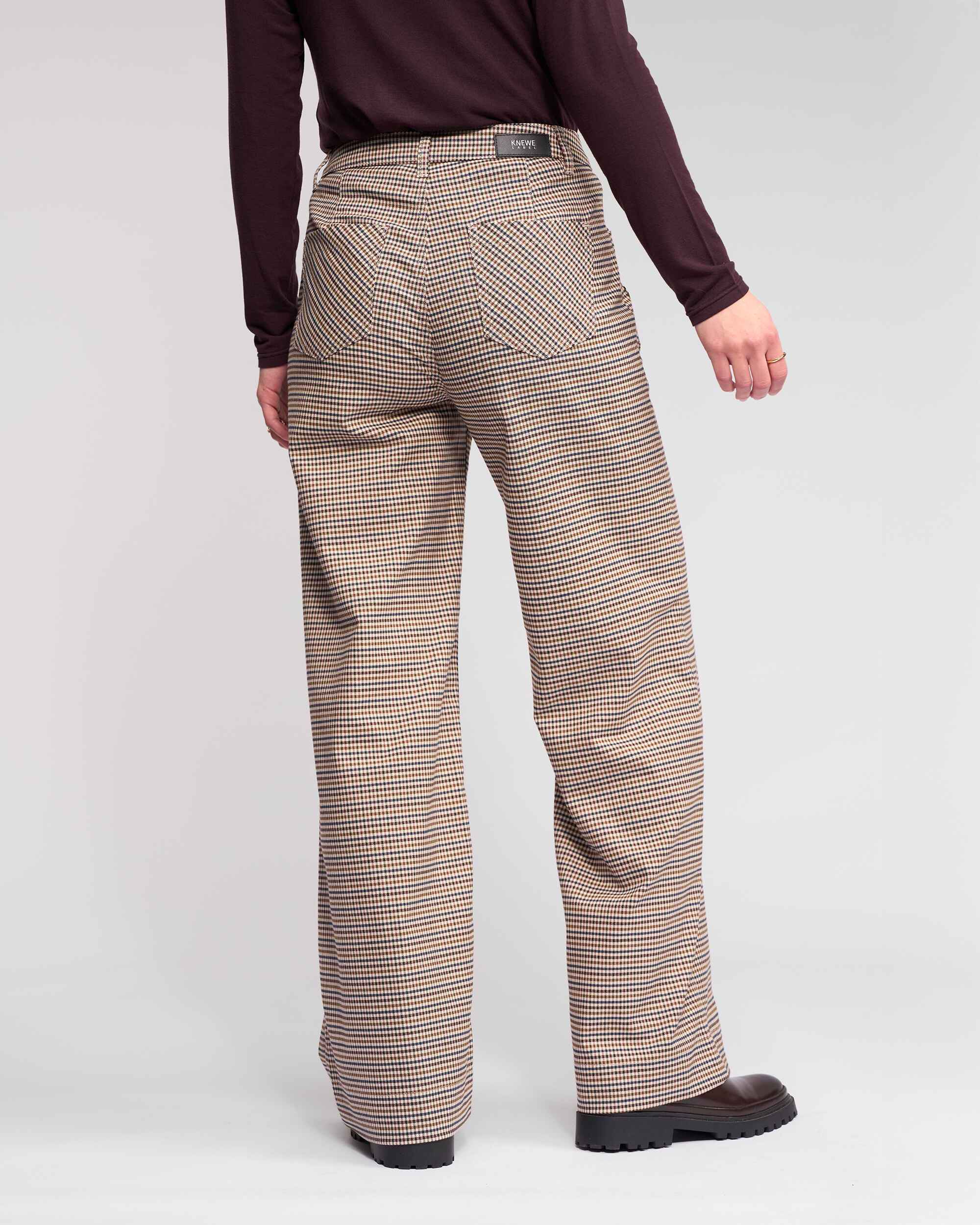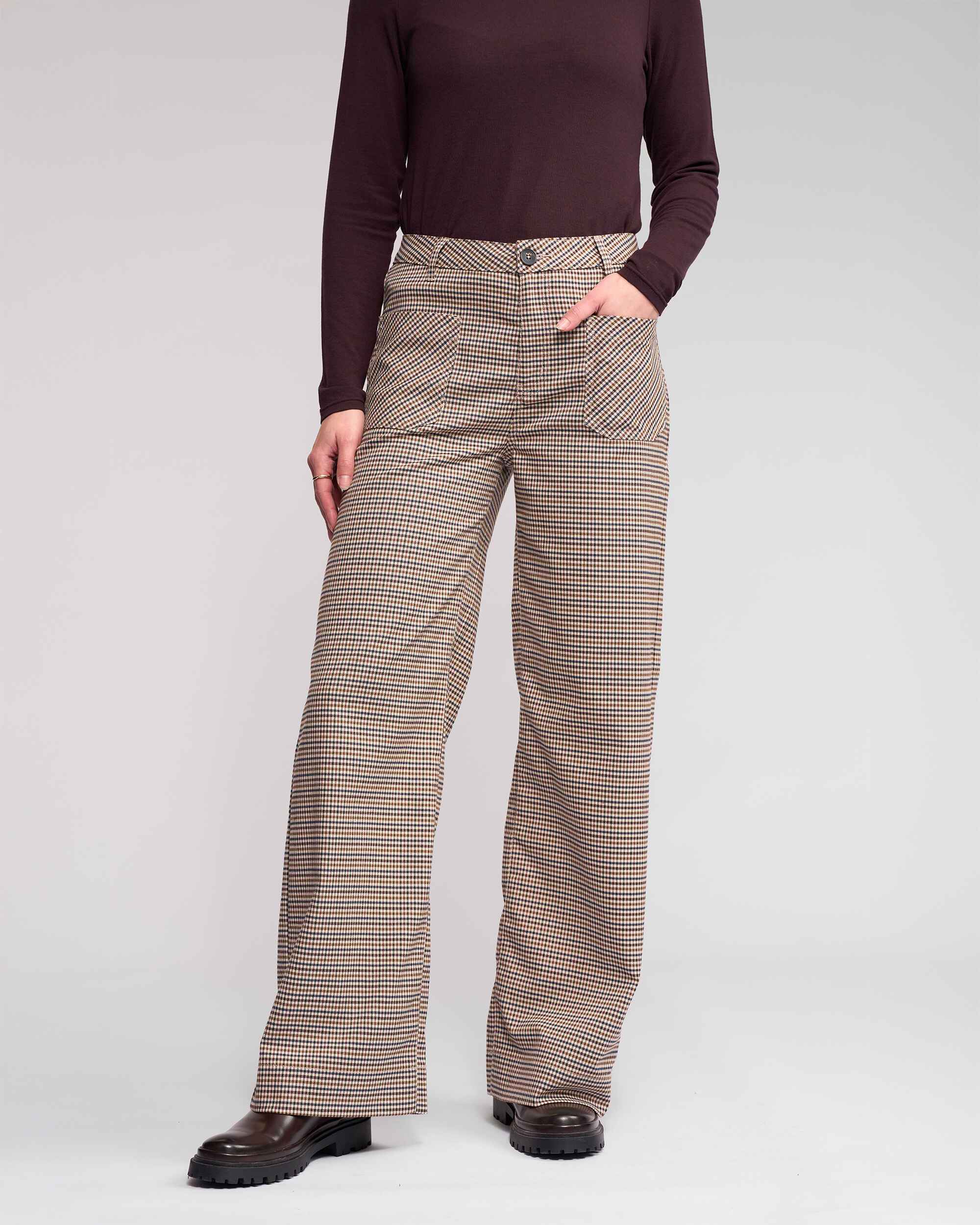 Full-length wide-leg pant in the Paige pattern, featuring a cream base with a checked pattern in cedar, blue, raisin, and brown. Designed with front and back patch pockets, this style offers a relaxed silhouette with a classic, tailored finish.