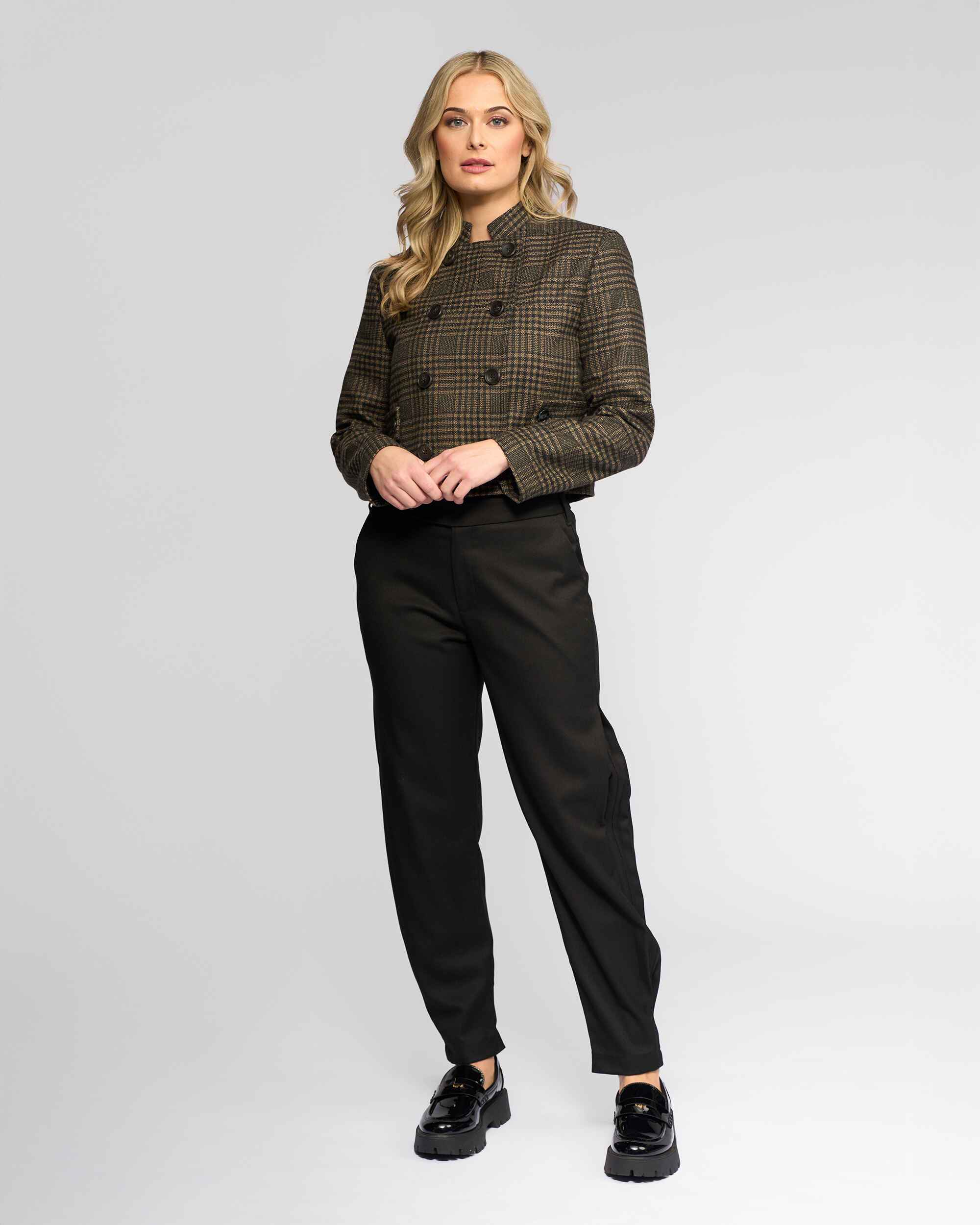 A cropped, fully lined jacket in our Check fabric, made from warm winter-weight material. Designed with a short stand collar and subtle shoulder shaping, this style features eight black marbled buttons down the front, with one set of four used for closure to create a clean, streamlined finish.