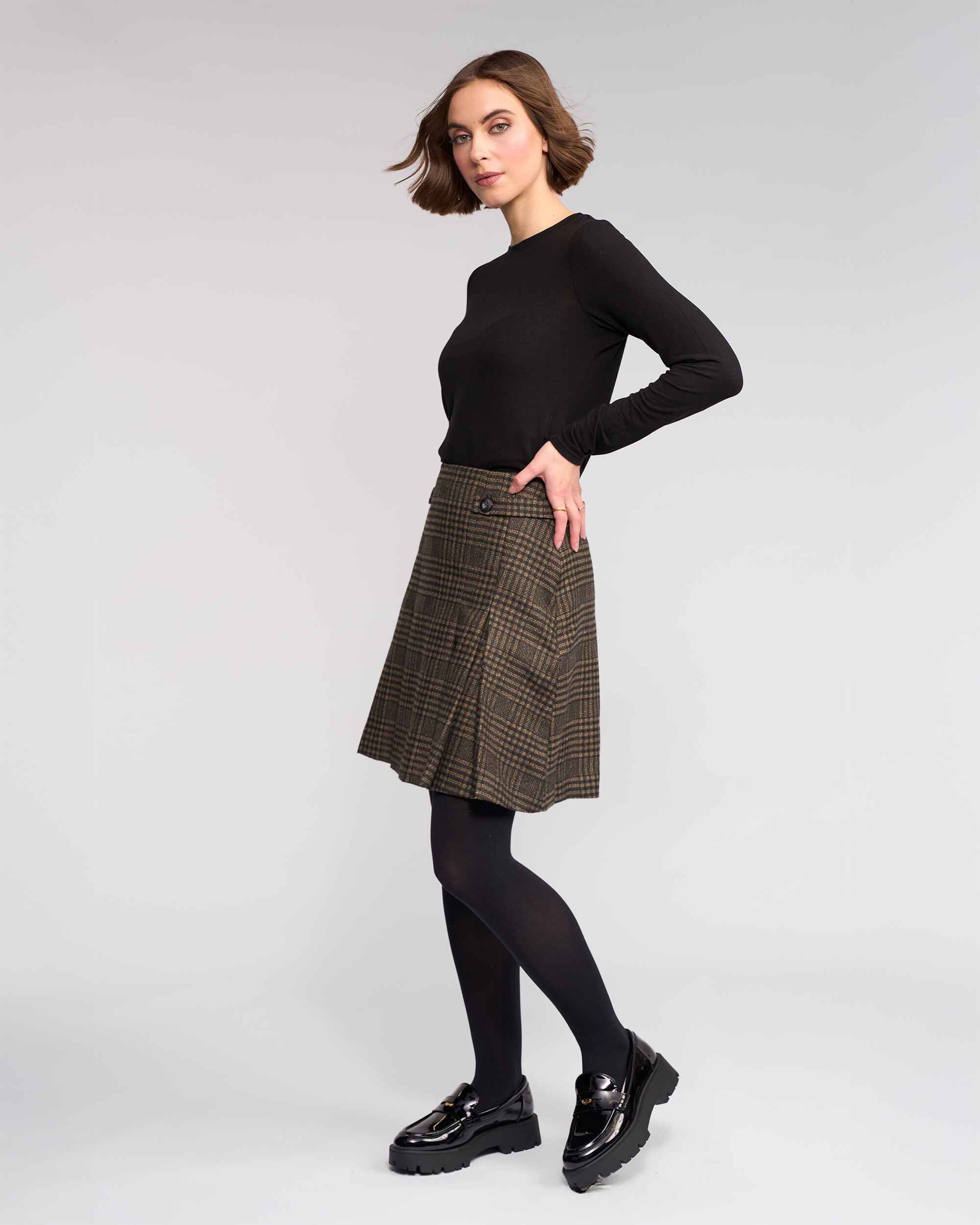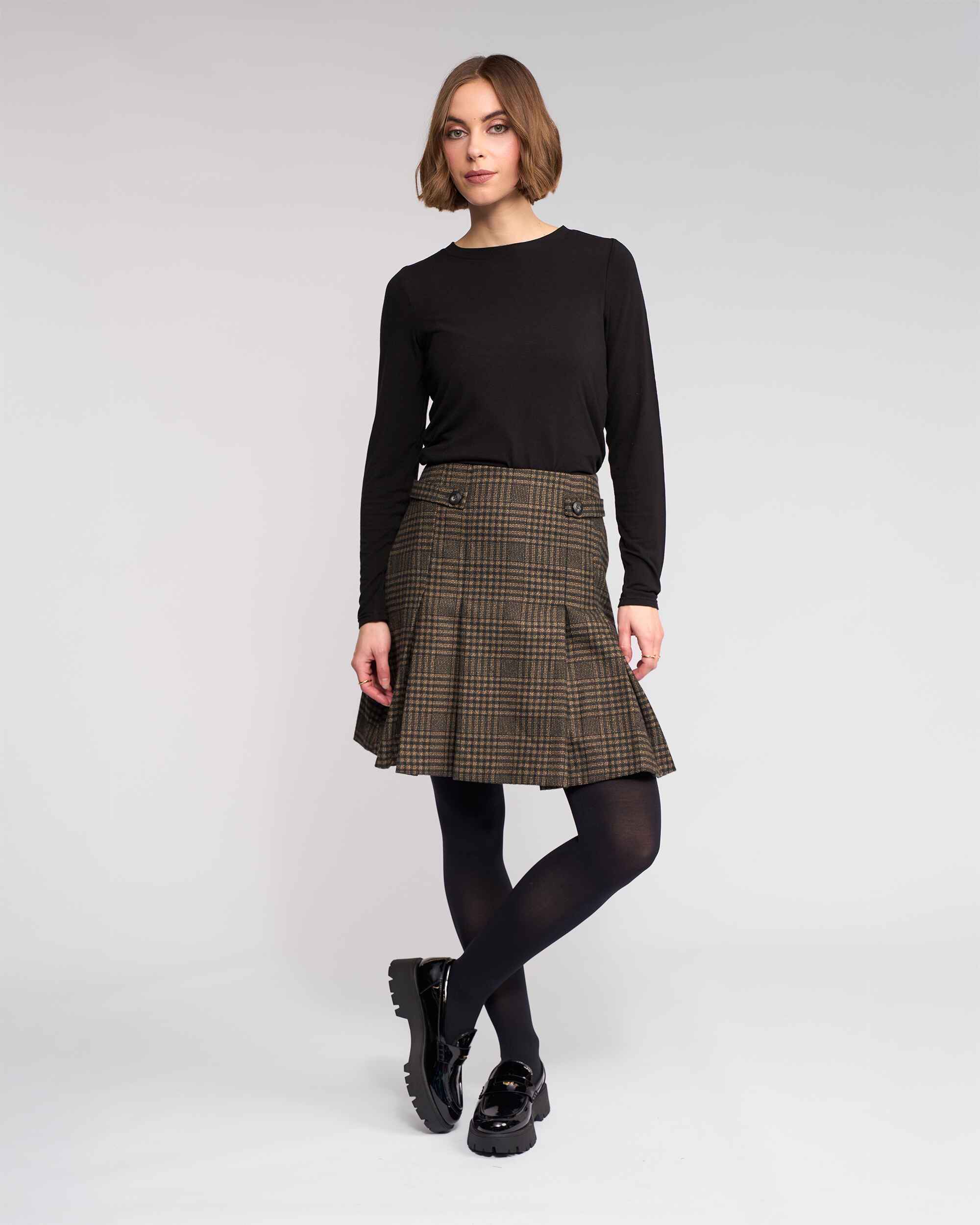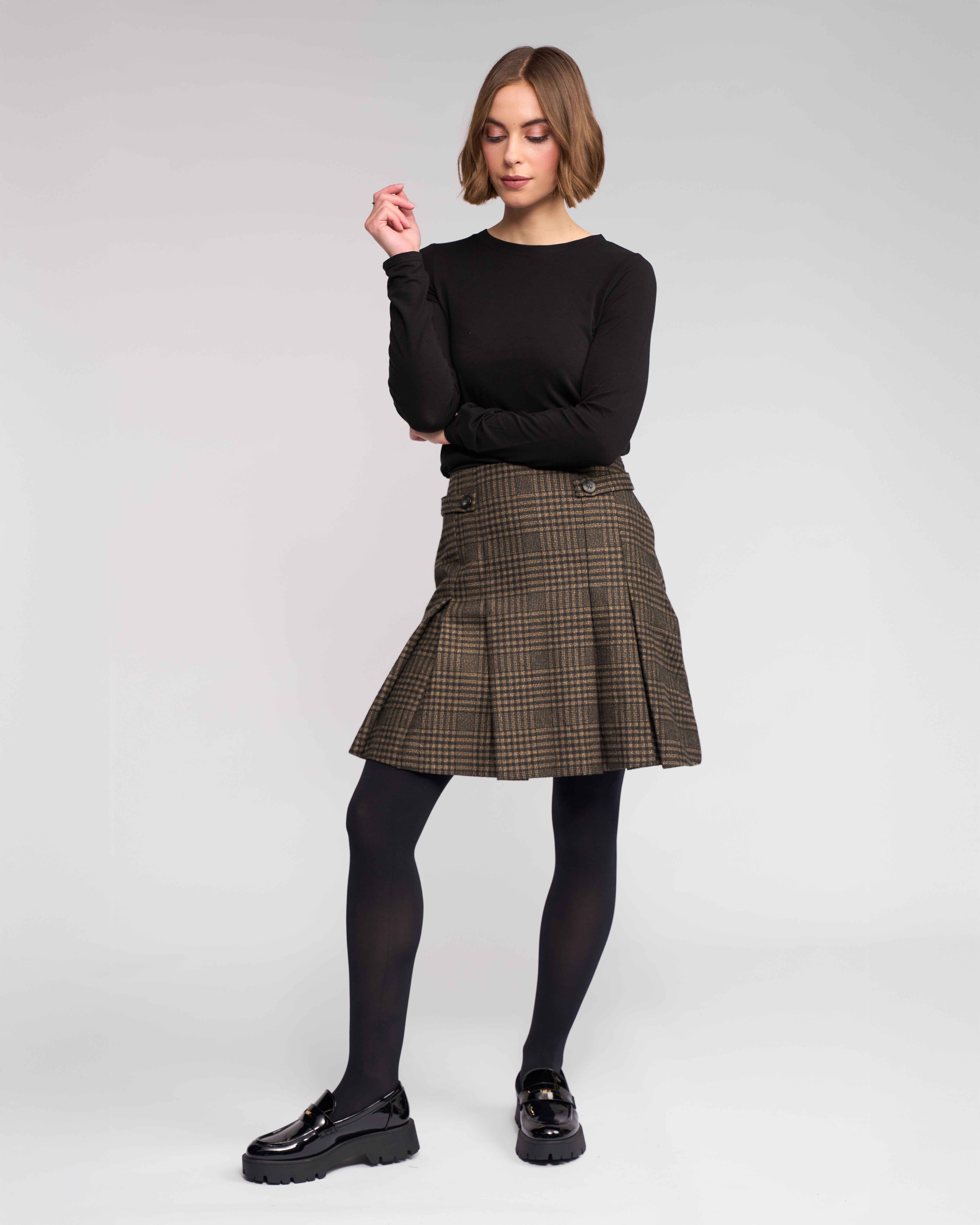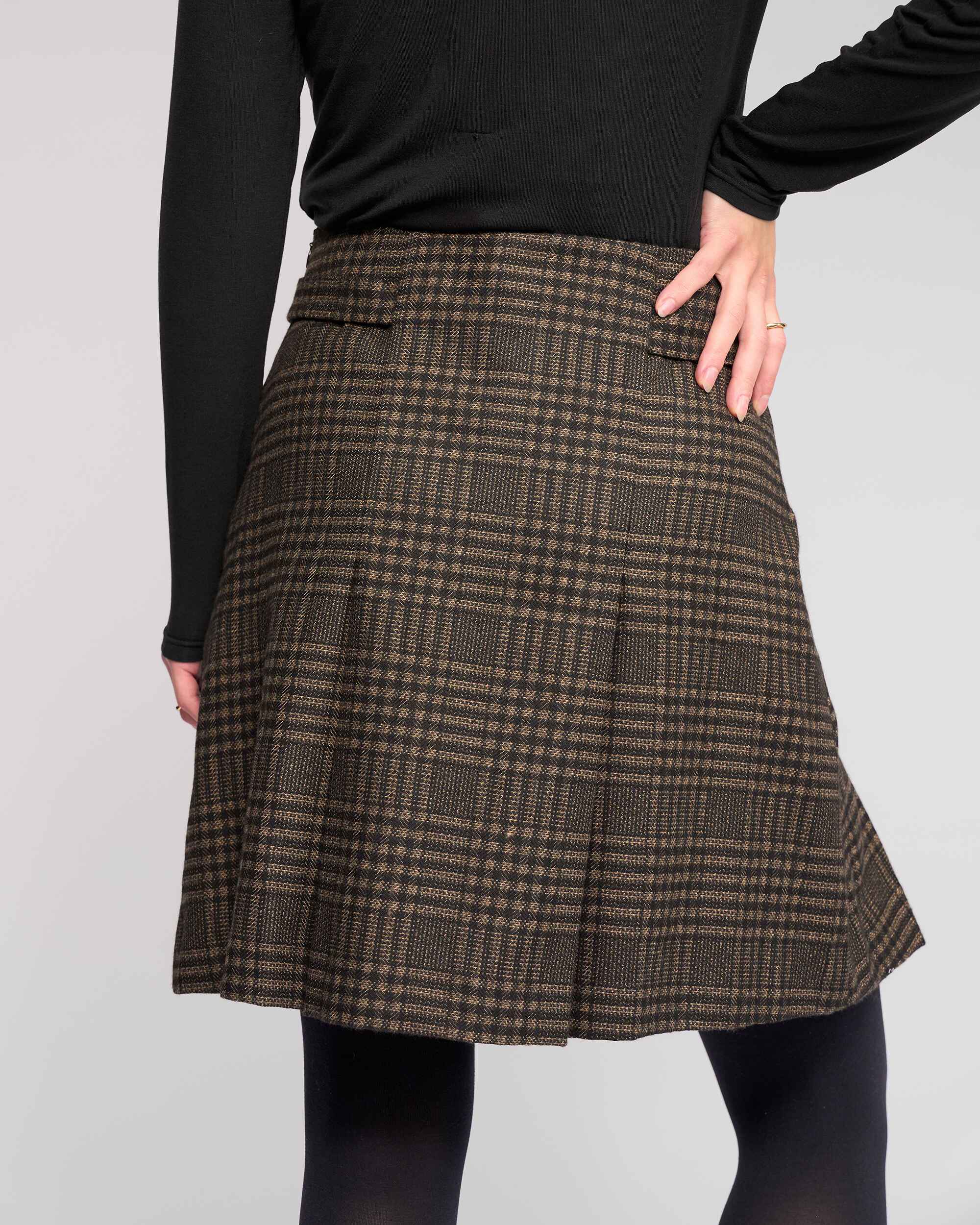 Short pleated skirt in the Check pattern — a black and oat check pattern inspired by classic checks — crafted from thick winter weight fabric. Featuring a flat front panel that buttons closed on each side of the waistband.