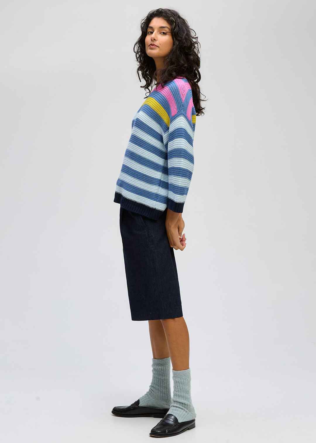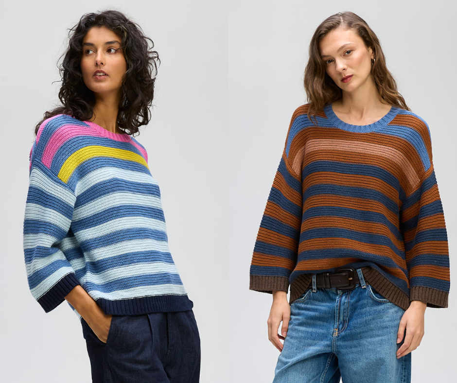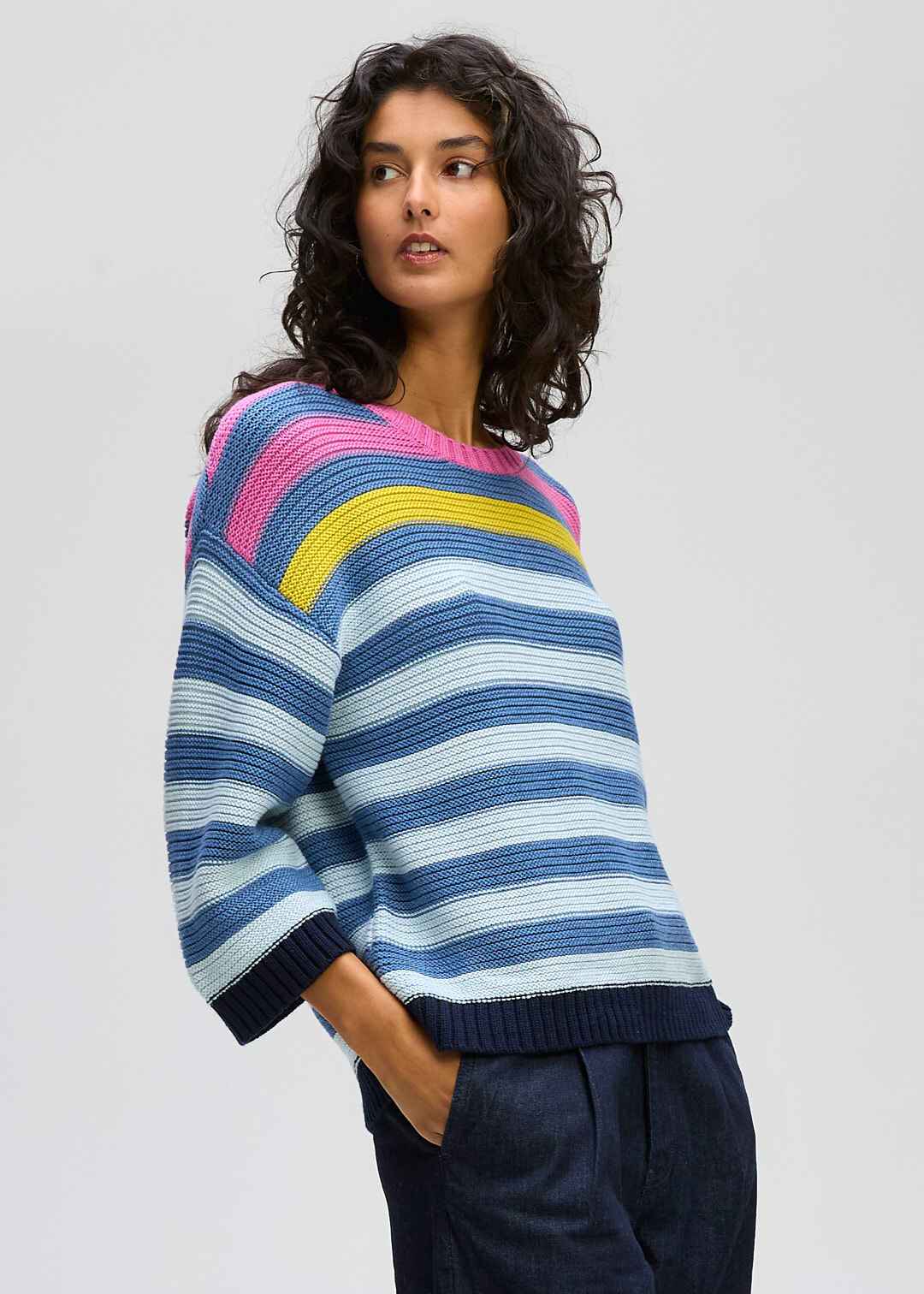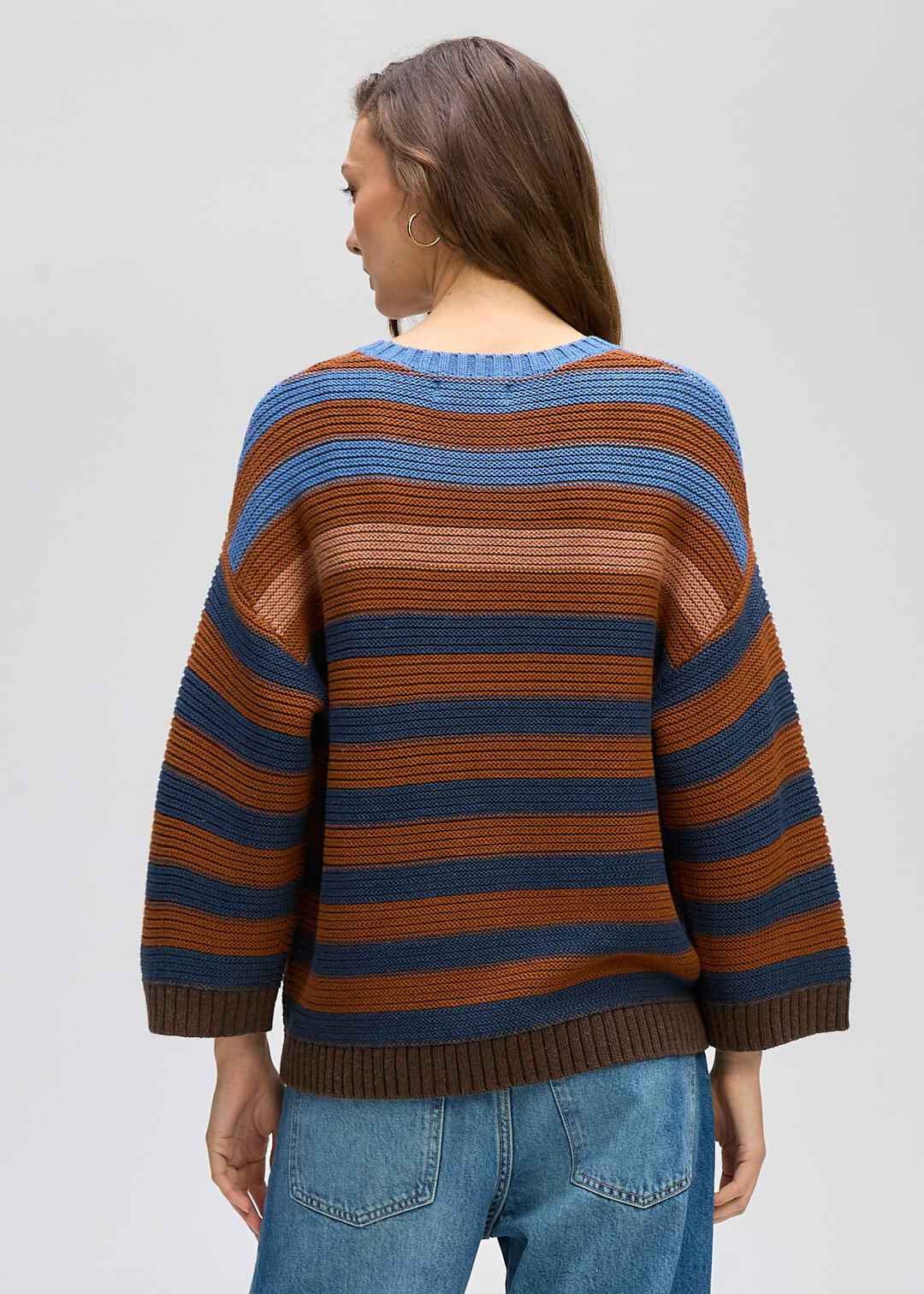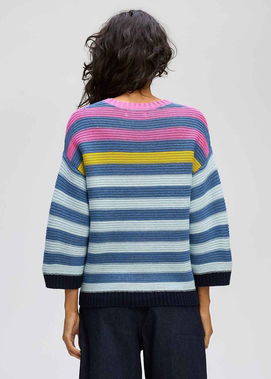 A bold update to your everyday knitwear. This relaxed-fit sweater features eye-catching horizontal stripes and a soft, textured finish for all-day comfort. Designed with a classic crew neckline and easy three-quarter sleeves, it offers a laid-back silhouette that pairs effortlessly with denim or tailored trousers. Available in vibrant multi-tone and warm earthy stripe combinations.
